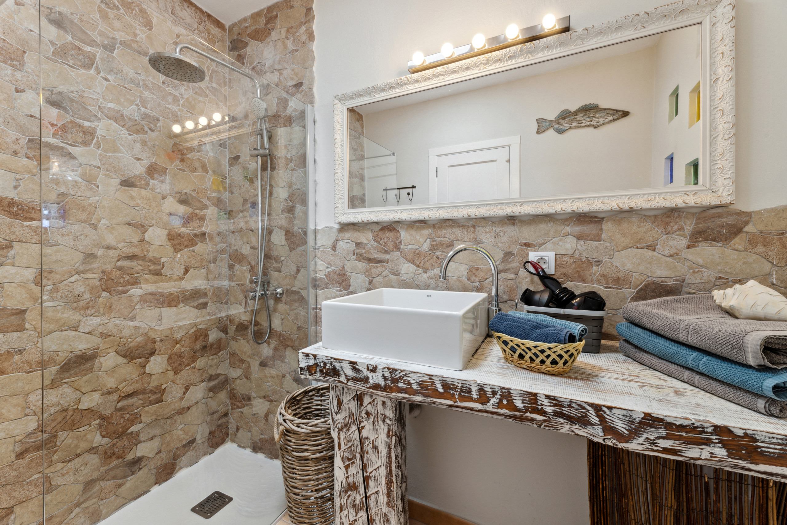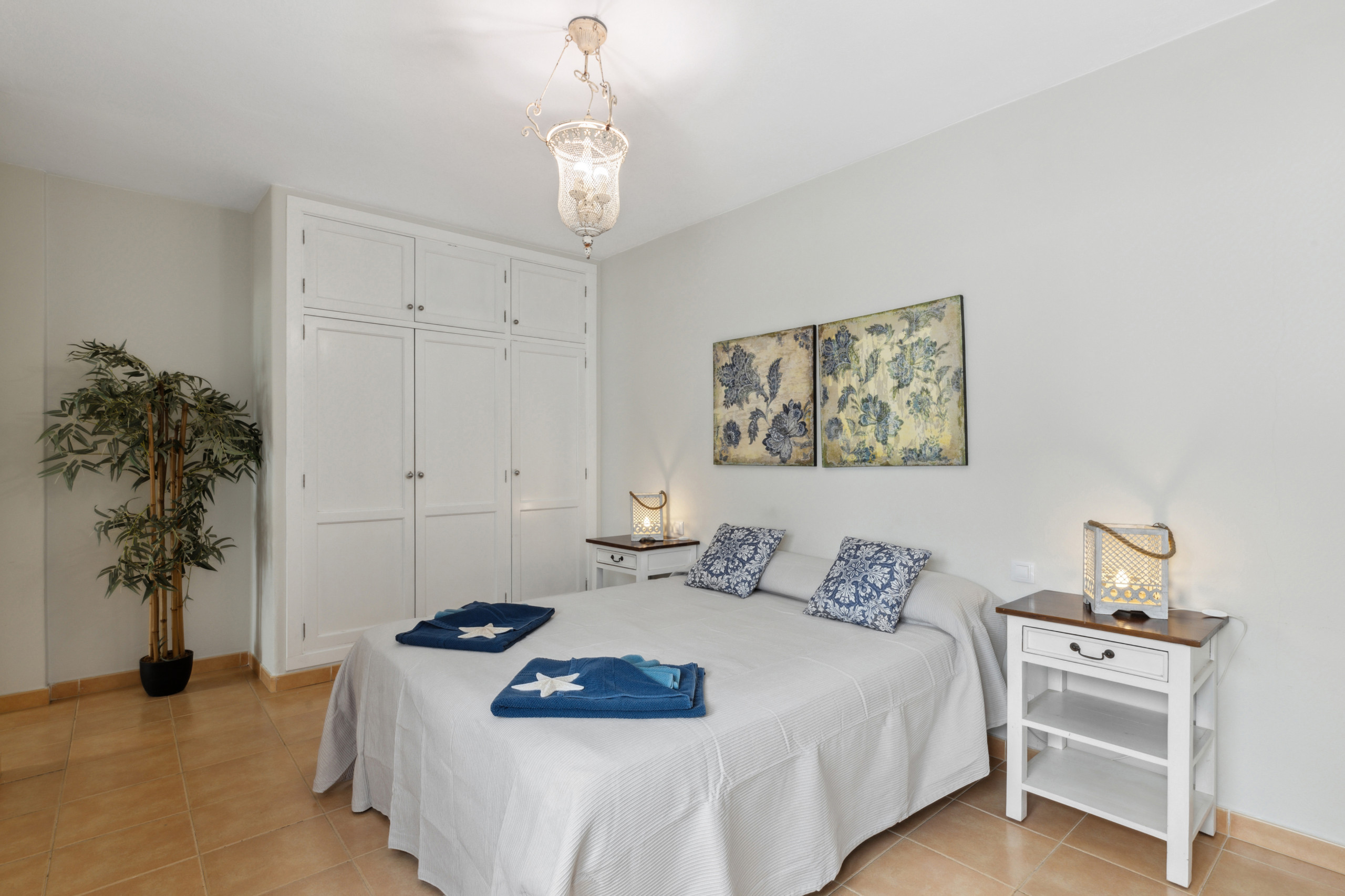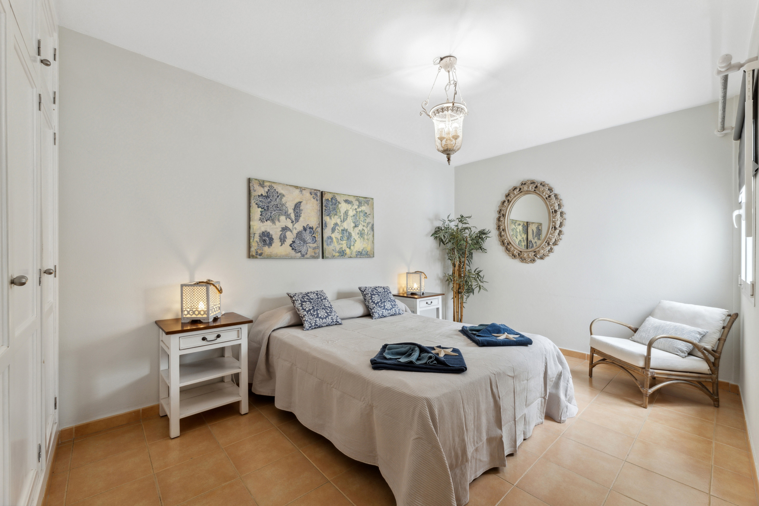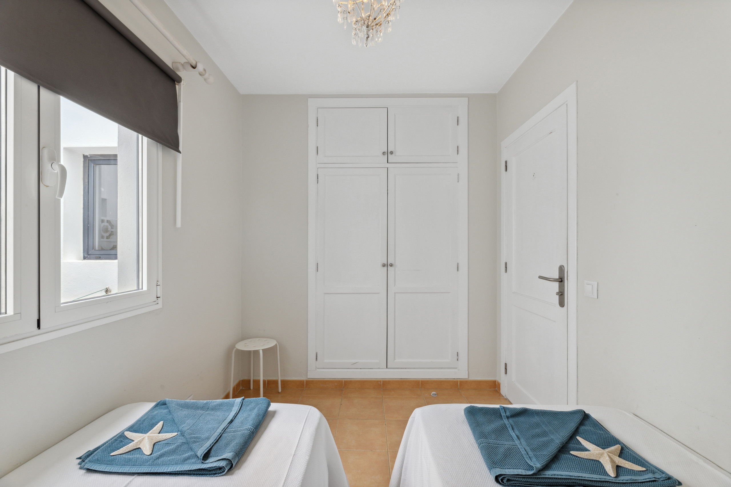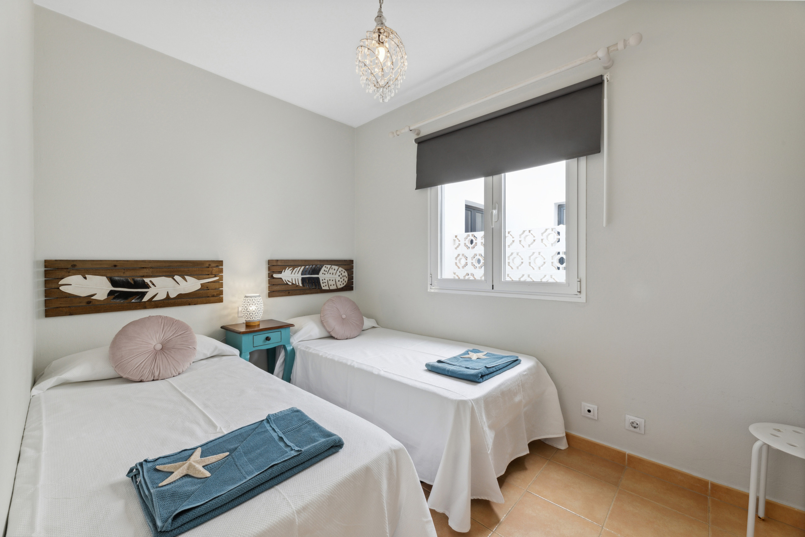 El apartamento cuenta con dos dormitorios bien distribuidos: un dormitorio principal con cama matrimonial y otro con dos camas individuales, garantizando un descanso cómodo para todos los huéspedes. Dispone de un único cuarto de baño con ducha, completamente equipado para tu comodidad.