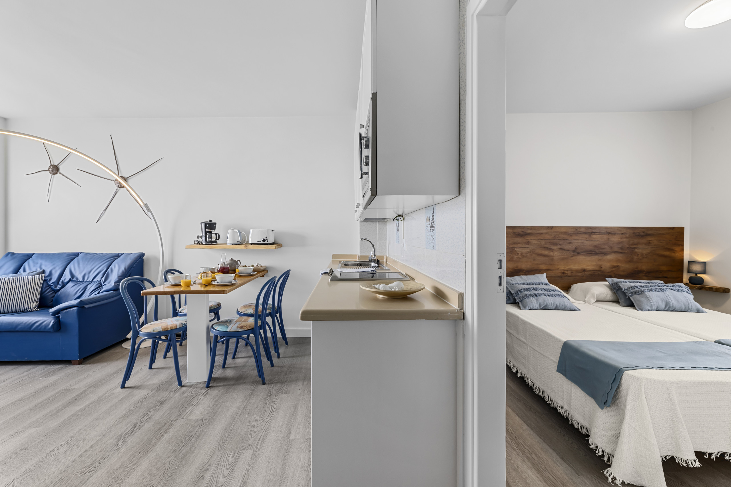 El apartamento cuenta con una habitación equipada con dos camas individuales, ideal para amigos o parejas que prefieren dormir separados. Dispone de un baño completo con ducha, lo que garantiza comodidad y privacidad durante tu estancia. La cocina, aunque pequeña, está bien equipada con nevera, microondas, tostadora, hervidor y menaje básico, permitiéndote preparar comidas sencillas.