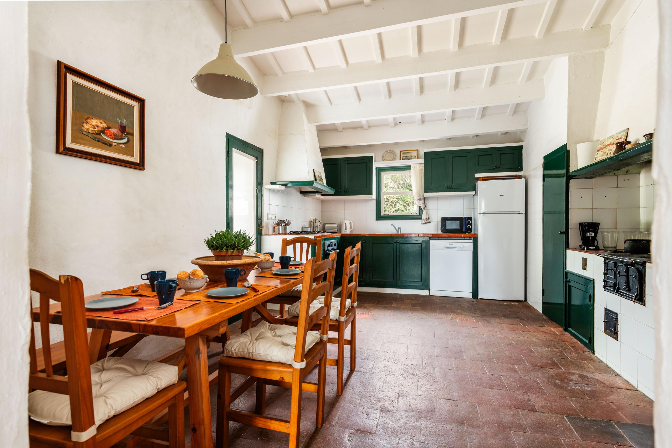 Cocina independiente con electrodomésticos ( lavaplatos incluido) y mesa y sillas .