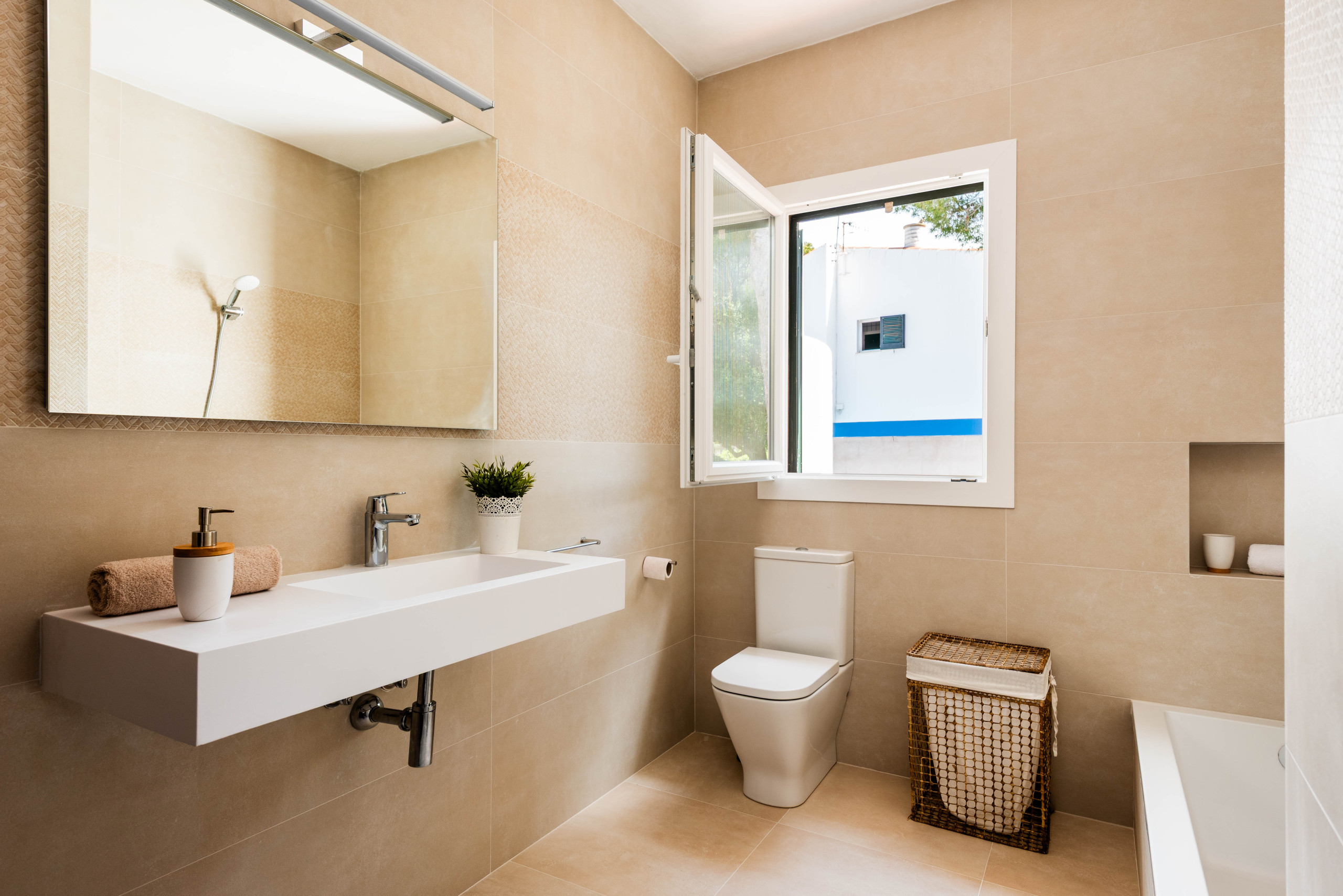 La villa se distribuye en una sola planta y ofrece un interior cómodo y funcional. Dispone de tres habitaciones dobles, todas con aire acondicionado: una de ellas con cama de matrimonio y baño en suite, y las otras dos con camas individuales. Además, cuenta con un segundo baño completo con bañera.