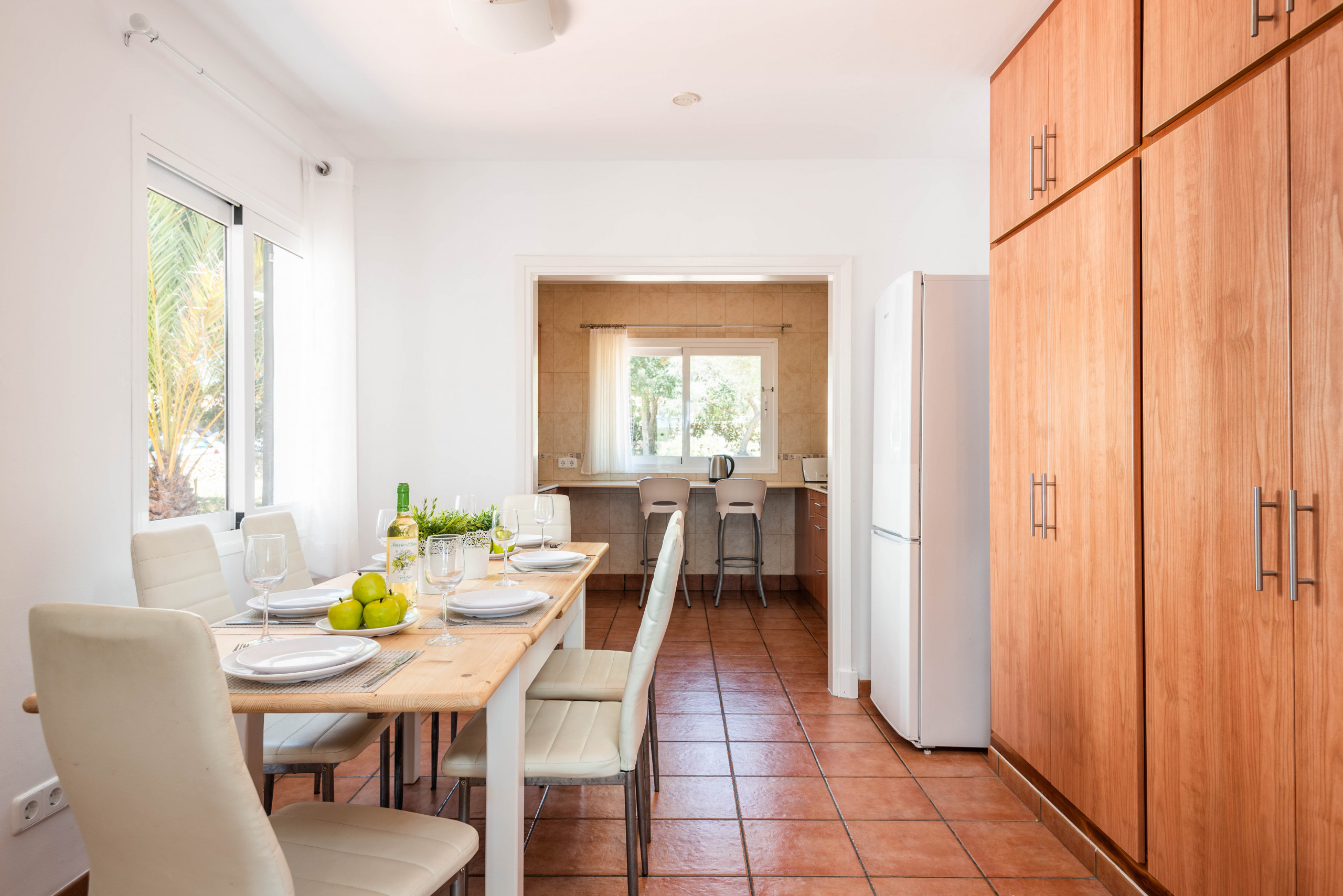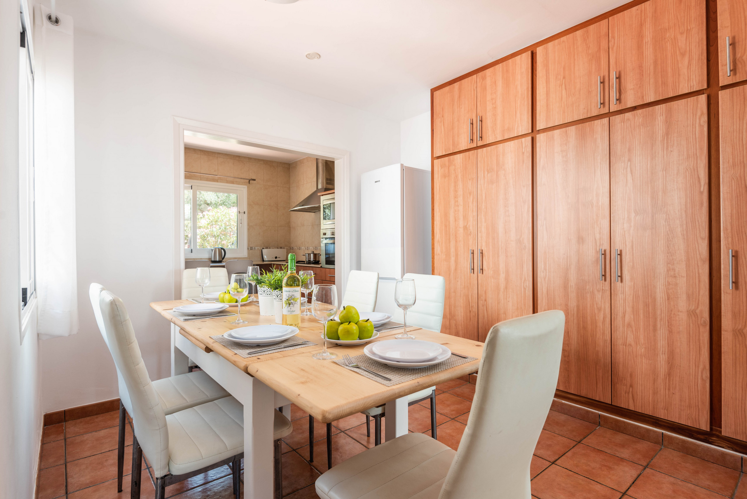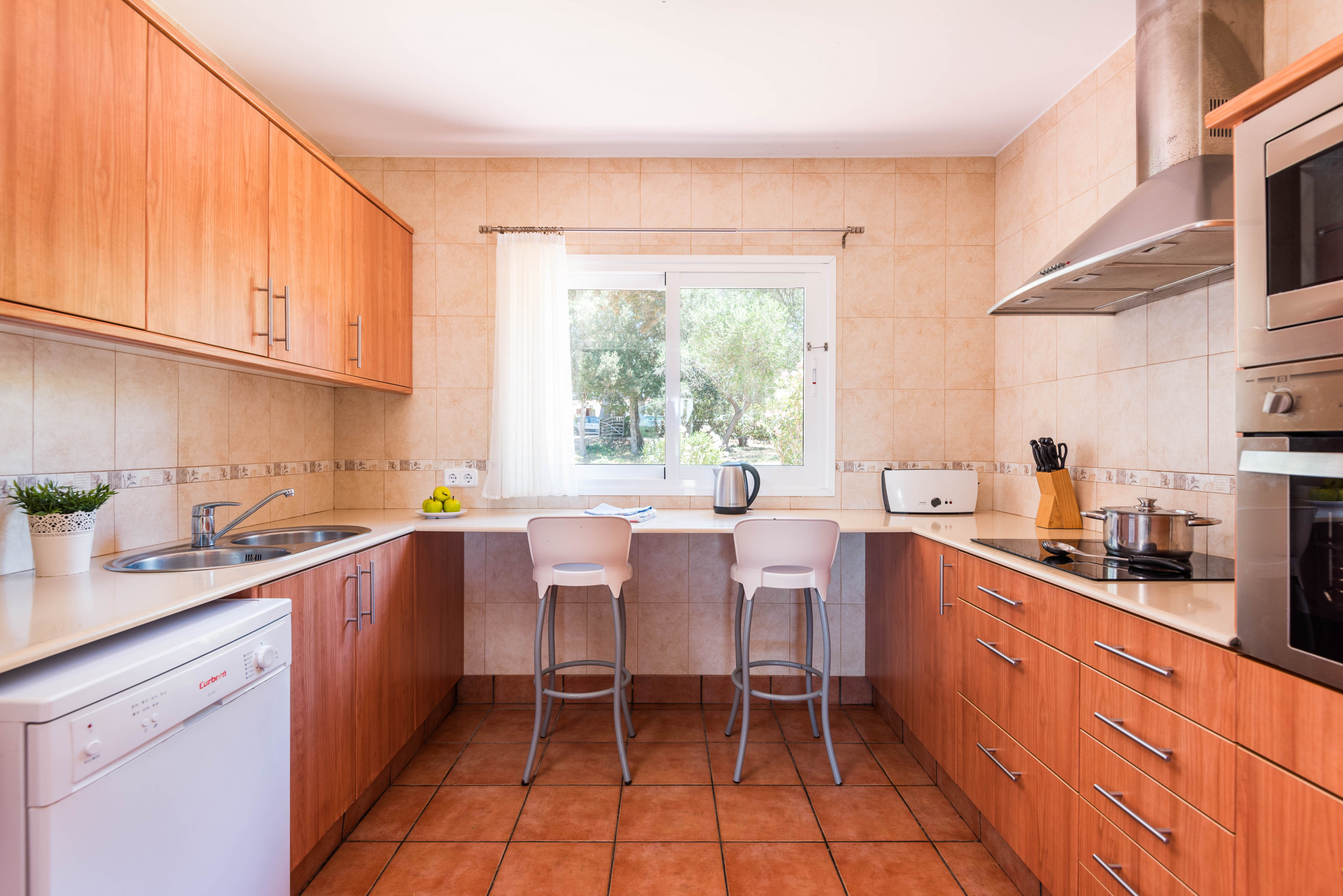 Cocina totalmente equipada con nevera, horno eléctrico, vitrocerámica, microondas, tostadora, kettle, lavaplatos, cafetera de filtro y cafetera de capsulas, lavadero independiente con lavadora, zona office con aire acondicionado con mesa y sillas , gran salón con TV con canales extranjeros, wifi gratuito.