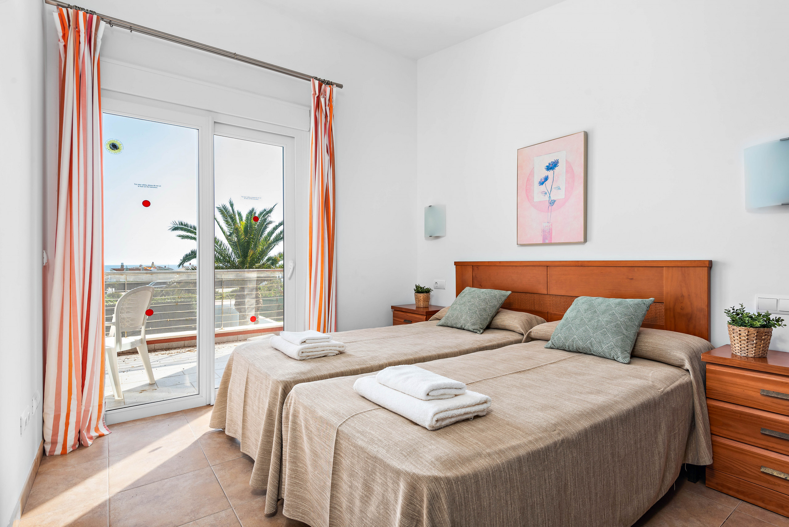 Primera planta: 2 habitaciones con 2 camas individuales, ambos con acceso a un balcón con vistas a la parte trasera del jardín.