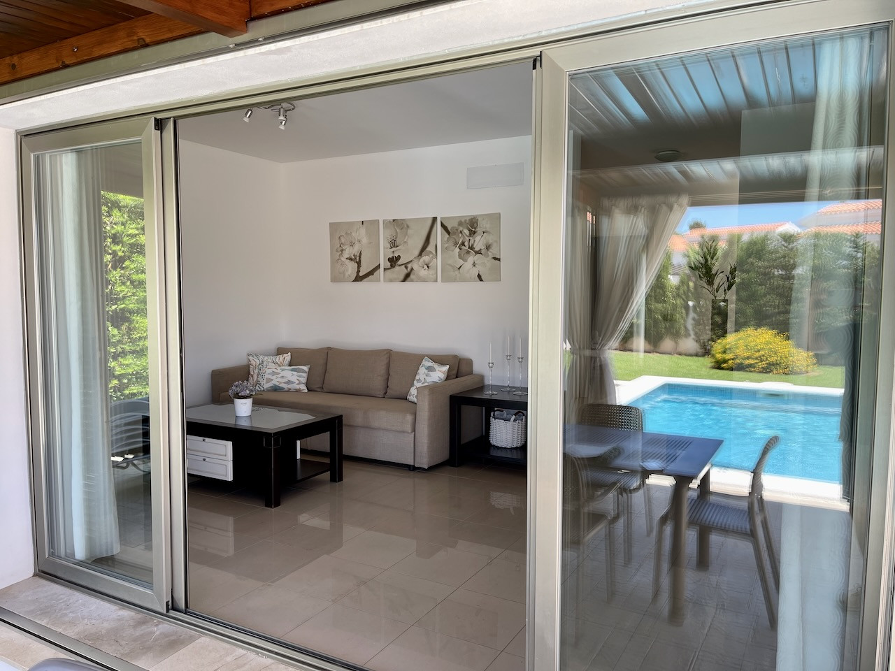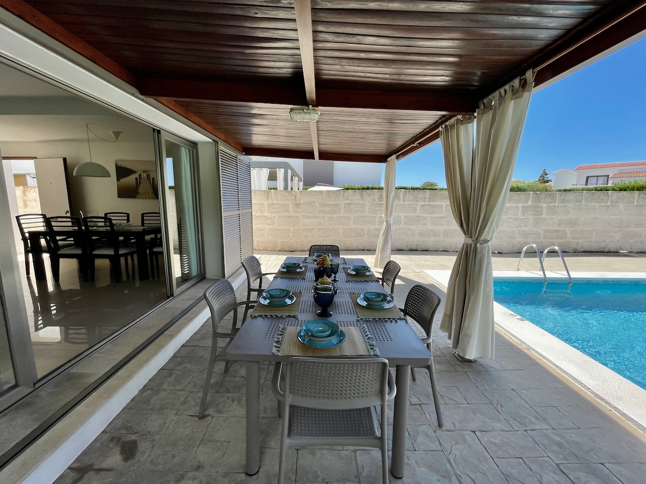 Planta baja: Terraza exterior cubierta con una pérgola de madera y con acceso directo a la piscina.