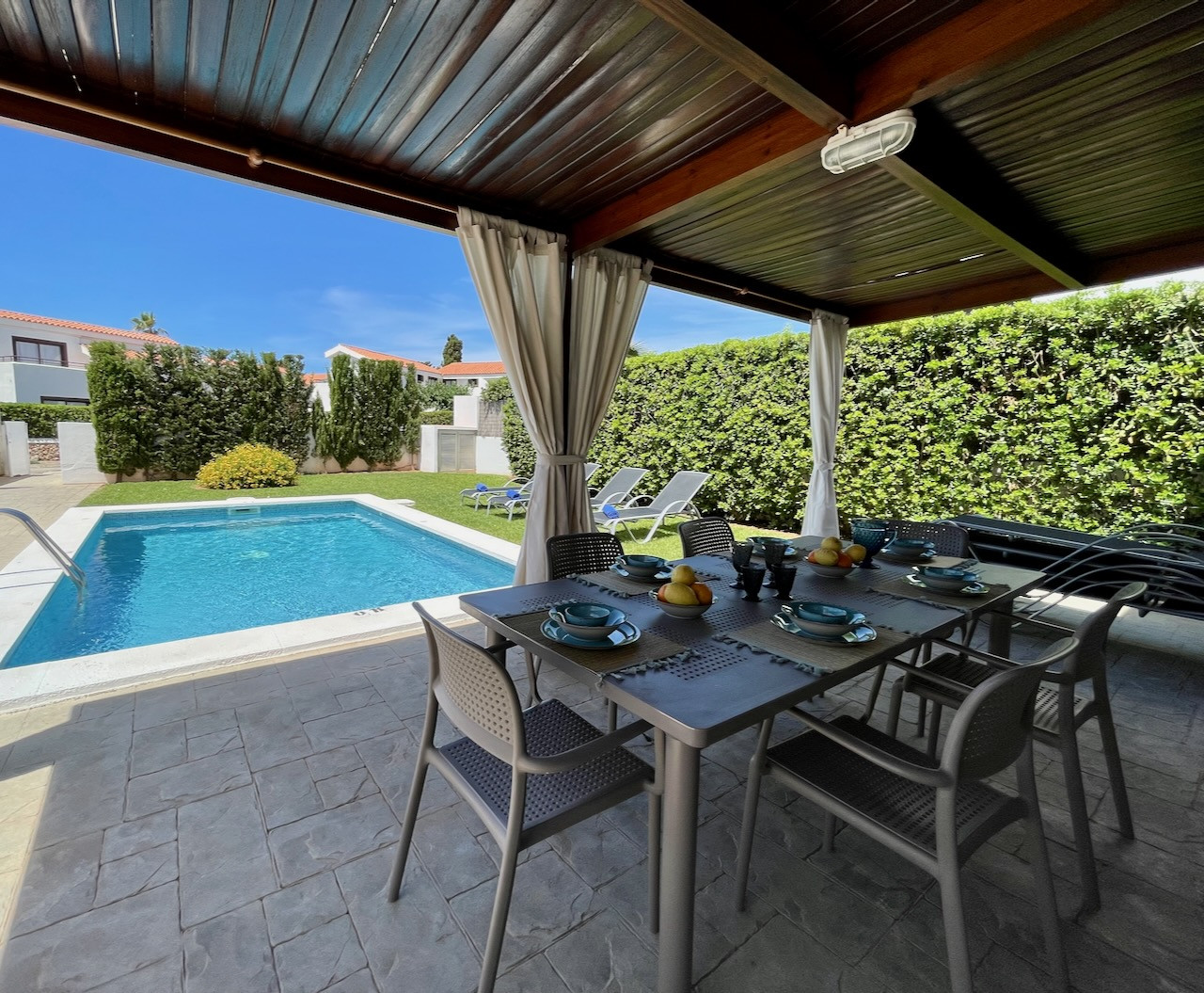 En la zona exterior de la vivienda tenemos un precioso jardín que rodea a la vivienda. En un lateral de la casa nos encontramos con la BBQ de obra. Y al lado de la terraza exterior se encuentra la piscina con 8 hamacas y un set de mesa y sillas.