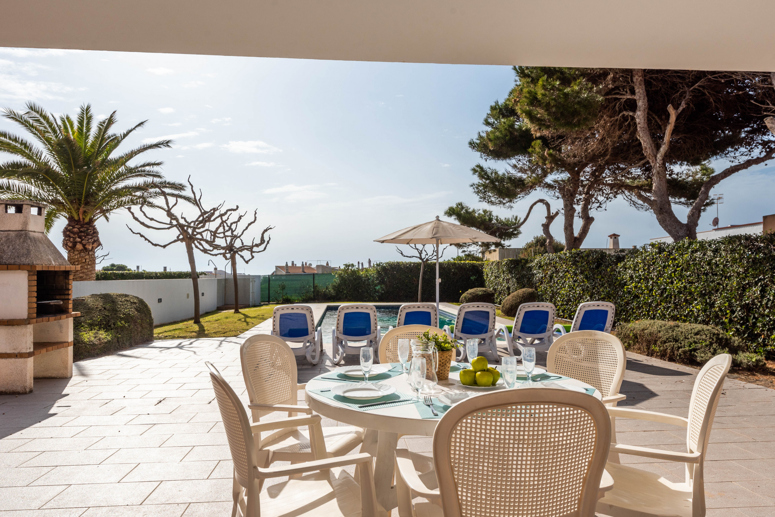 En la zona exterior de la vivienda tenemos un precioso jardín que rodea a la vivienda. En un lateral de la casa nos encontramos con la BBQ de obra. Y al lado de la terraza exterior se encuentra la piscina con 8 hamacas y un set de mesa y sillas.