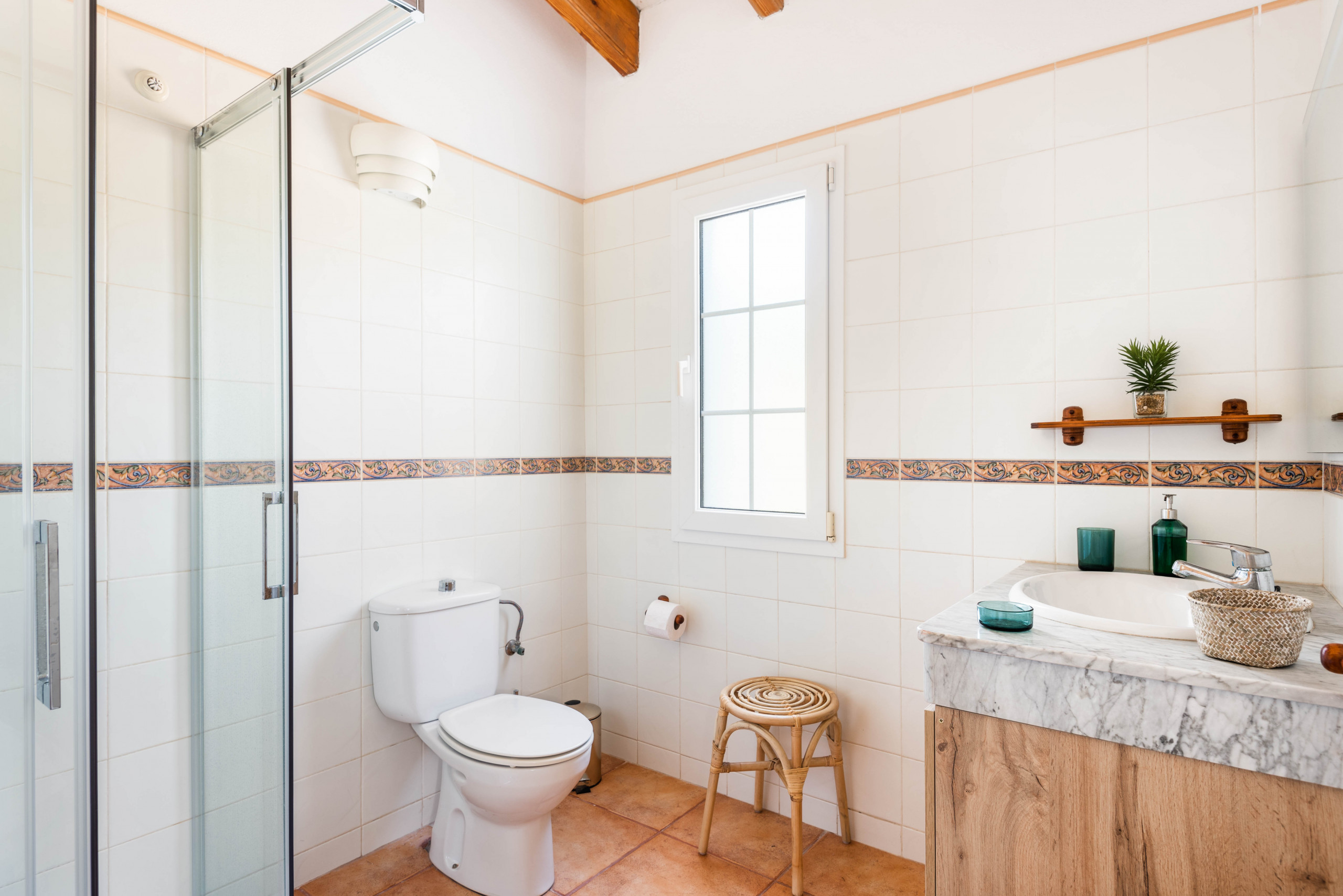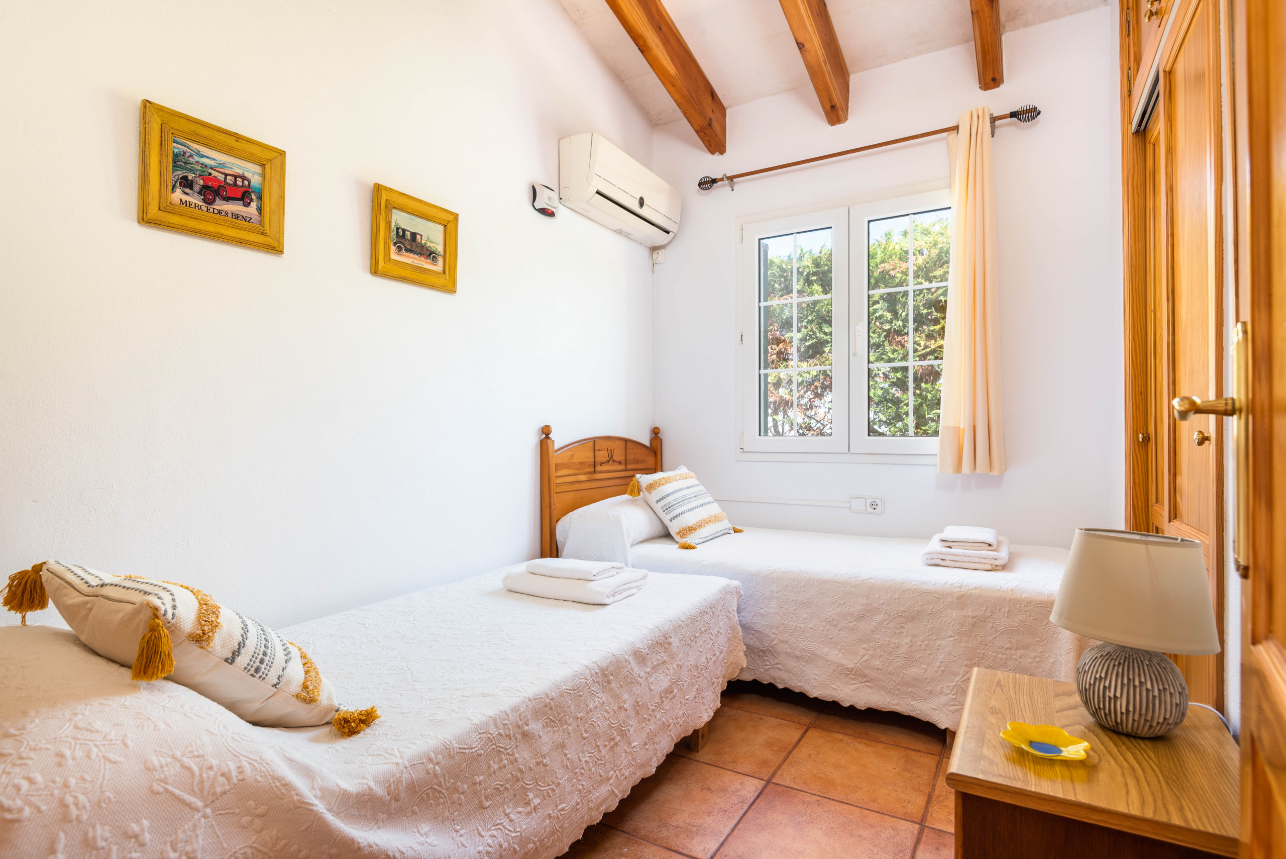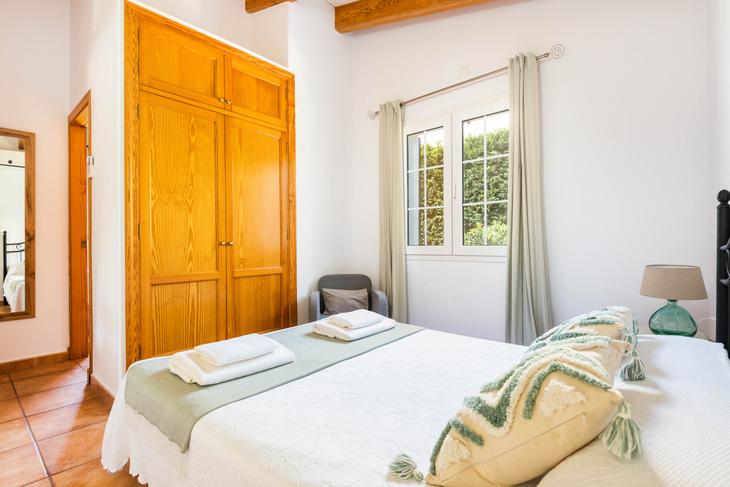 Consta de 3 dormitorios dobles, uno de ellos con cama de matrimonio y baño en suite con bañera, los otros dos dormitorios dobles con camas individuales comparten un baño con ducha. El acogedor salón está bien amueblado con mesas, sillas, cómodos sofás y TV. Tiene un gran ventanal que da acceso a la terraza con pérgola, amueblada con confortables sillones, mesas exteriores, sillas y tumbonas para tomar el sol y para poder disfrutar de una deliciosa cena en las noches de verano.