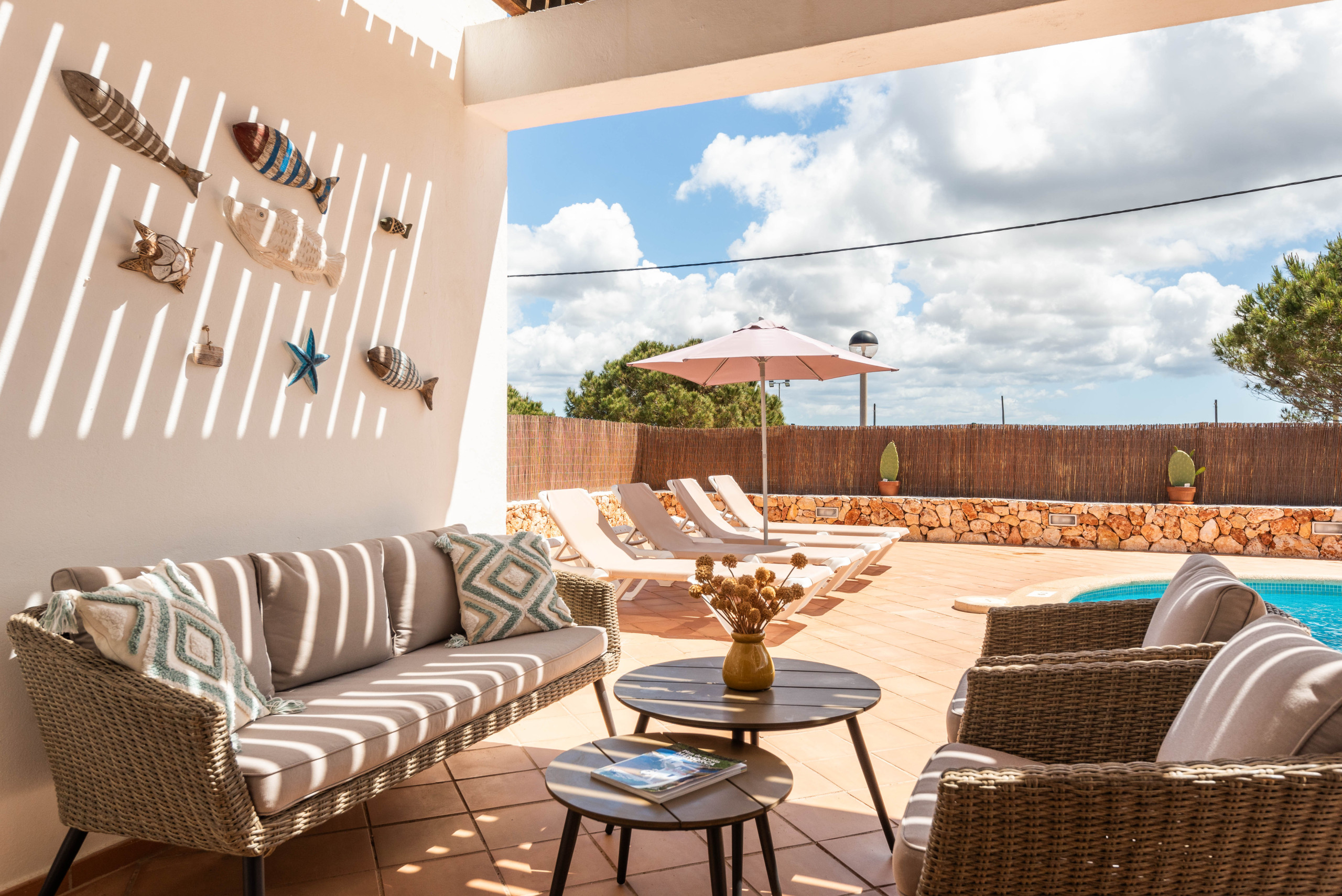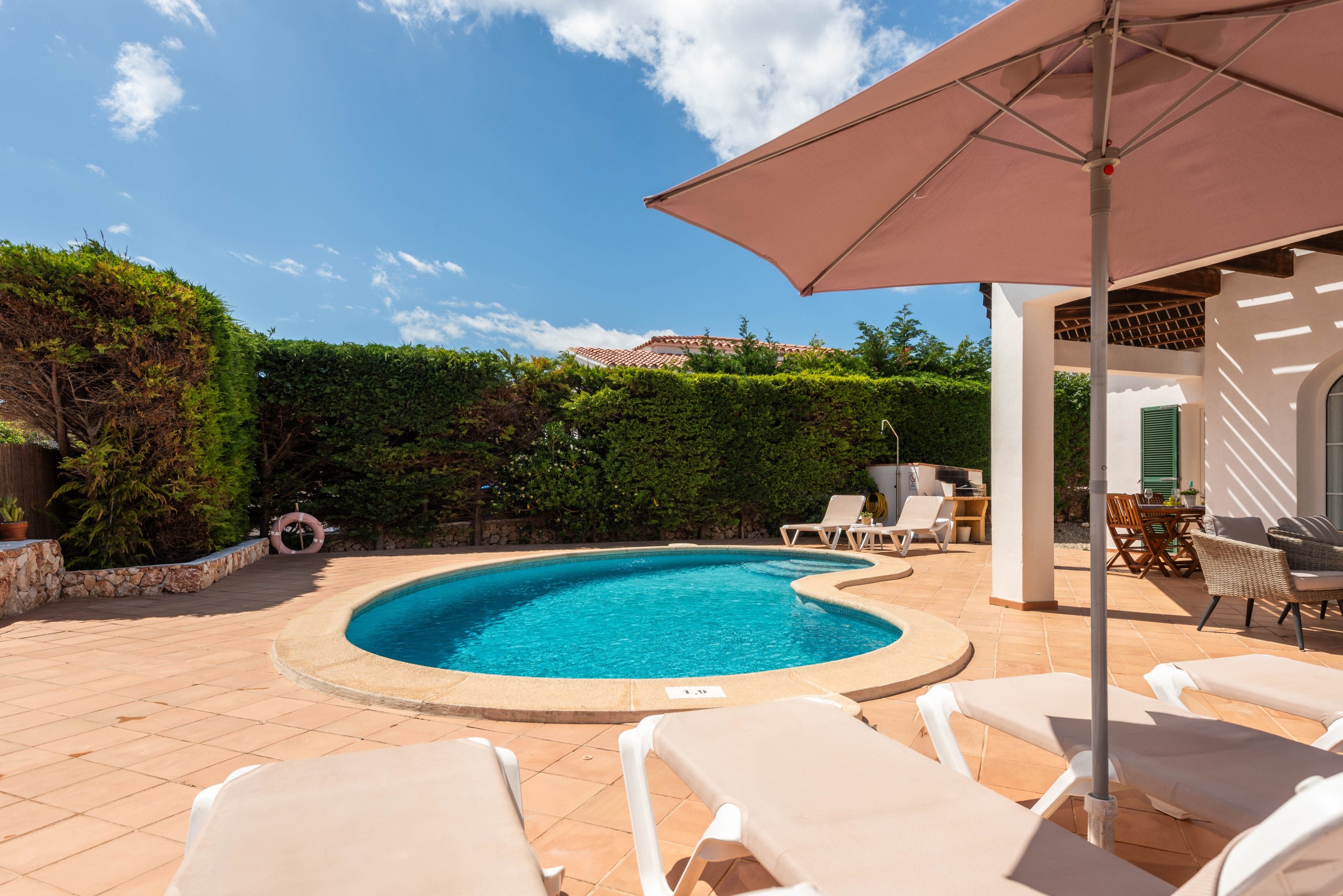 La villa dispone de aire acondicionado en todos los dormitorios, acogedor mobiliario exterior, con barbacoa de obra donde pueden disfrutar de unas magnificas puestas de sol a la costa sur menorquina.