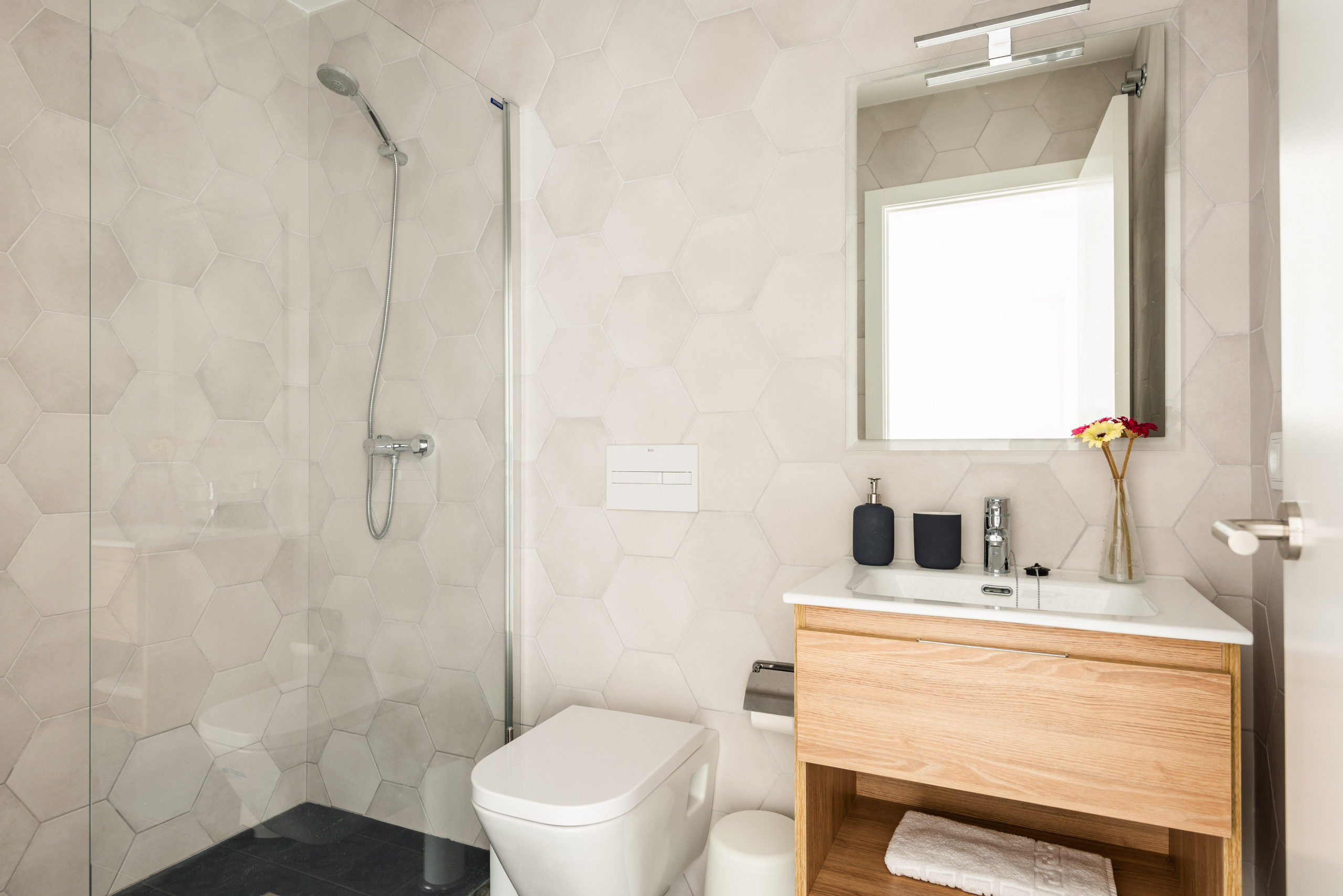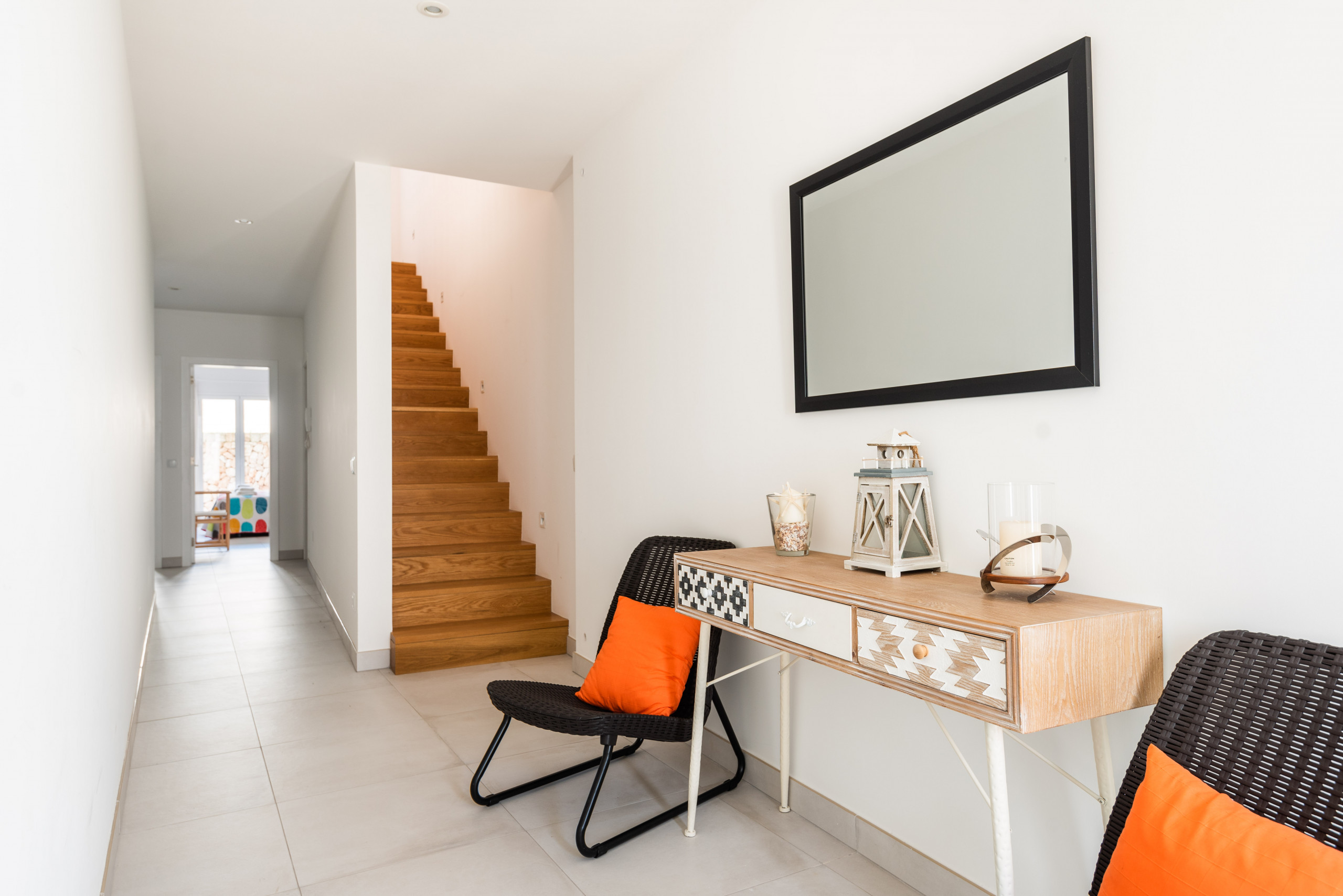 En la planta baja, encontramos el hall de entrada que distribuye acceso a dos dormitorios dobles que comparten un elegante baño con ducha, ambas habitaciones tienen acceso a un patio interior. En la primera planta, consta del tercer dormitorio doble con un baño independiente con ducha: también se encuentra un amplio y luminoso salón-comedor-cocina que da acceso a un balcón/terraza con vistas a la plaza. La cocina está completamente equipada con nevera/congelador, vitrocerámica, horno etc.