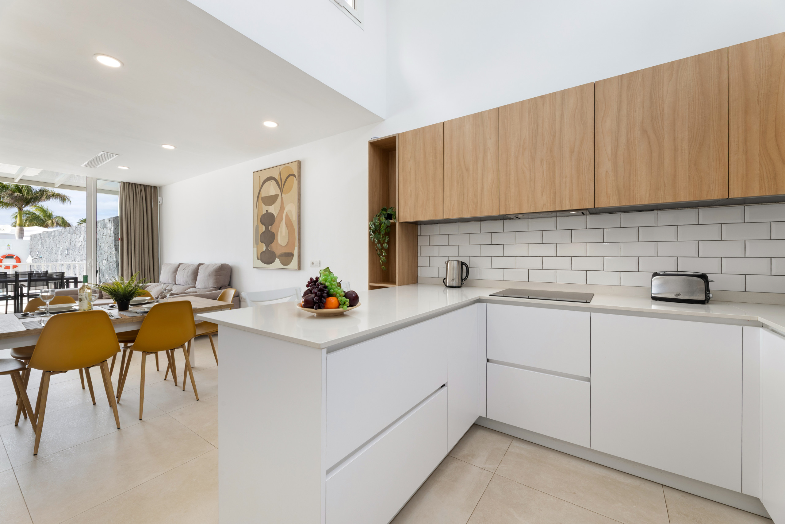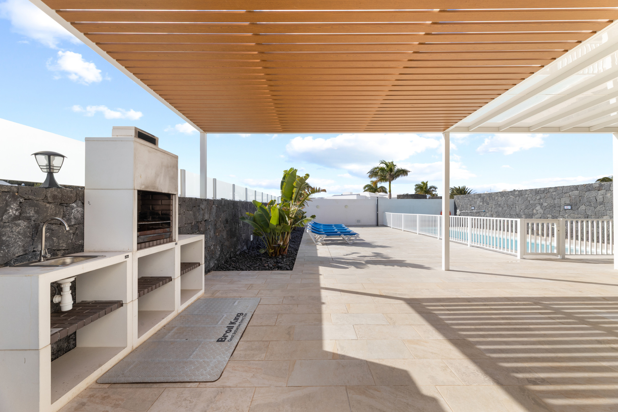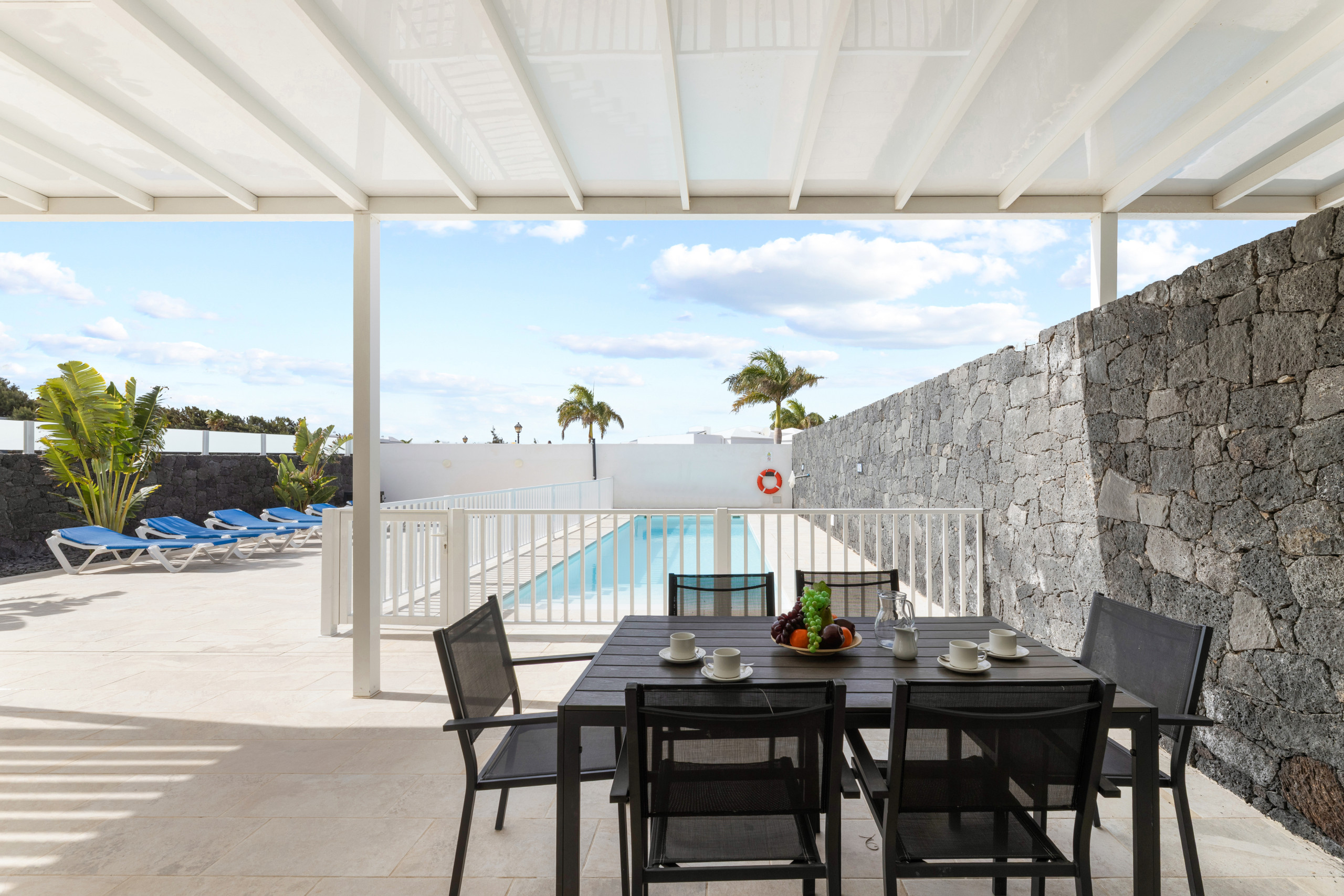 mesa y sillas zona de barbacoa y piscina privada rodeada de césped artificial. Además de otro comedor exterior. La casa está decorada con mucho gusto y elegancia. En su interior Villa Clara se distribuye en dos plantas: En la planta baja encontramos: Hermosa cocina muy luminosa con office, bien equipada con electrodomésticos y todo su equipamiento.