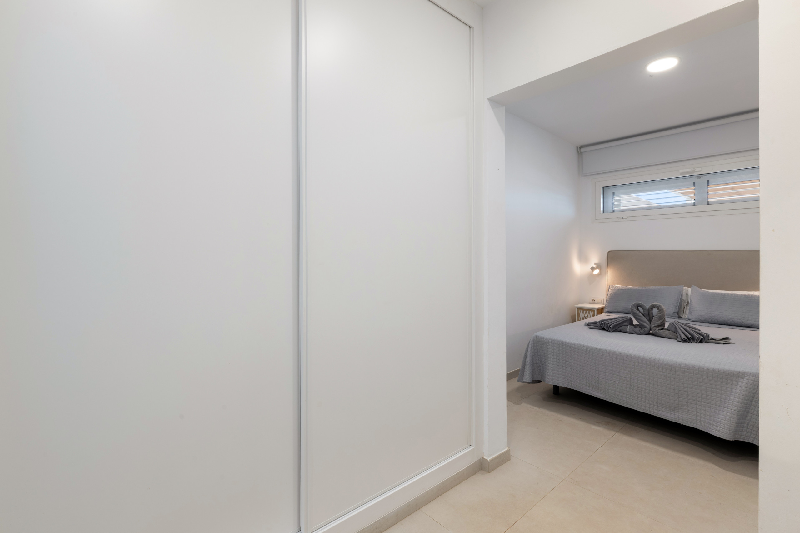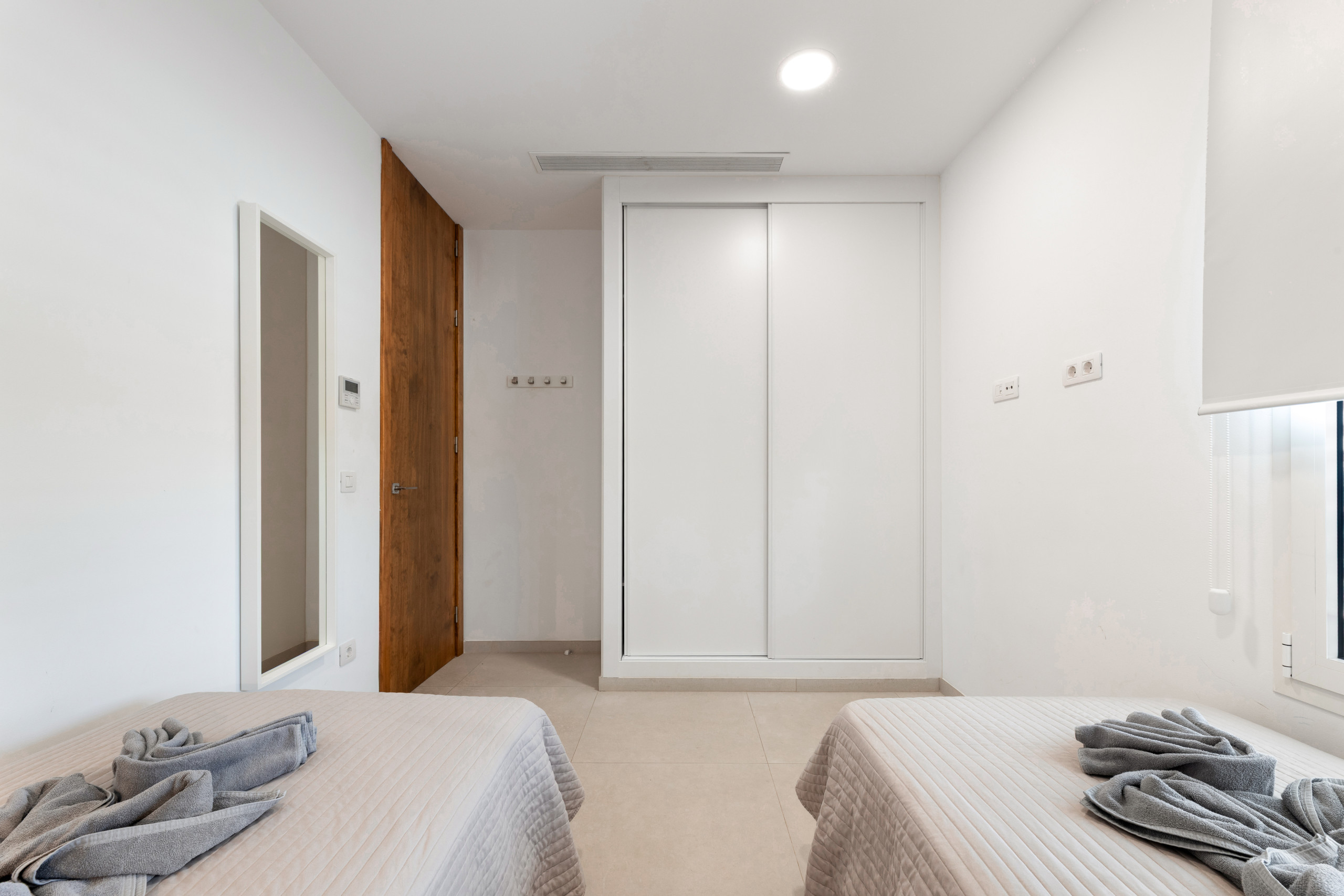 Salón con aire acondicionado con acceso exterior con un ventanal, wifi, smart tv. Baño con ducha compartido. En la planta alta se encuentran los dormitorios. La villa dispone de 3 dormitorios, dos de ellos con cama de matrimonio y un dormitorio con dos camas individuales, además de un baño con ducha. Todos los dormitorios con aire acondicionado. Hay caja fuerte.