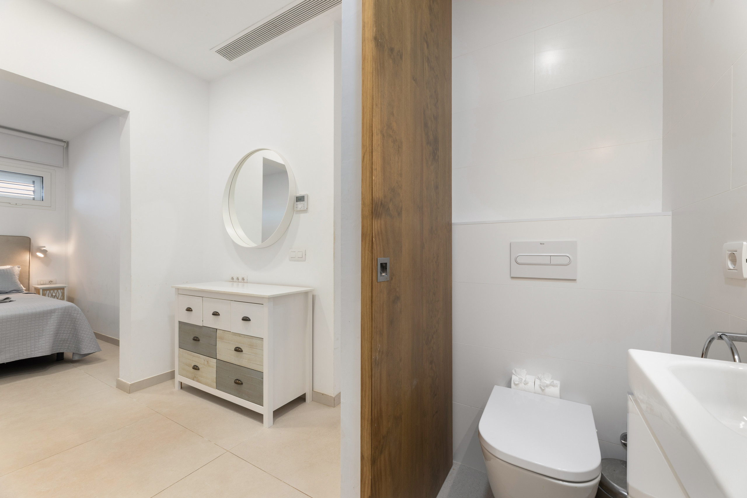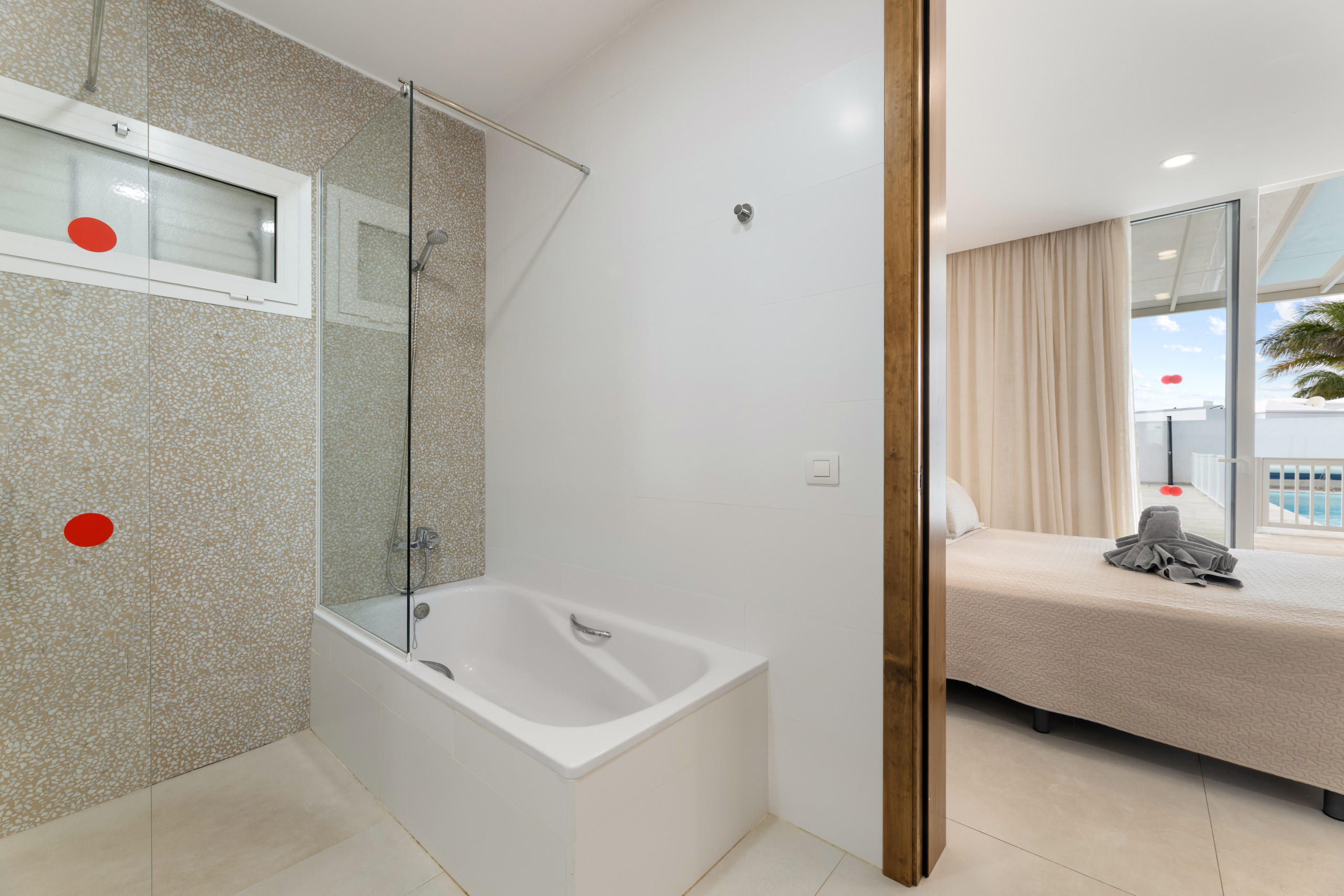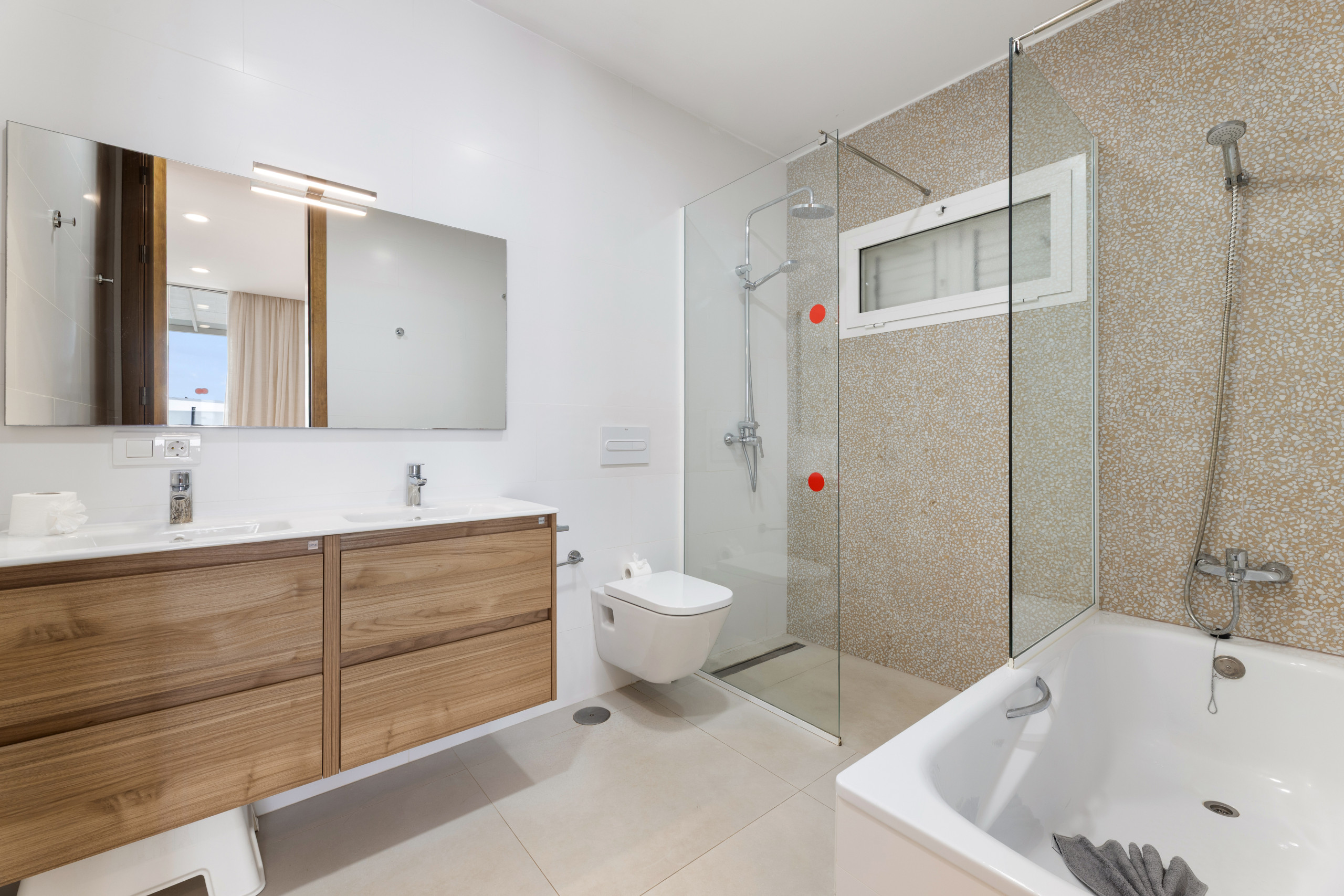 Cuenta con una espaciosa cocina bien equipada, con isla. Salón comedor de buen tamaño donde poder relajarse. Sus tres dormitorios, dos de ellos con cama de matrimonio y el otro con dos camas individuales tienen aire acondicionado. Dentro del alojamiento hay tres cuartos de baño (dos de ellos in suite), con ducha y uno con bañera.