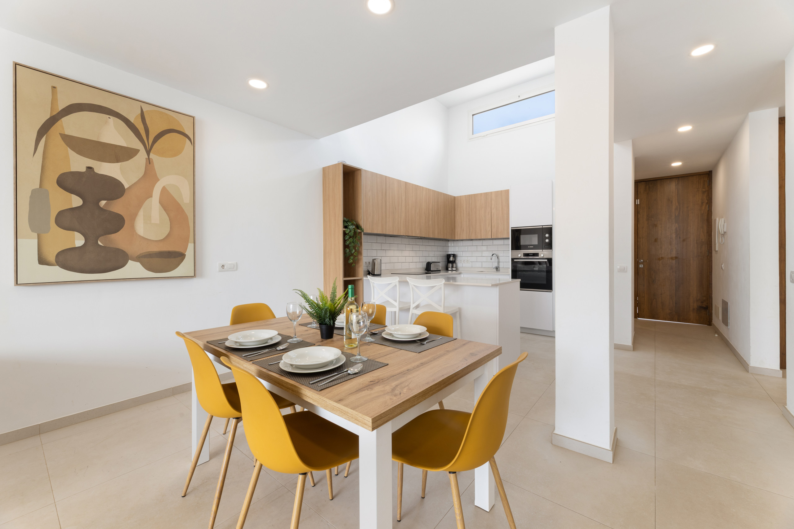 abierta con barra para desayunar. Equipada con todos los electrodomésticos. El salón