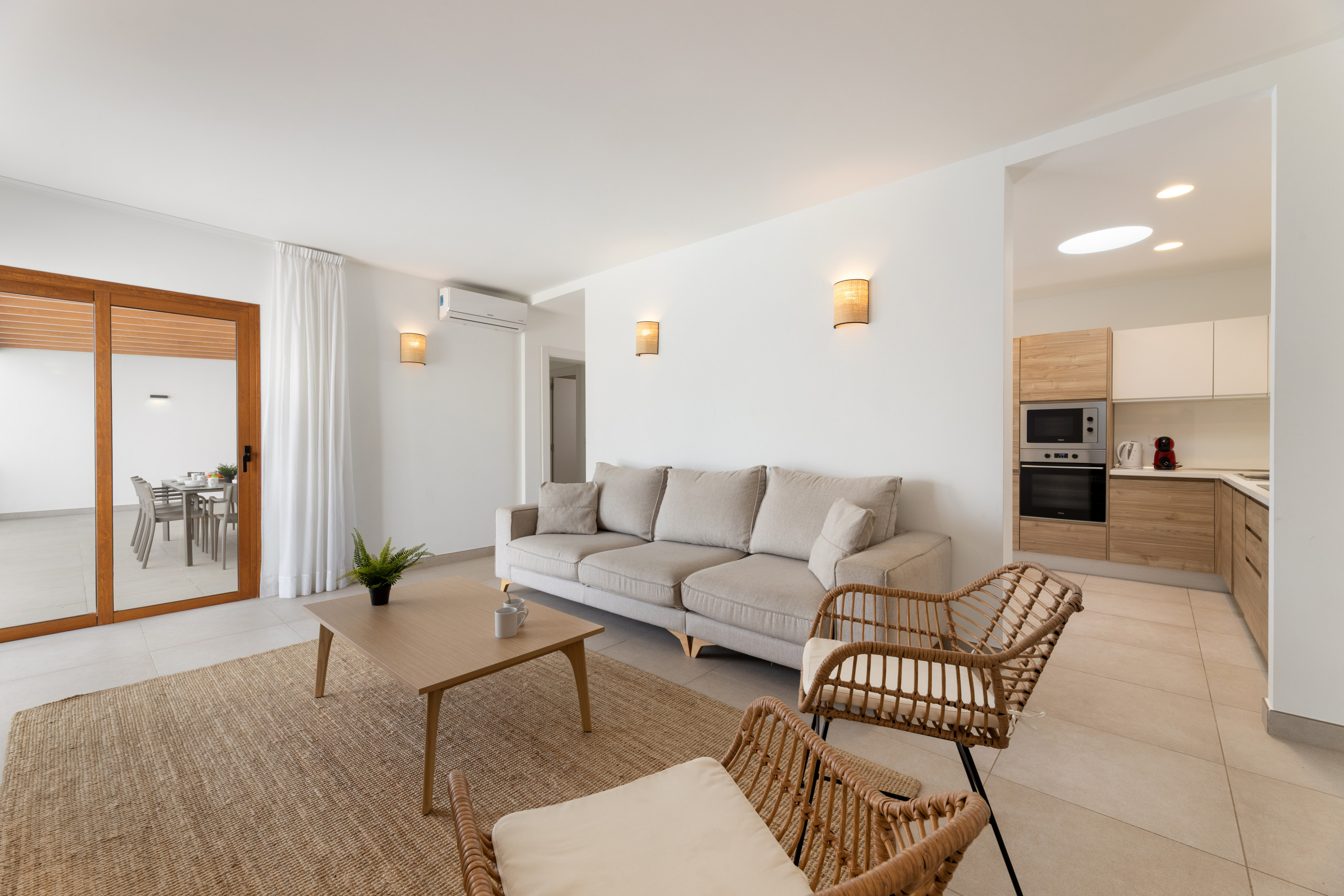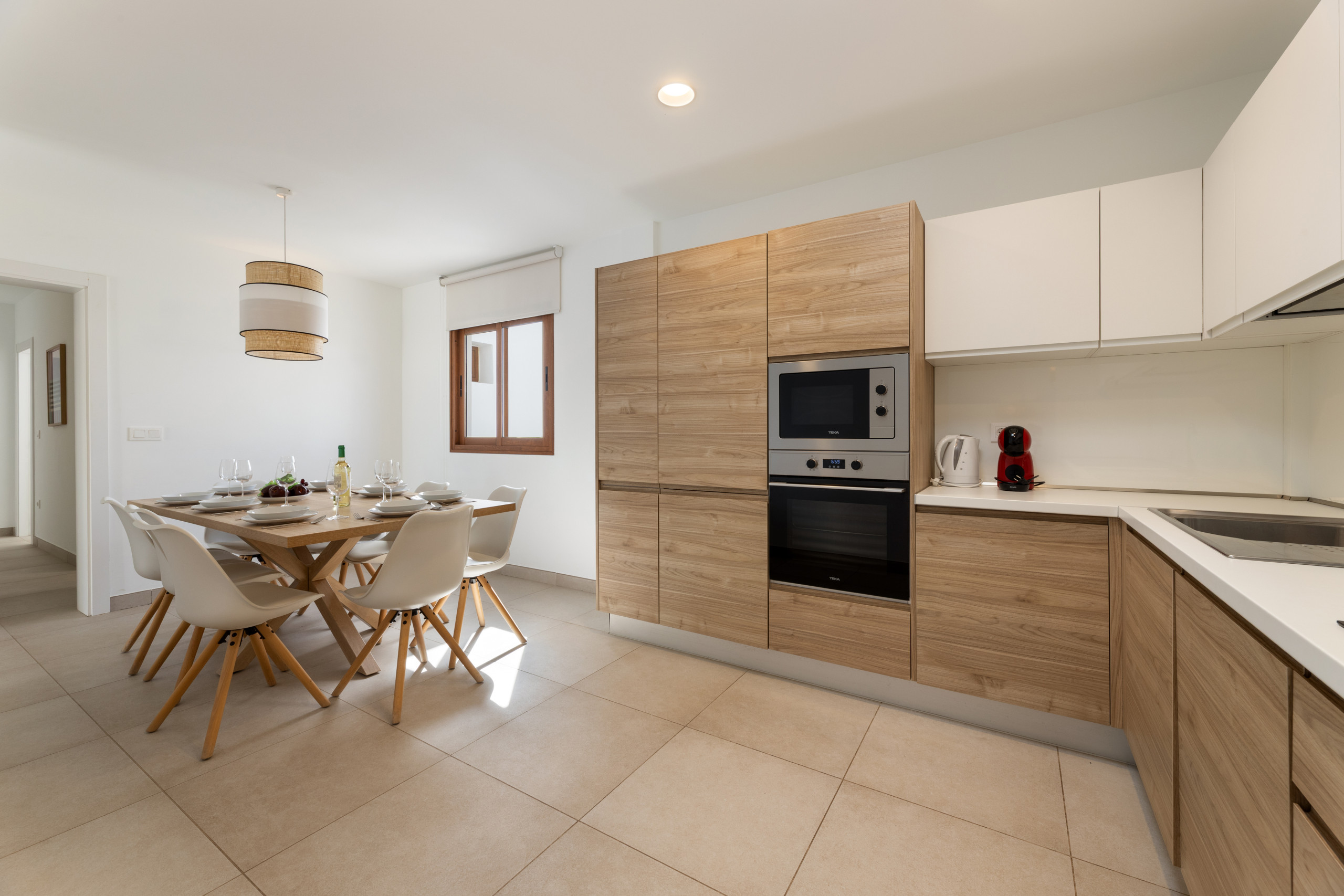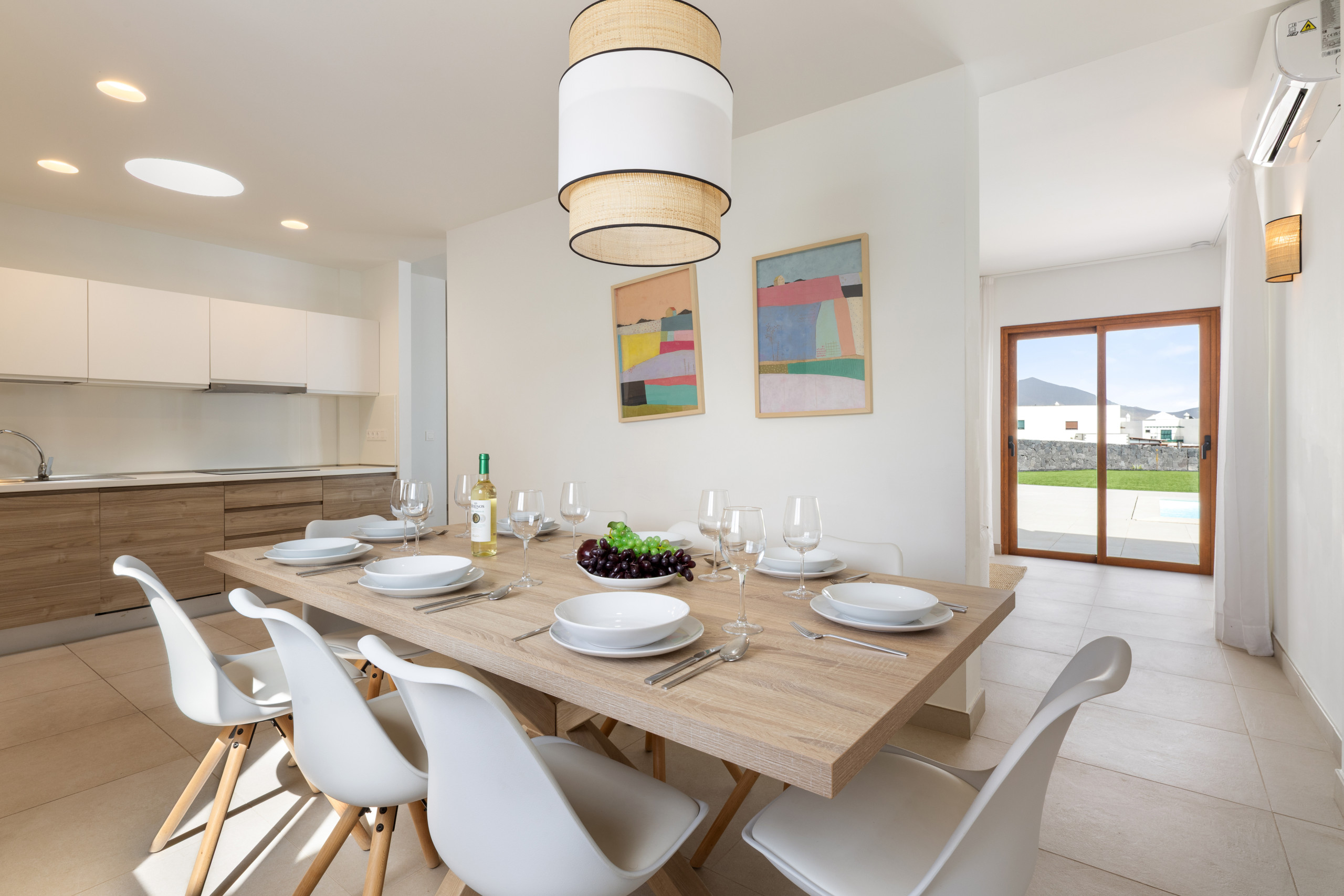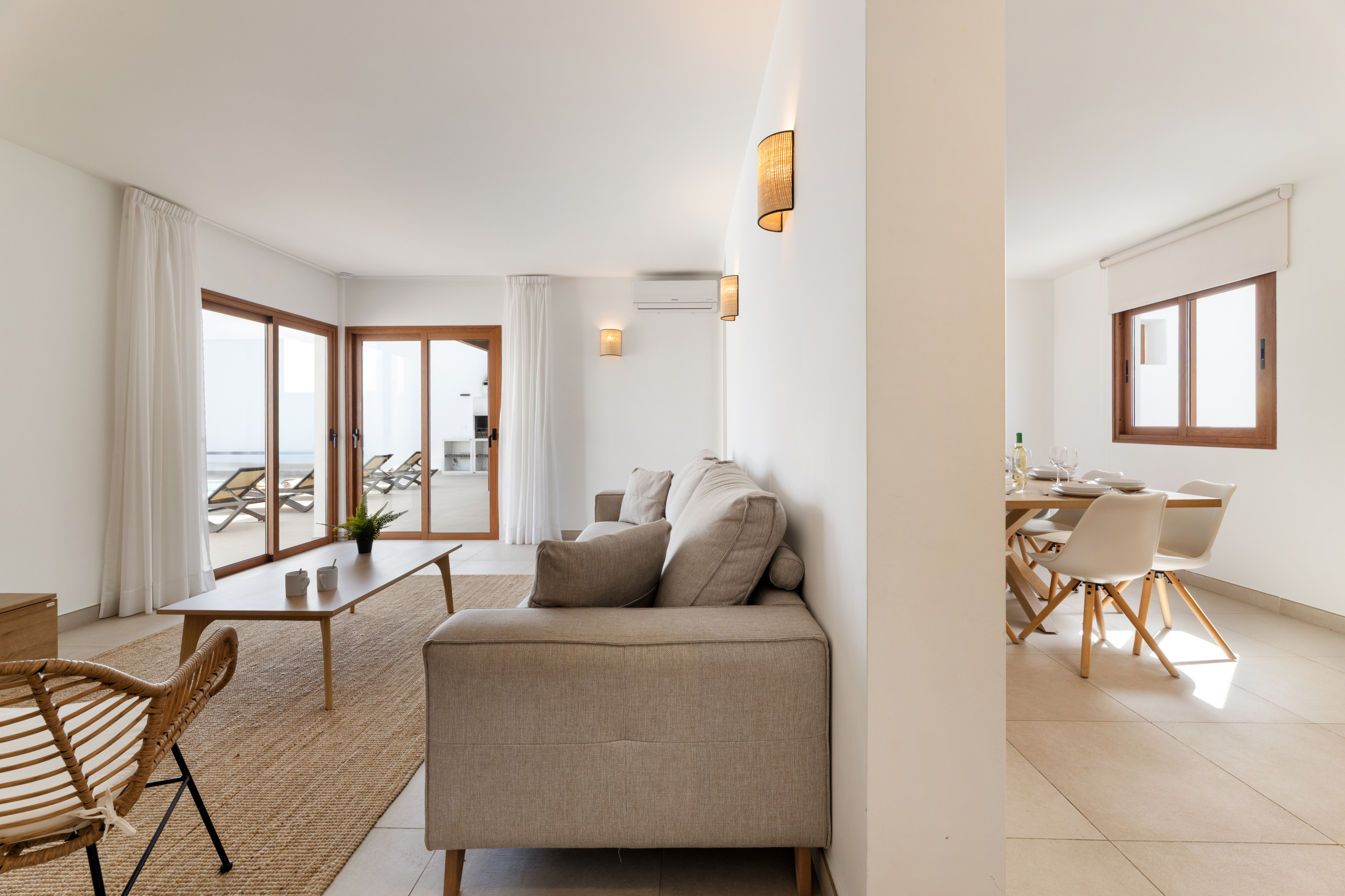 El interior de la villa destaca por su luminosidad y diseño contemporáneo. Cuenta con 3 baños completamente equipados, dos con ducha y uno con bañera, facilitando la convivencia de los huéspedes. La cocina está totalmente implementada con electrodomésticos de última generación, incluyendo lavadora, lavavajillas, horno, microondas, cafetera y una amplia variedad de utensilios que harán de la preparación de comidas una experiencia placentera.