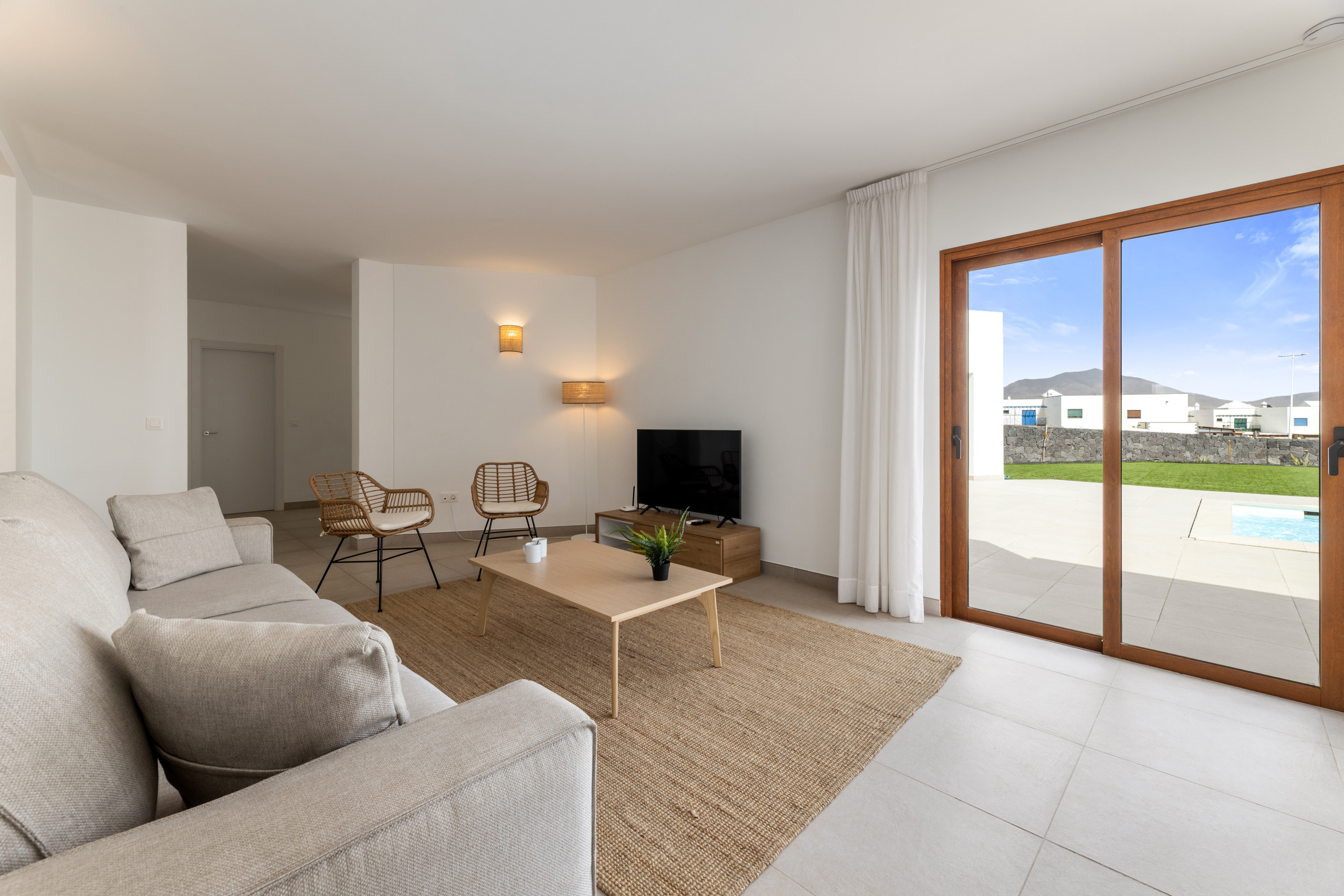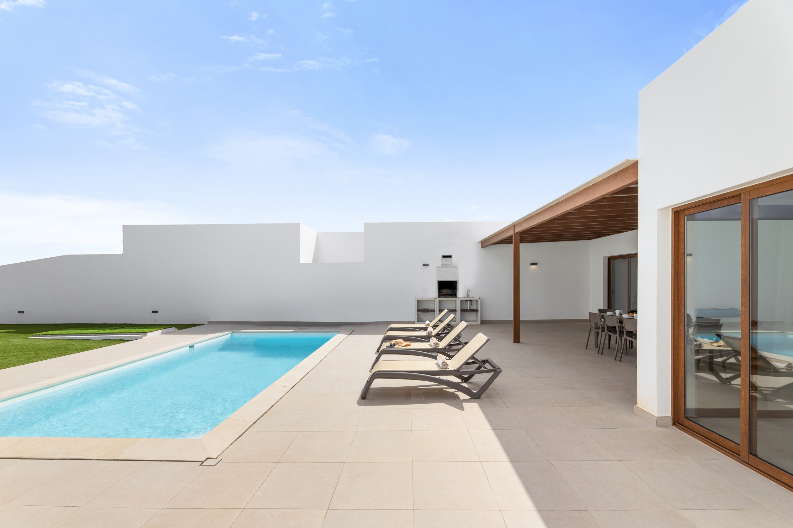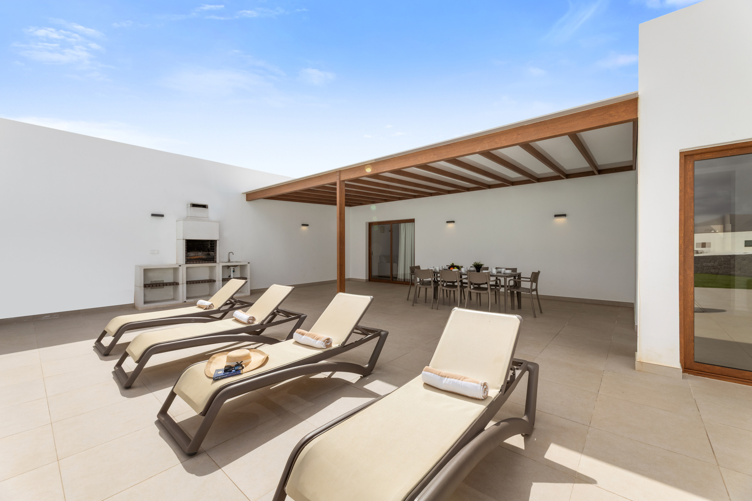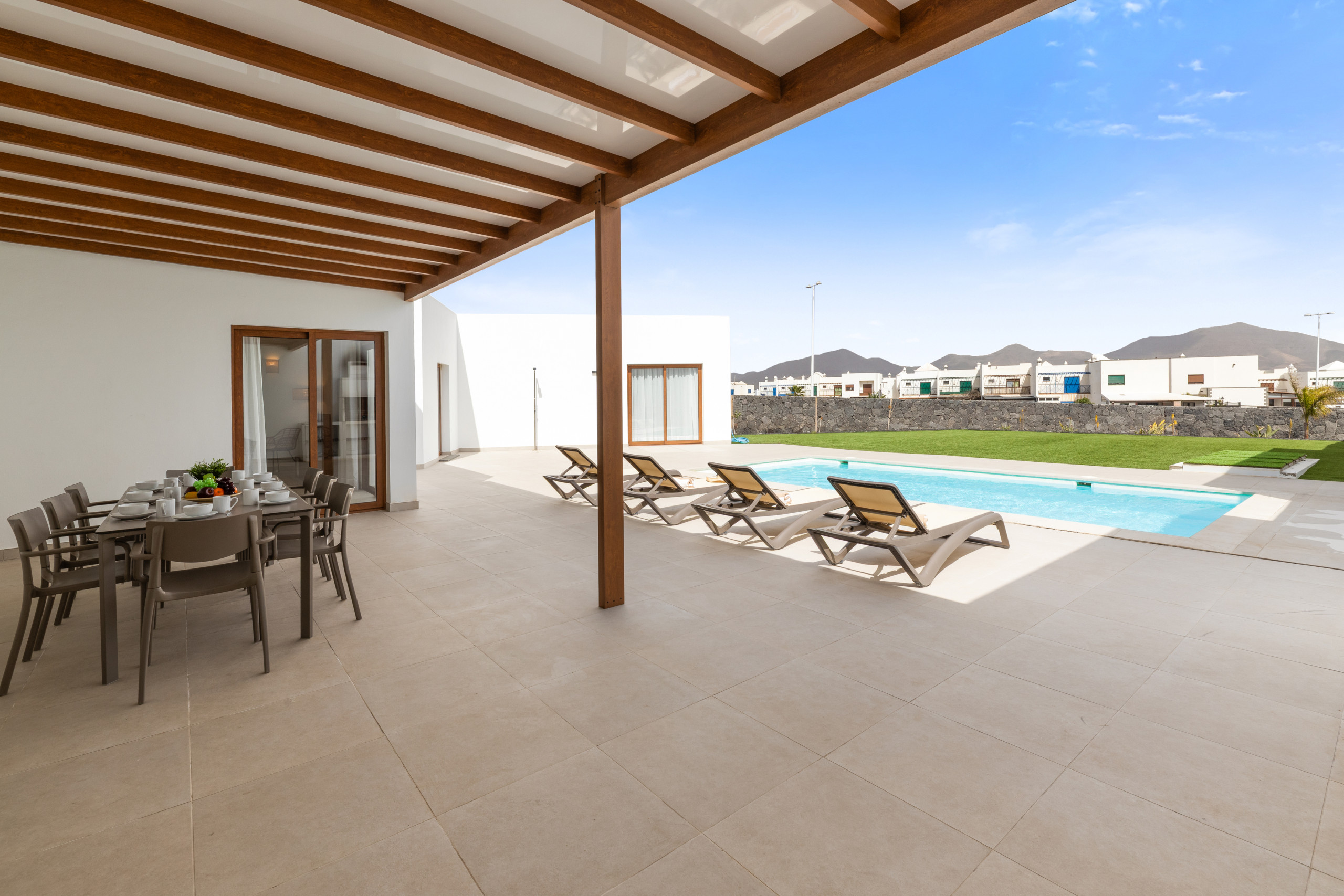 Los espacios exteriores son un verdadero punto de encuentro, con un jardín privado que invita a la relajación y momentos de convivencia. La villa dispone de muebles de jardín y una barbacoa perfecta para disfrutar de veladas únicas bajo el cielo de Lanzarote. Además, cuenta con una piscina privada climatizada en invierno, que ofrece vistas impresionantes al jardín y a los alrededores.