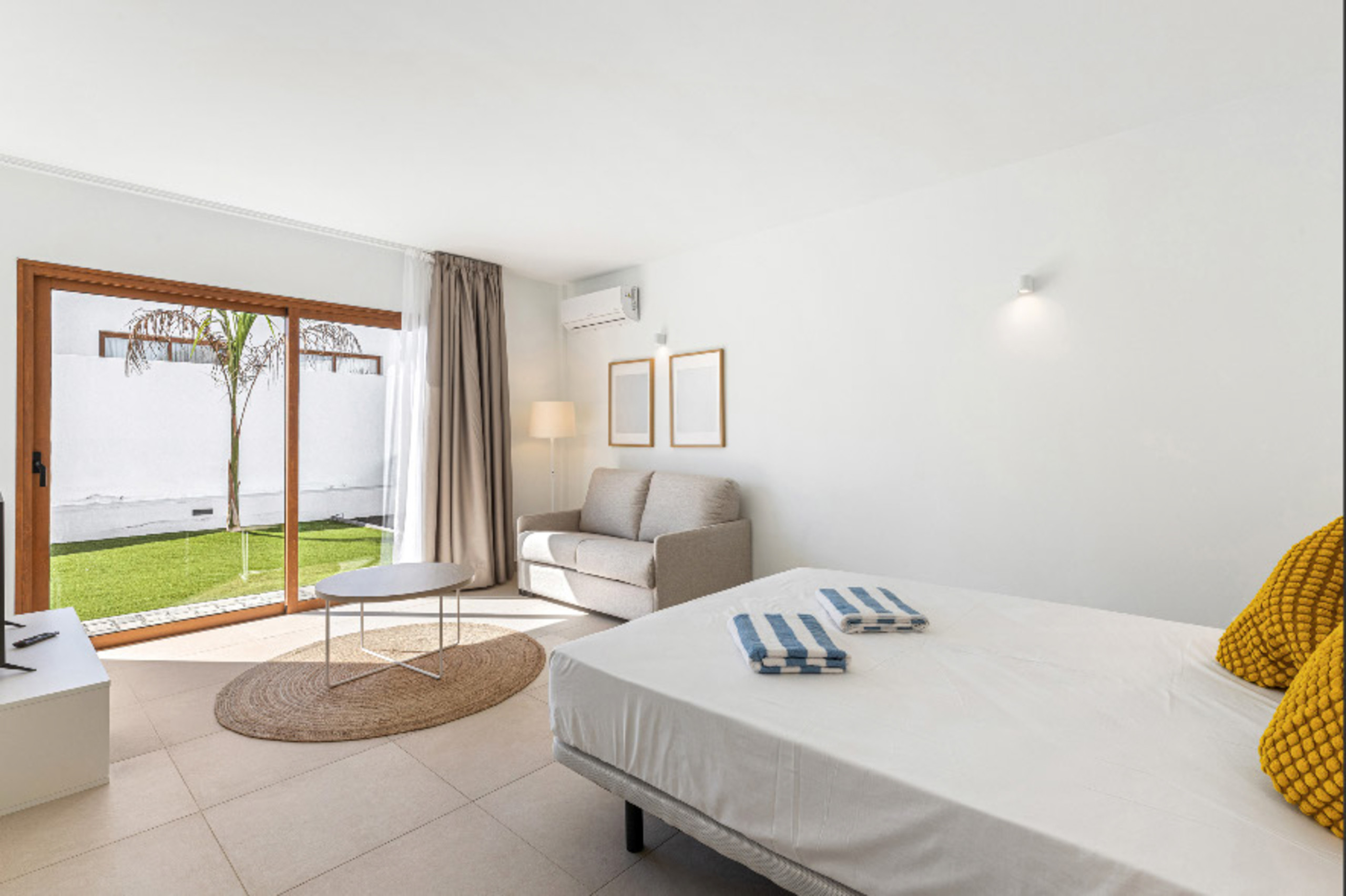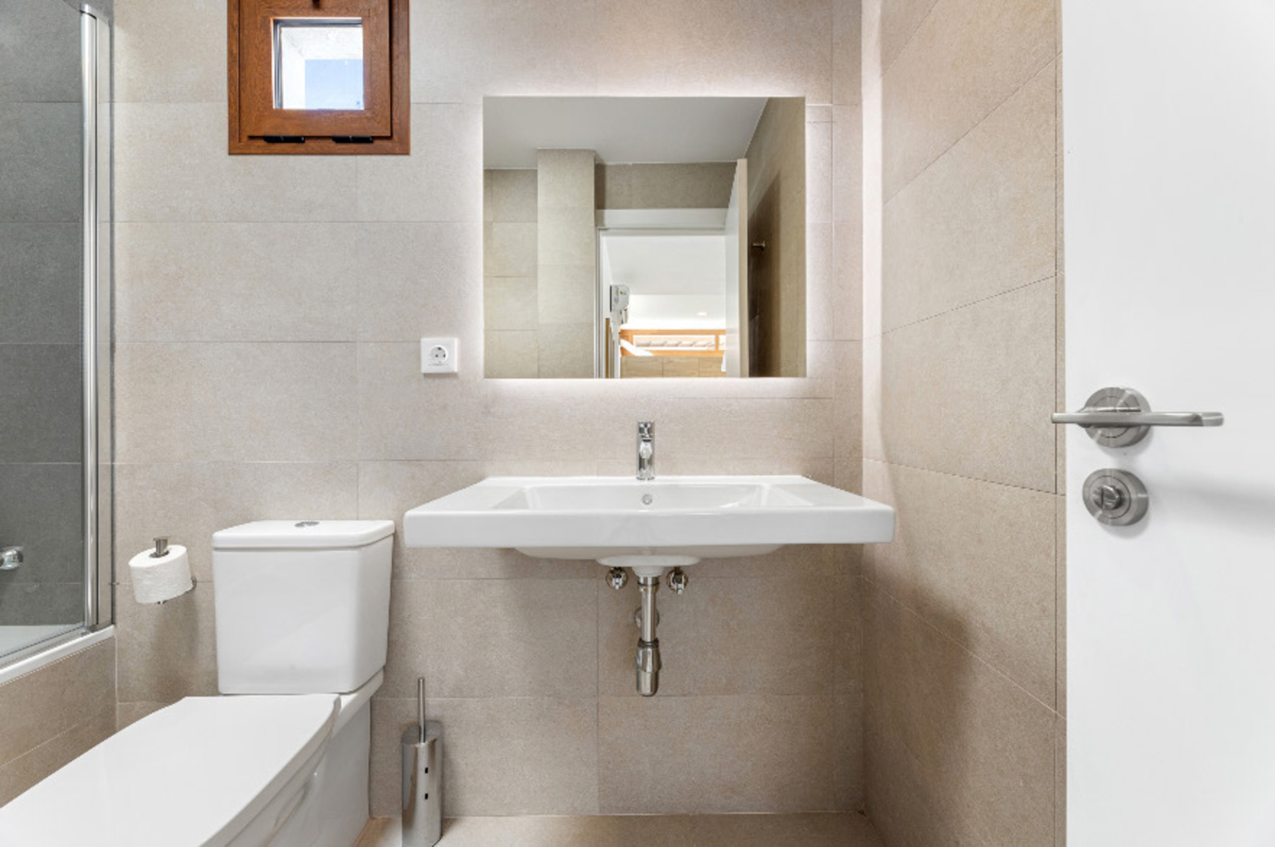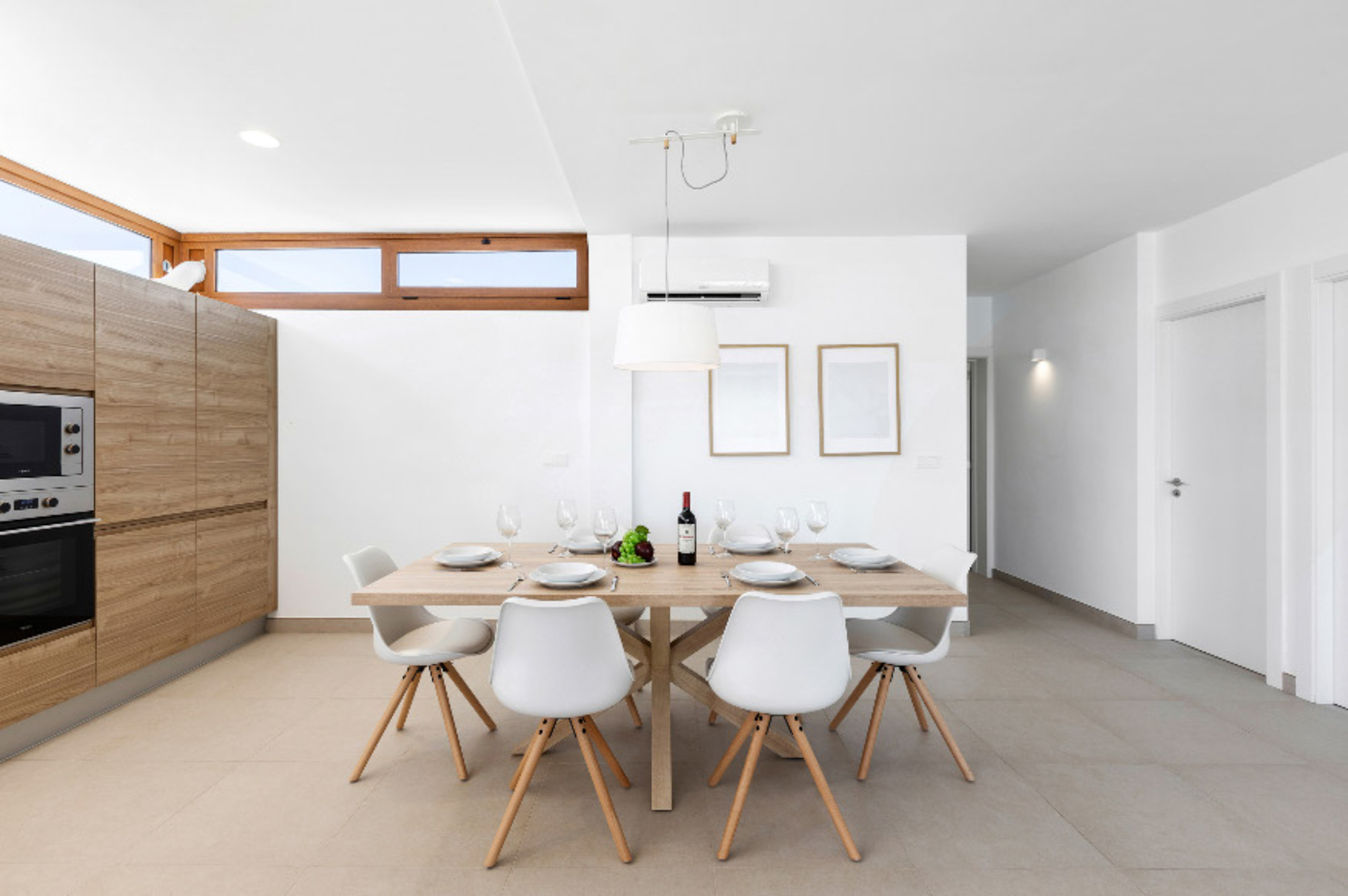 El interior de la villa destaca por su luminosidad y diseño contemporáneo. Cuenta con 3 baños completamente equipados, dos con ducha y uno con bañera, facilitando la convivencia de los huéspedes. La cocina está totalmente implementada con electrodomésticos de última generación, incluyendo lavadora, lavavajillas, horno, microondas, cafetera y una amplia variedad de utensilios que harán de la preparación de comidas una experiencia placentera.