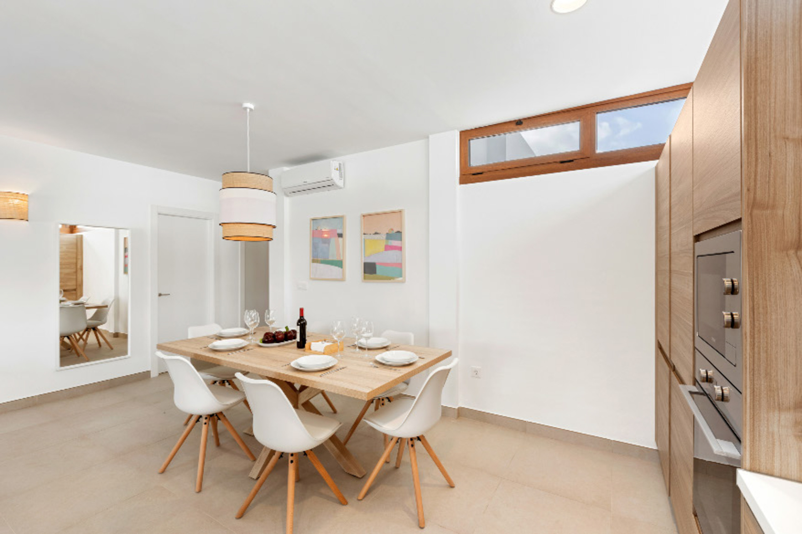 El interior de la villa destaca por su luminosidad y diseño contemporáneo. Cuenta con 3 baños completamente equipados, dos con ducha y uno con bañera, facilitando la convivencia de los huéspedes. La cocina está totalmente implementada con electrodomésticos de última generación, incluyendo lavadora, lavavajillas, horno, microondas, cafetera y una amplia variedad de utensilios que harán de la preparación de comidas una experiencia placentera.
