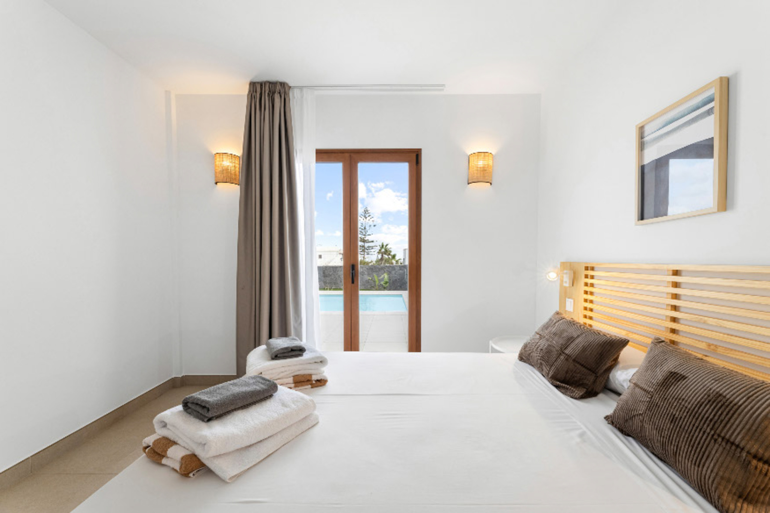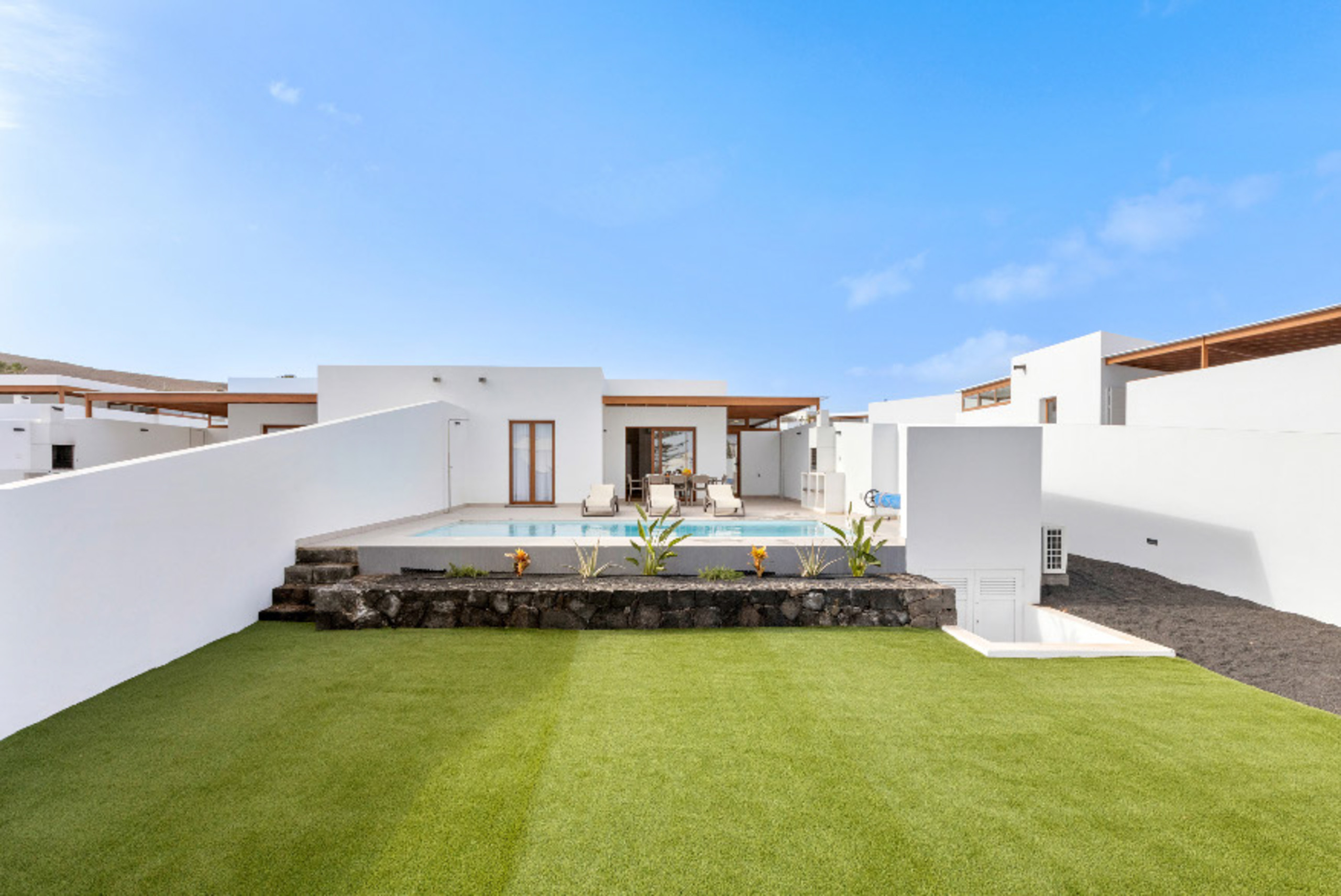 Los espacios exteriores son un verdadero punto de encuentro, con un jardín privado que invita a la relajación y momentos de convivencia. La villa dispone de muebles de jardín y una barbacoa perfecta para disfrutar de veladas únicas bajo el cielo de Lanzarote. Además, cuenta con una piscina privada climatizada en invierno, que ofrece vistas impresionantes al jardín y a los alrededores.
