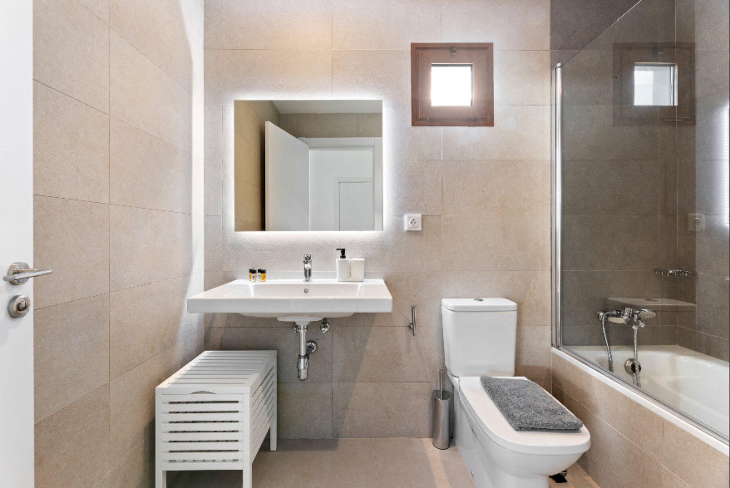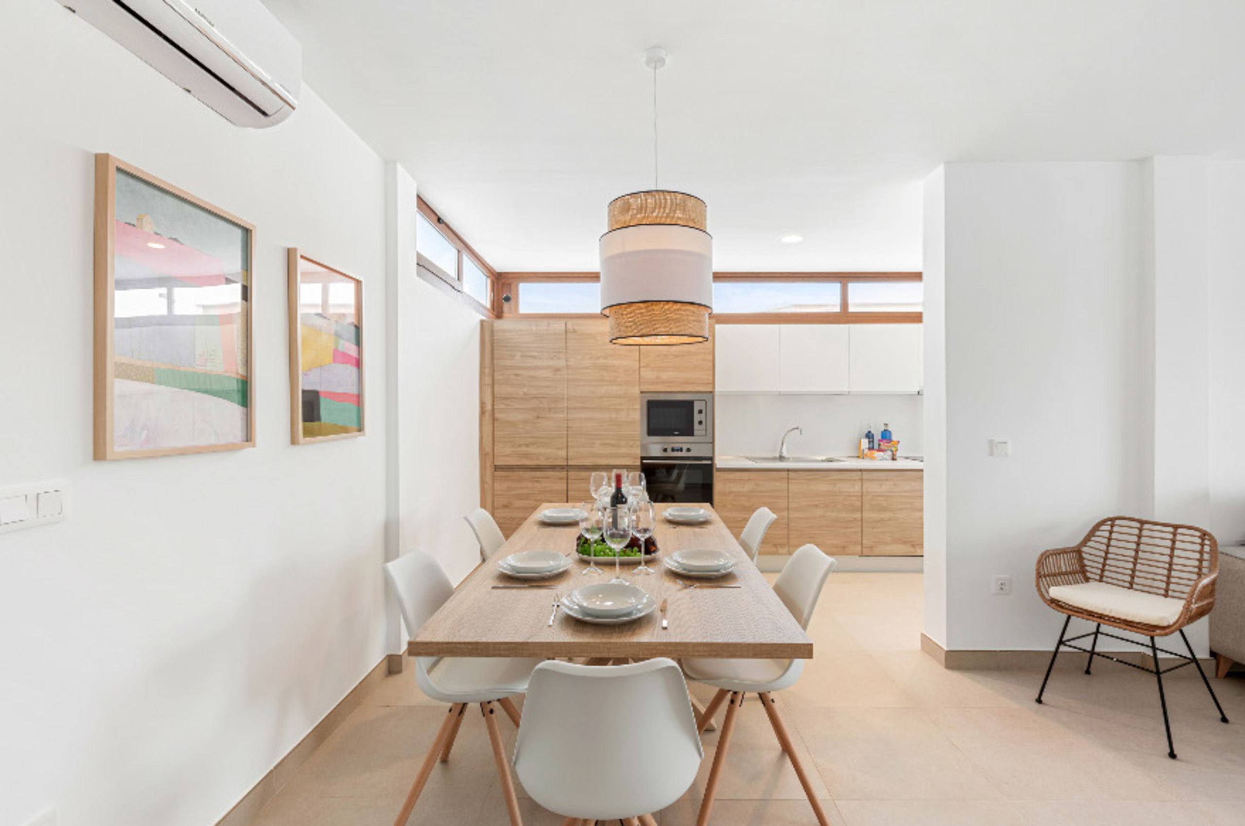 El interior de la villa destaca por su luminosidad y diseño contemporáneo. Cuenta con 3 baños completamente equipados, dos con ducha y uno con bañera, facilitando la convivencia de los huéspedes. La cocina está totalmente implementada con electrodomésticos de última generación, incluyendo lavadora, lavavajillas, horno, microondas, cafetera y una amplia variedad de utensilios que harán de la preparación de comidas una experiencia placentera.