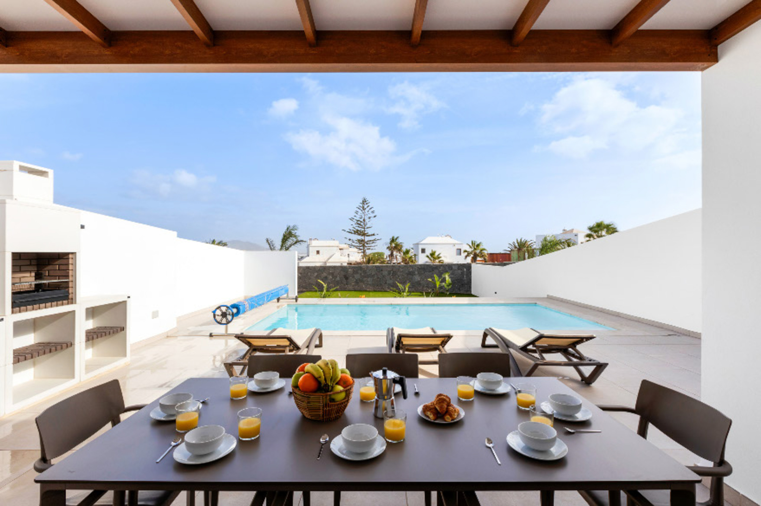 Los espacios exteriores son un verdadero punto de encuentro, con un jardín privado que invita a la relajación y momentos de convivencia. La villa dispone de muebles de jardín y una barbacoa perfecta para disfrutar de veladas únicas bajo el cielo de Lanzarote. Además, cuenta con una piscina privada climatizada en invierno, que ofrece vistas impresionantes al jardín y a los alrededores.