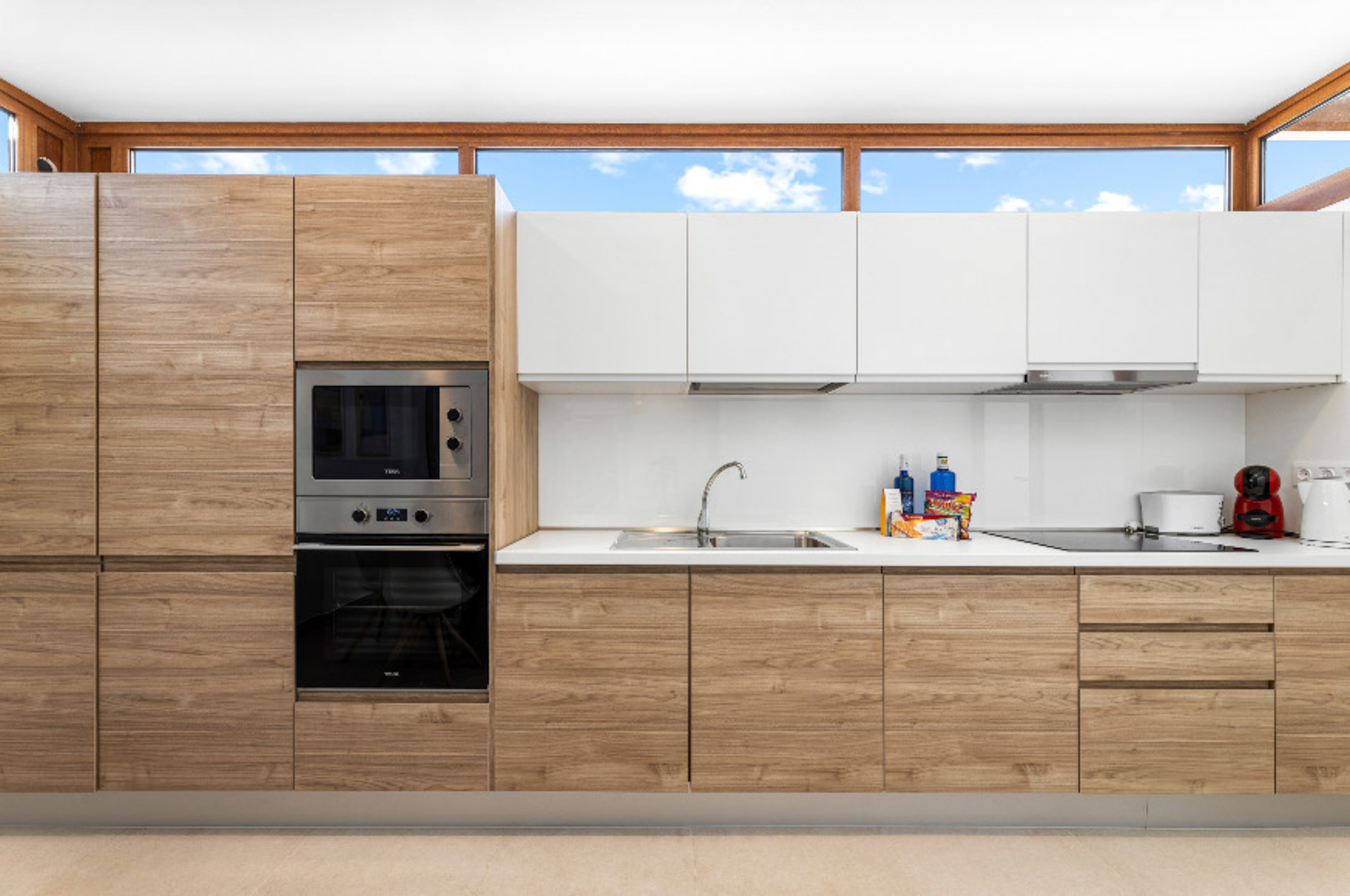 El interior de la villa destaca por su luminosidad y diseño contemporáneo. Cuenta con 3 baños completamente equipados, dos con ducha y uno con bañera, facilitando la convivencia de los huéspedes. La cocina está totalmente implementada con electrodomésticos de última generación, incluyendo lavadora, lavavajillas, horno, microondas, cafetera y una amplia variedad de utensilios que harán de la preparación de comidas una experiencia placentera.