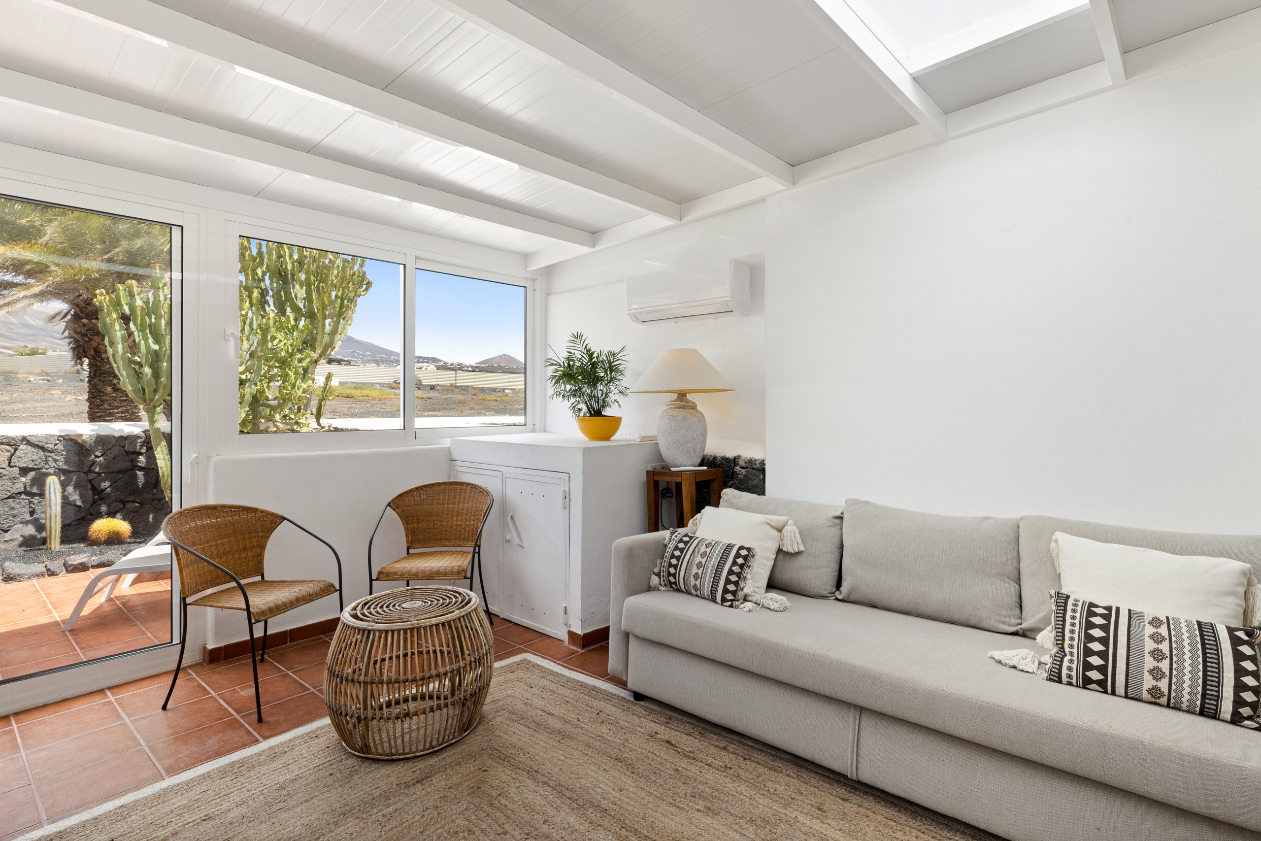de sofá cama, aire acondicionado y acceso directo a una segunda terraza con tumbonas.