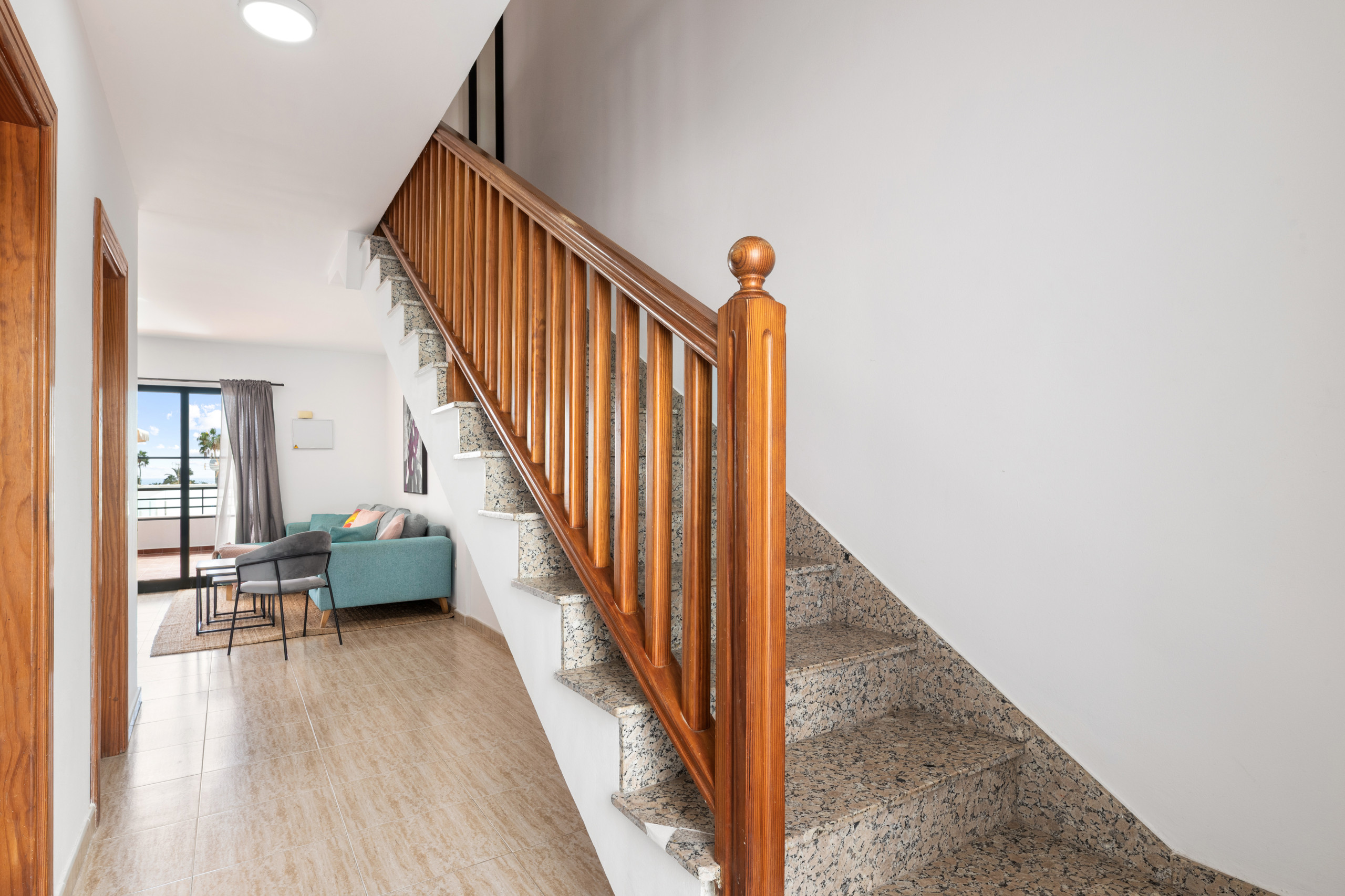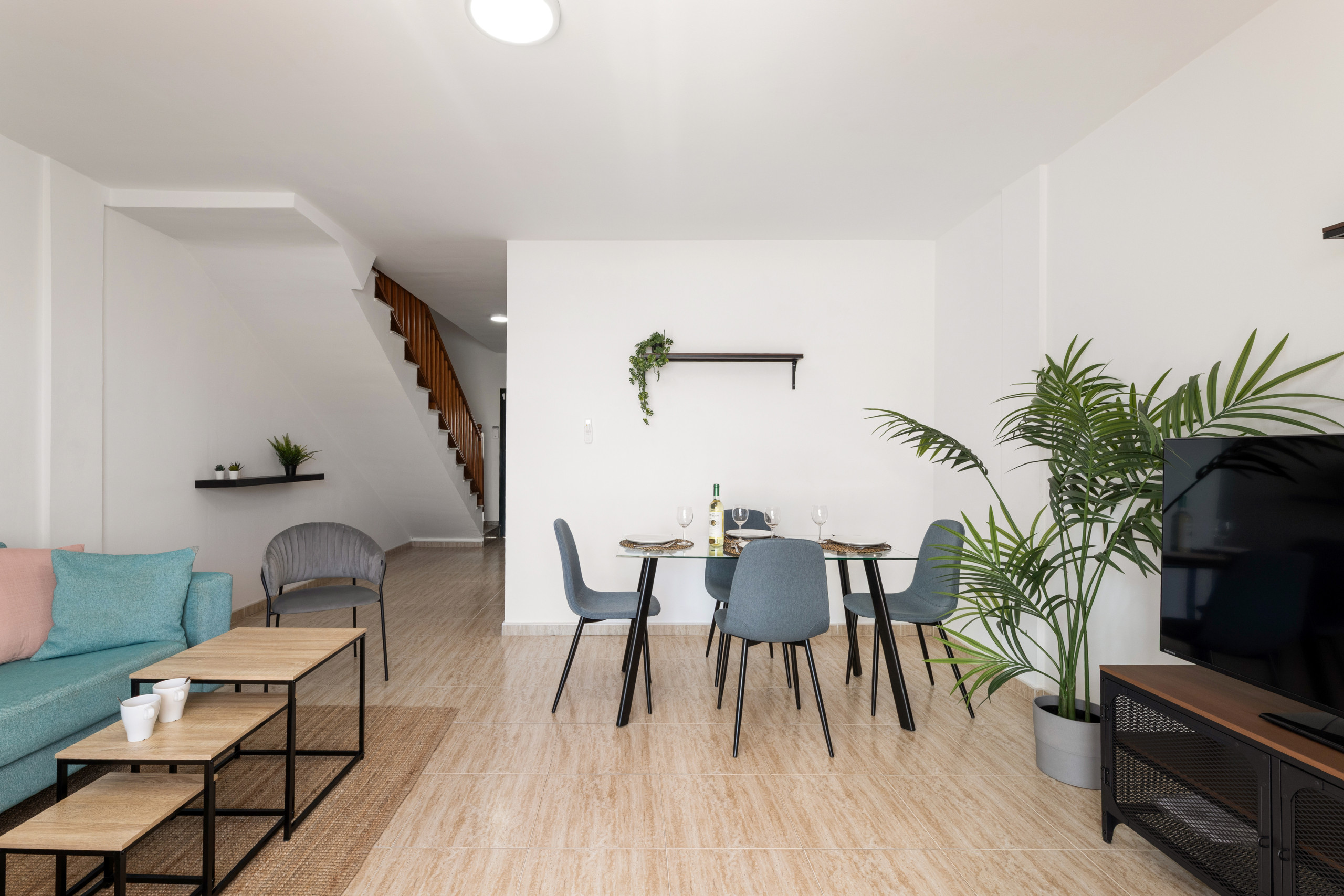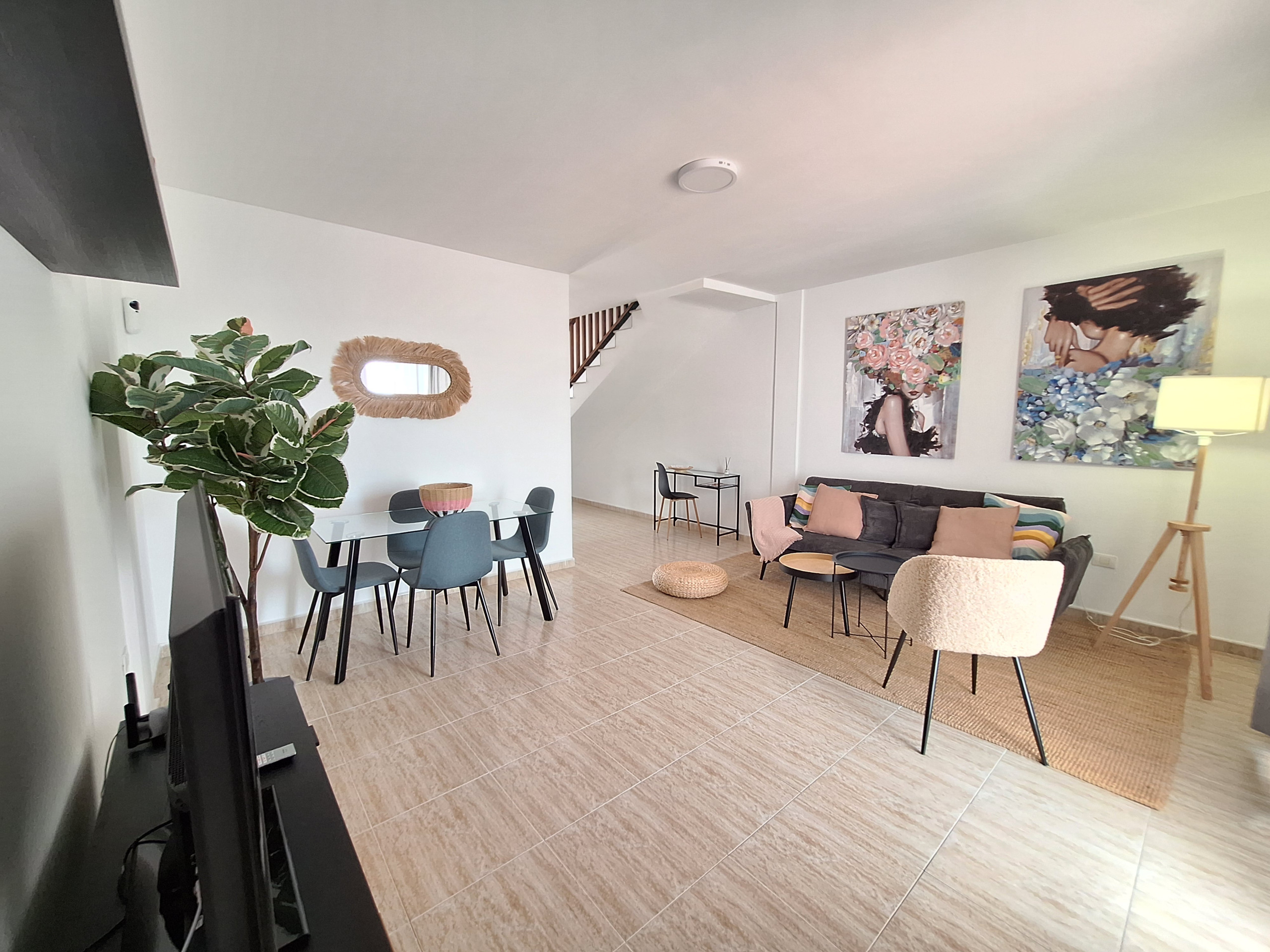 Nuestros modernos dúplex ofrecen un amplio espacio para disfrutar de tus vacaciones con total comodidad. En la planta baja, encontrará una cocina totalmente reformada, equipada con menaje y electrodomésticos propios de un hogar. El amplio salón-comedor, con acceso a una terraza amueblada, es el lugar perfecto para disfrutar de momentos de tranquilidad y compañía. Además, en este espacio exterior, podrás relajarte en una piscina privada de 3 x 3. La planta baja cuenta con un baño completo con ducha. En la planta alta, a la que se accede por escaleras internas, se encuentran tres dormitorios. Disponen de una cama de matrimonio con ropero empotrado. El segundo dormitorio cuenta con dos camas individuales de 90 cm y ropero empotrado, y el tercero tiene una cama individual de 90 cm. Además, en esta planta se encuentra un baño completo con ducha y un balcón con vistas al mar. Este dúplex tiene capacidad para hasta 5 personas más un bebé (cuna disponible bajo previa petición). No dispone de camas supletorias ni sofá cama. Entre otros servicios, el alojamiento ofrece Wi-Fi gratuito en las instalaciones, y fácil aparcamiento (no privado). Los dúplex no dispone de aire acondicionado, ventiladores ni calefactores. Ideal para familias, grupos de amigos y trabajadores en remoto.