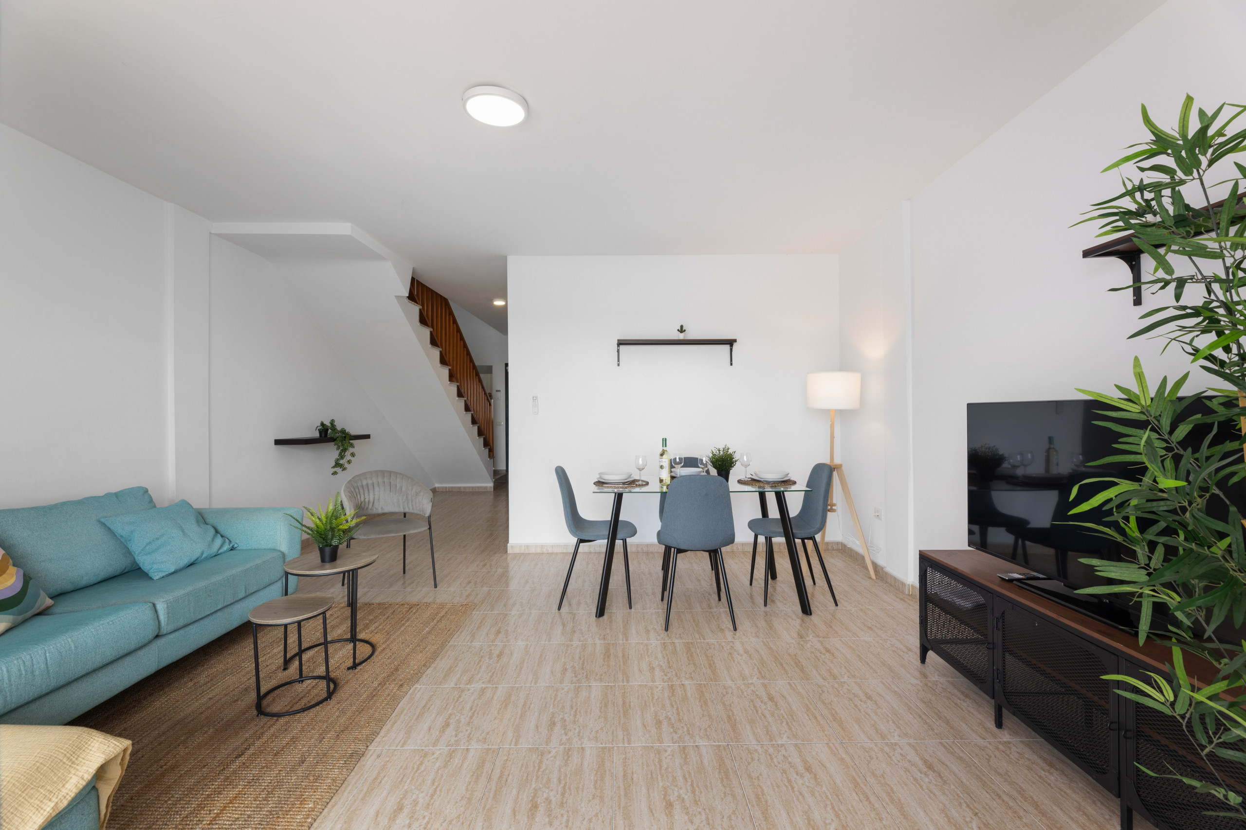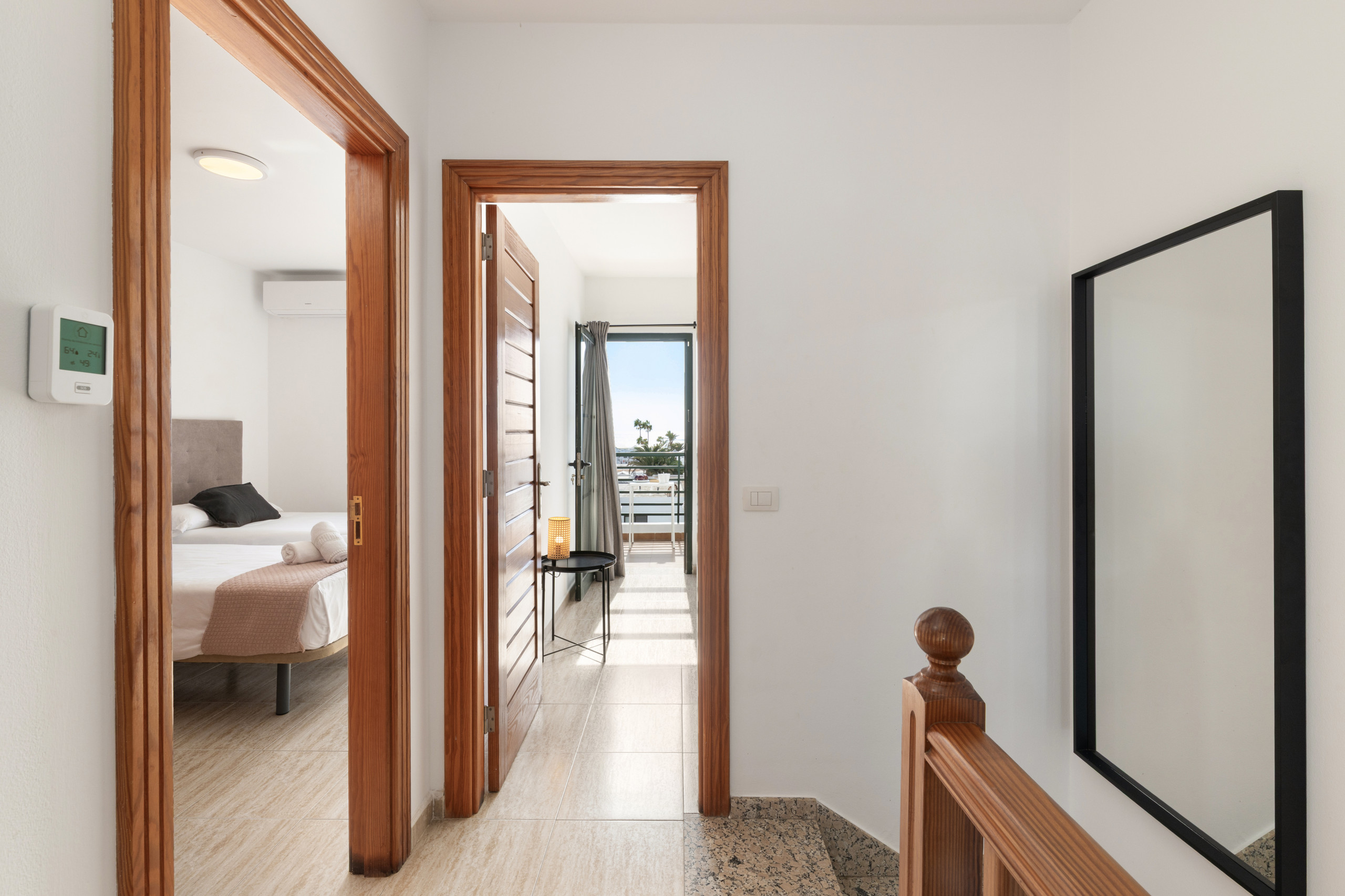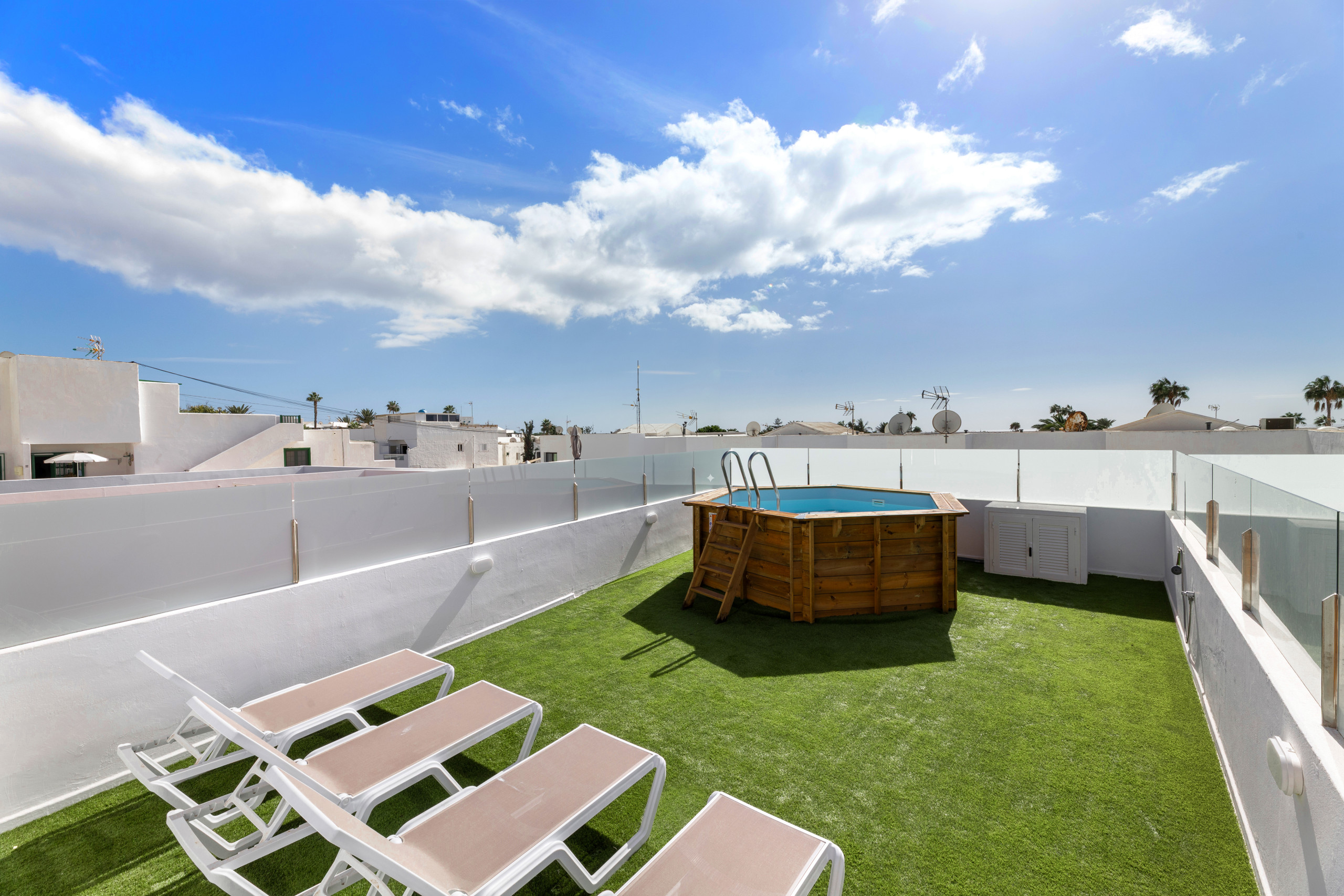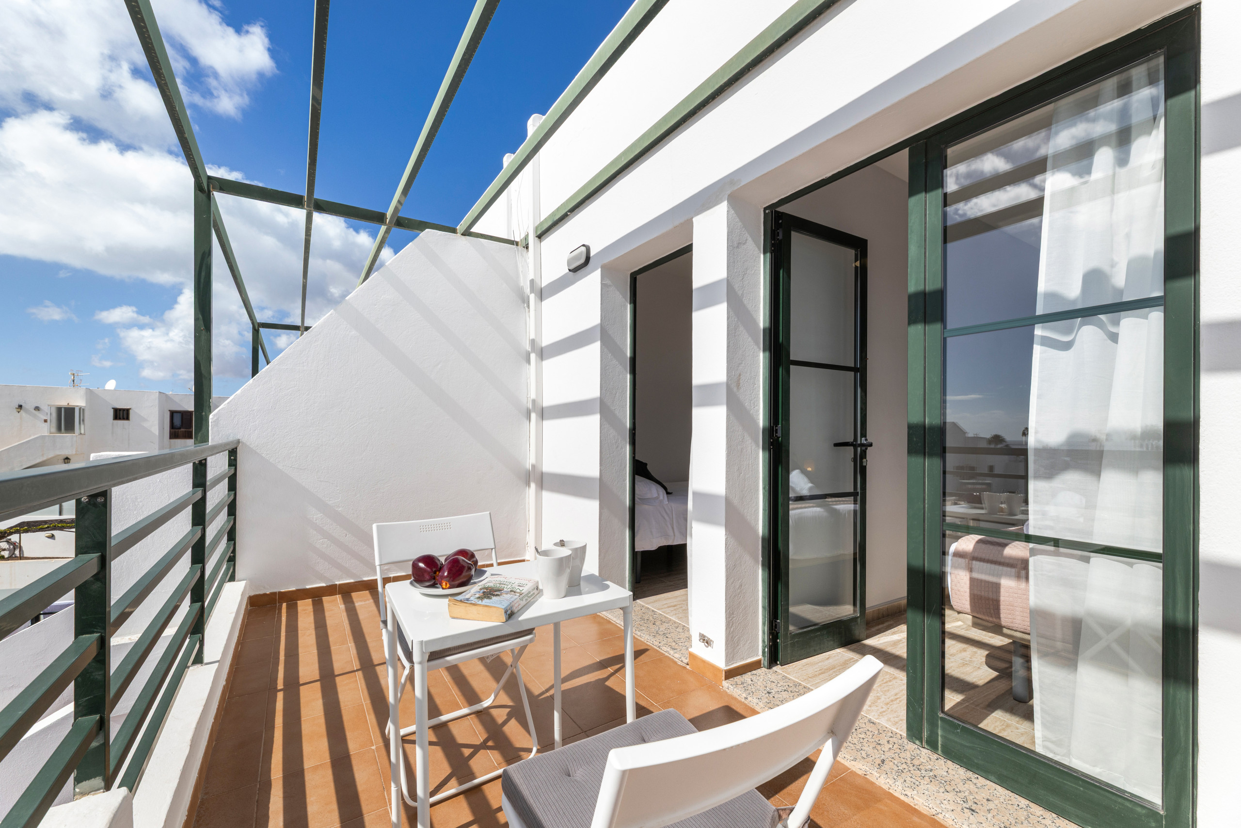 Nuestros modernos dúplex ofrecen un amplio espacio para disfrutar de tus vacaciones con total comodidad. En la planta baja, encontrará una cocina totalmente reformada, equipada con menaje y electrodomésticos propios de un hogar. El amplio salón-comedor, con acceso a una terraza amueblada, es el lugar perfecto para disfrutar de momentos de tranquilidad y compañía. Además, en este espacio exterior, podrás relajarte en una piscina privada de 3 x 3. La planta baja cuenta con un baño completo con ducha. En la planta alta, a la que se accede por escaleras internas, se encuentran tres dormitorios. Disponen de una cama de matrimonio con ropero empotrado. El segundo dormitorio cuenta con dos camas individuales de 90 cm y ropero empotrado, y el tercero tiene una cama individual de 90 cm. Además, en esta planta se encuentra un baño completo con ducha y un balcón con vistas al mar. Este dúplex tiene capacidad para hasta 5 personas más un bebé (cuna disponible bajo previa petición). No dispone de camas supletorias ni sofá cama. Entre otros servicios, el alojamiento ofrece Wi-Fi gratuito en las instalaciones, y fácil aparcamiento (no privado). Los dúplex no dispone de aire acondicionado, ventiladores ni calefactores. Ideal para familias, grupos de amigos y trabajadores en remoto.