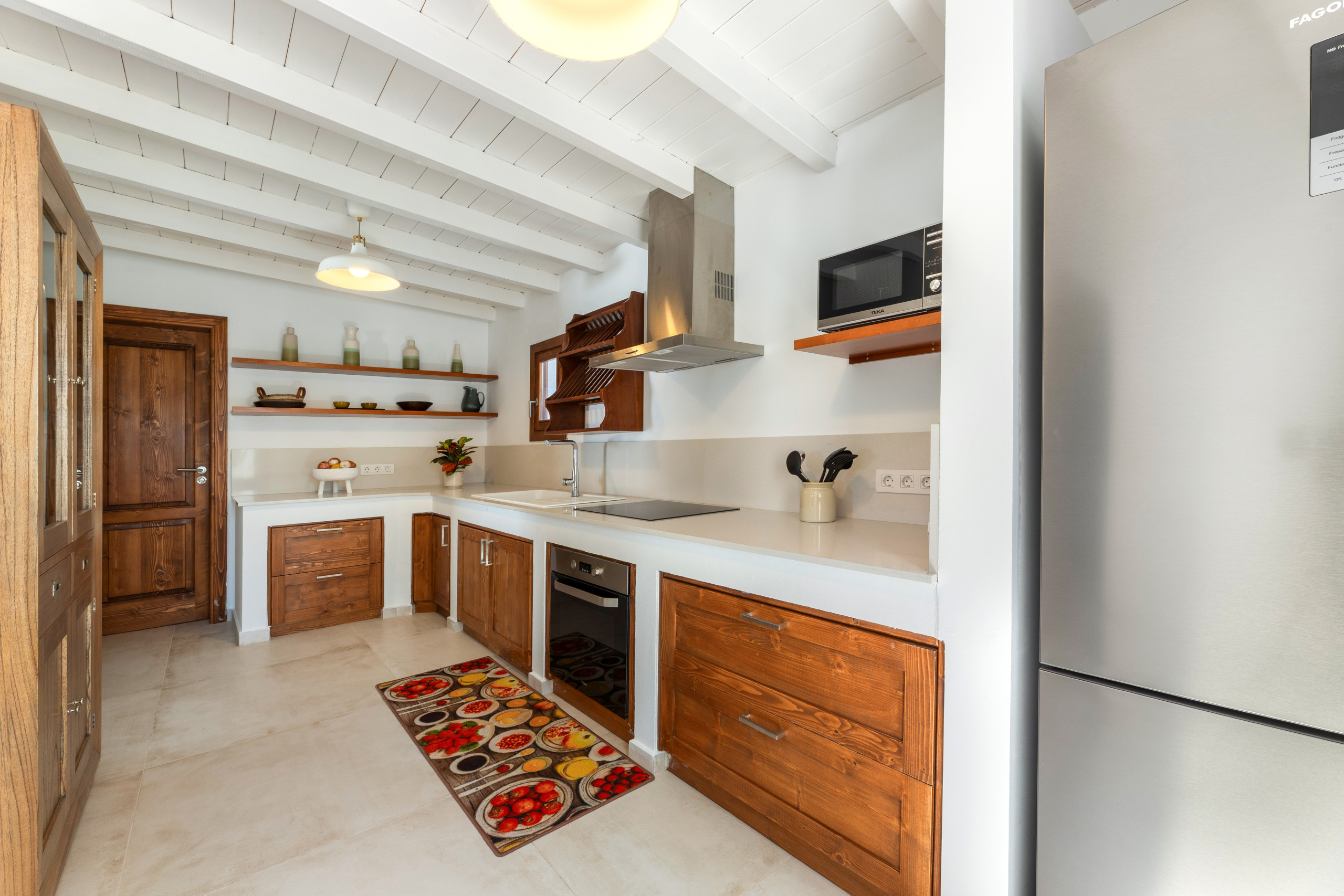 La vivienda dispone de dos dormitorios: el principal, en suite, cuenta con vestidor, ducha y bañera; el segundo dormitorio ofrece también un moderno baño con ducha. La zona de día se distribuye en un amplio salón familiar, comedor independiente, cocina de generosas dimensiones, despensa y cuarto de lavado, pensados para ofrecer confort y funcionalidad durante toda la estancia.