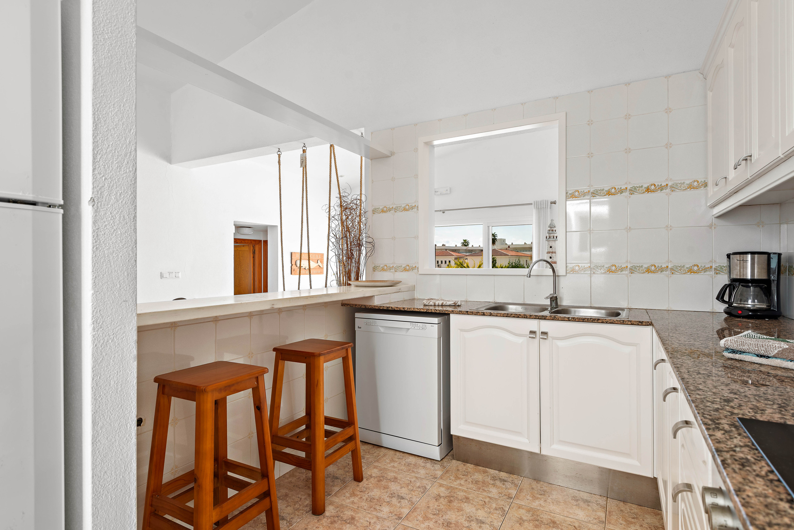 La cocina americana está totalmente equipada con electrodomésticos como nevera, congelador, lavadora, lavavajillas, horno, microondas y cafetera, facilitando la preparación de tus comidas.
