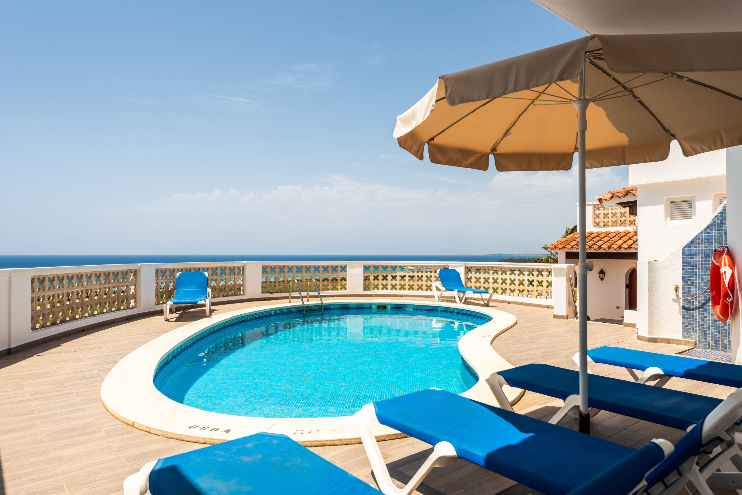 Zona de piscina con terraza, donde podrá relajarse nadando o tomar el sol en una de las tumbonas que la rodean, disfrutando así de los exteriores de la villa.