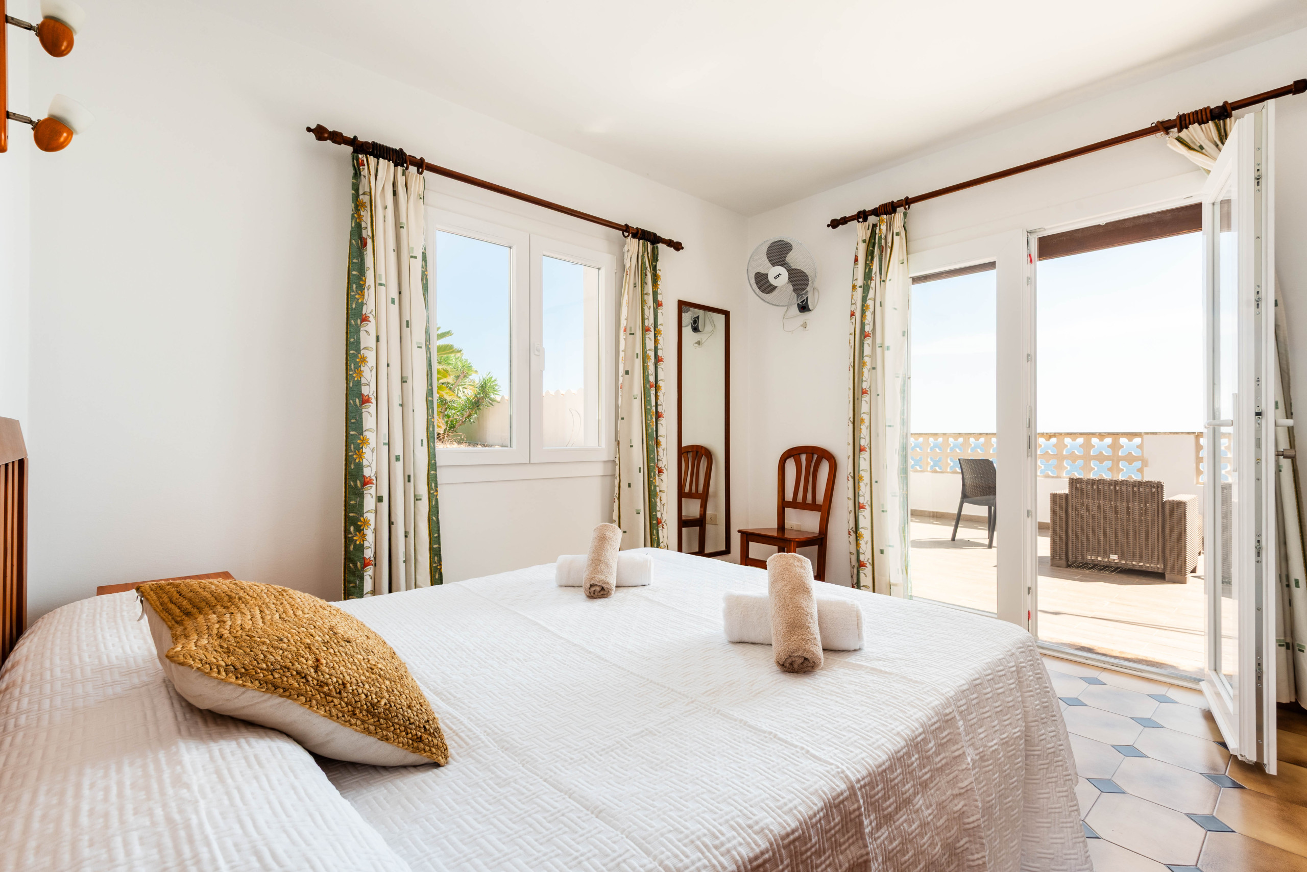 Las habitaciones están ubicadas en la planta alta de la villa, donde encontramos 1 habitación de matrimonio y 2 habitaciones dobles. Todas las habitaciones con terraza y dos de ellas con excelentes vistas al mar. Y 2 baños unos con ducha y el otro con bañera. La villa dispone de ventiladores en los dormitorios.