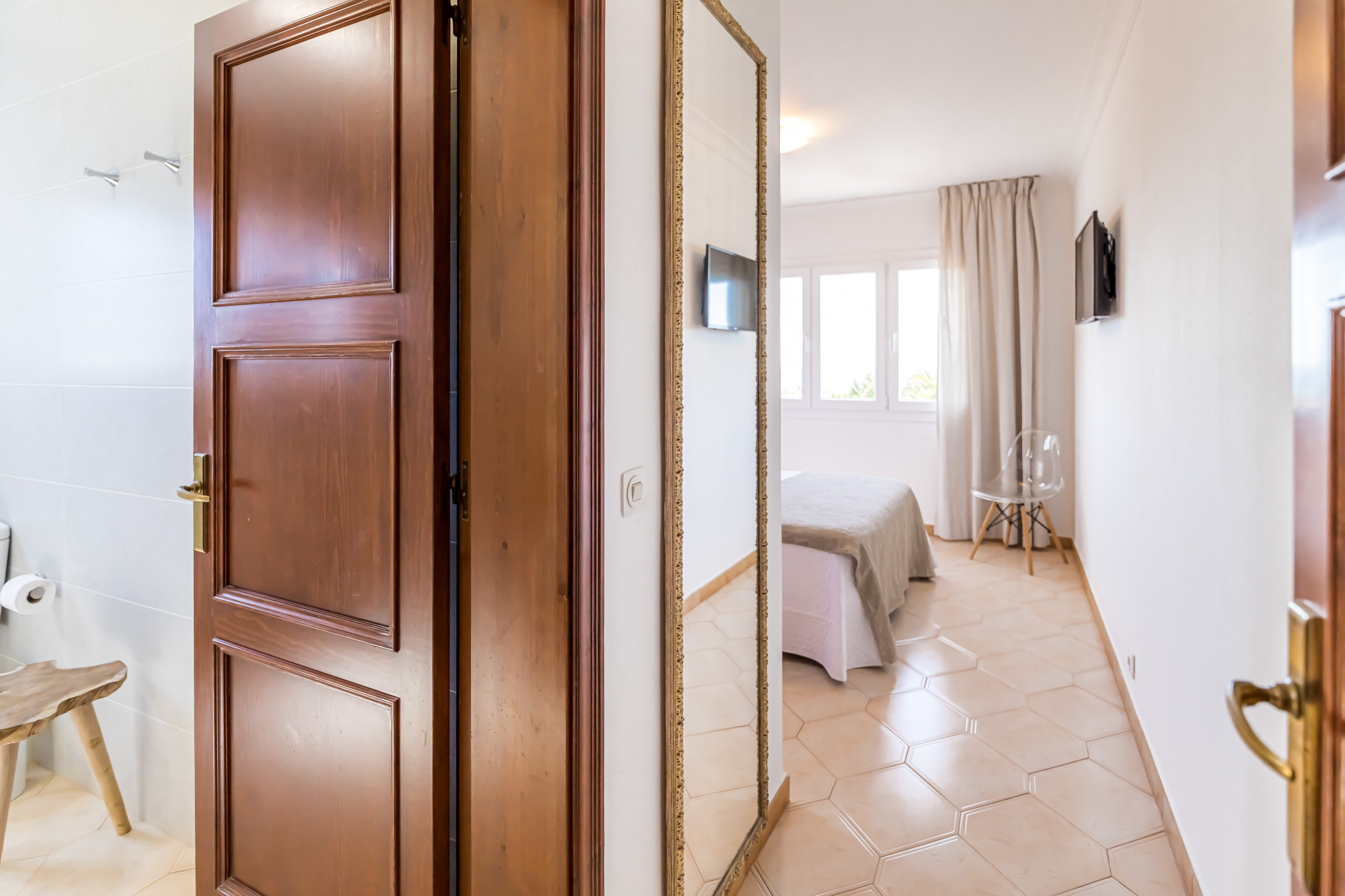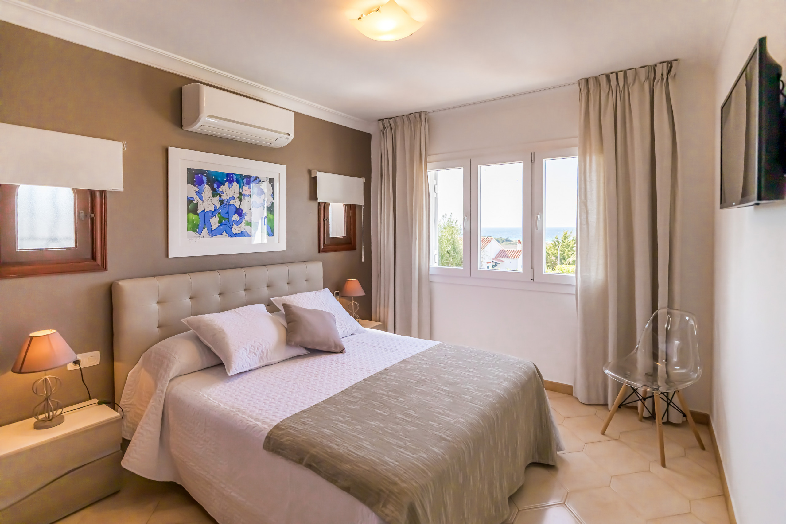 Las habitaciones están ubicadas en la planta alta de la villa, donde encontramos 1 habitación de matrimonio y 2 habitaciones dobles. Todas las habitaciones con terraza y dos de ellas con excelentes vistas al mar. Y 2 baños unos con ducha y el otro con bañera. La villa dispone de ventiladores en los dormitorios.