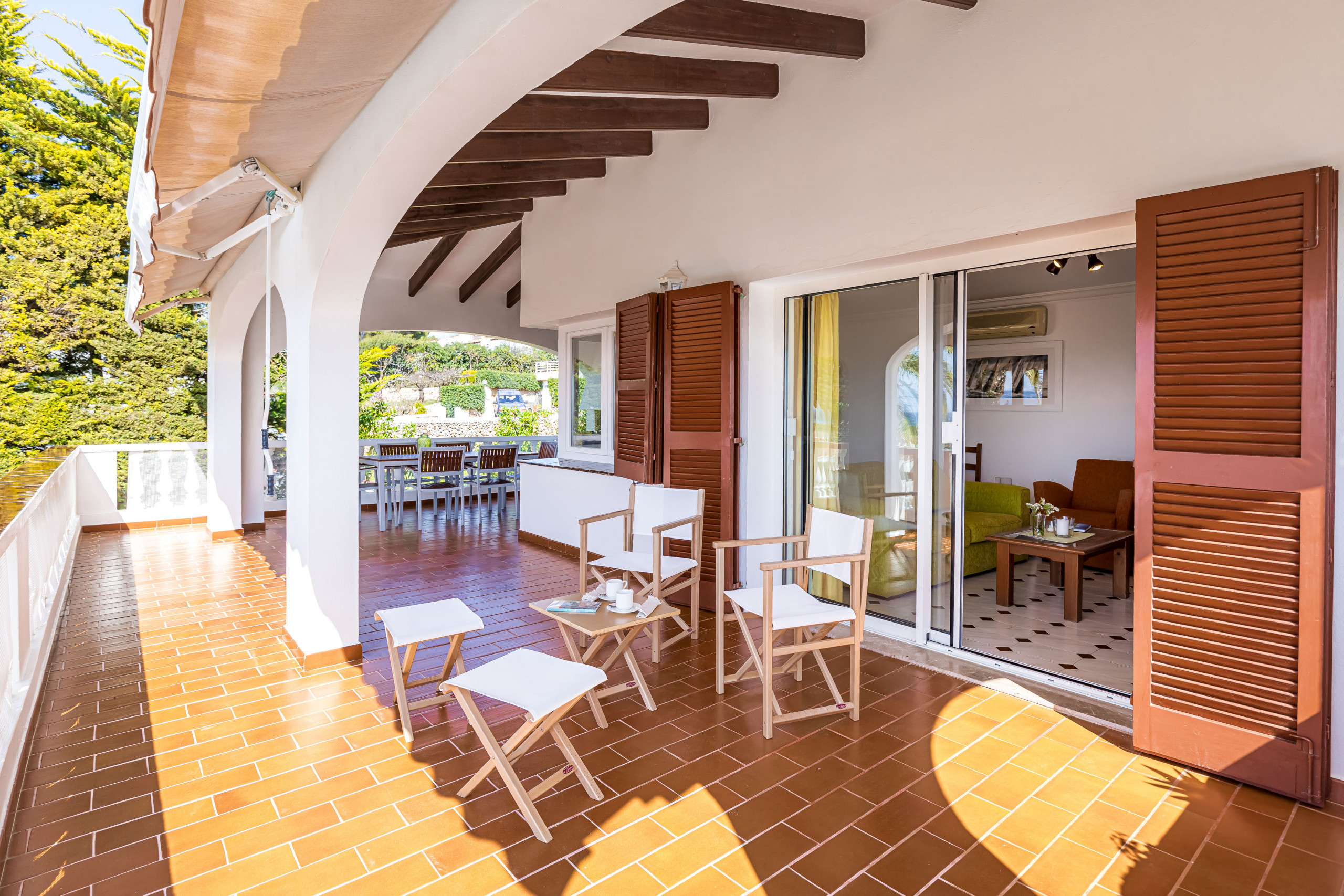 Desde la calle usted sube las escaleras hasta el nivel de la terraza con piscina, separada con 9 peldaños de la terraza con porche y acceso a la villa. Estupendo salón comedor estar con TV, aire acondicionado y abierto por un arco se encuentra la cocina totalmente equipada.