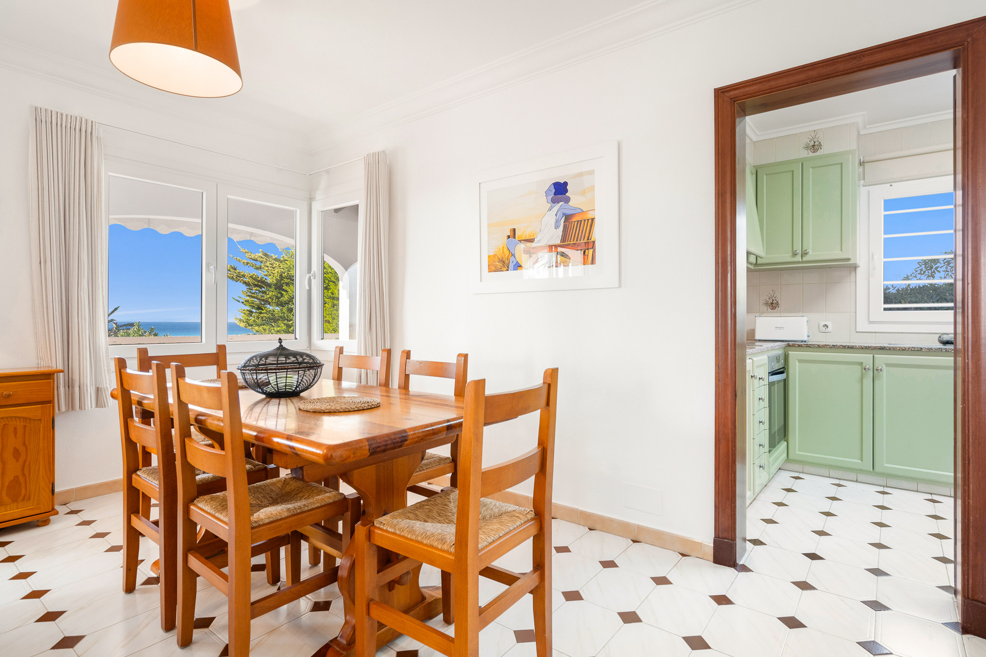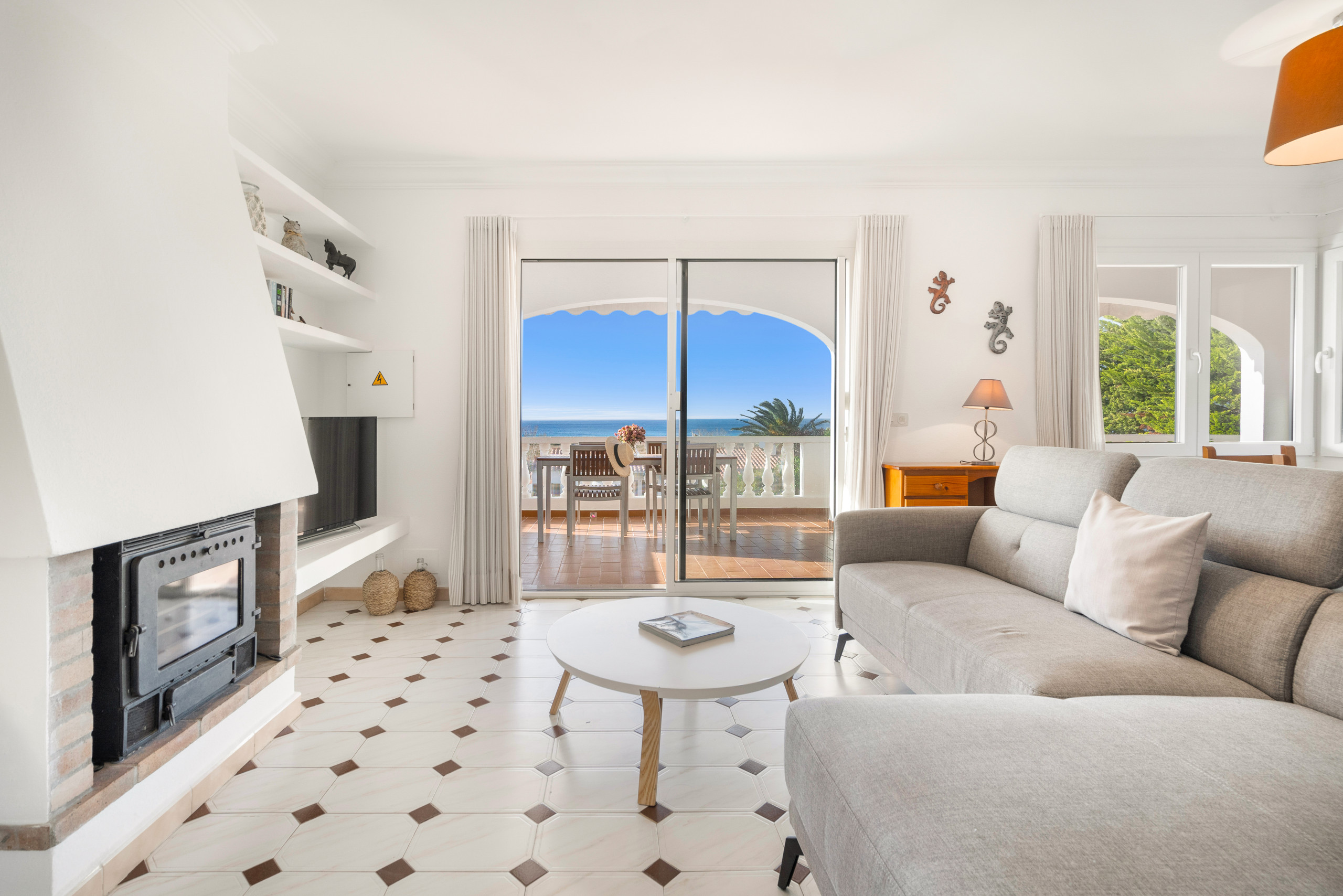 El salón con aire acondicionado y el comedor equipados con TV con canales digitales y Wifi gratuito, cómodamente amueblado y equipado, que da acceso a una fantástica terraza donde destacan unas fantásticas vistas al mar y una práctica barbacoa de obra.