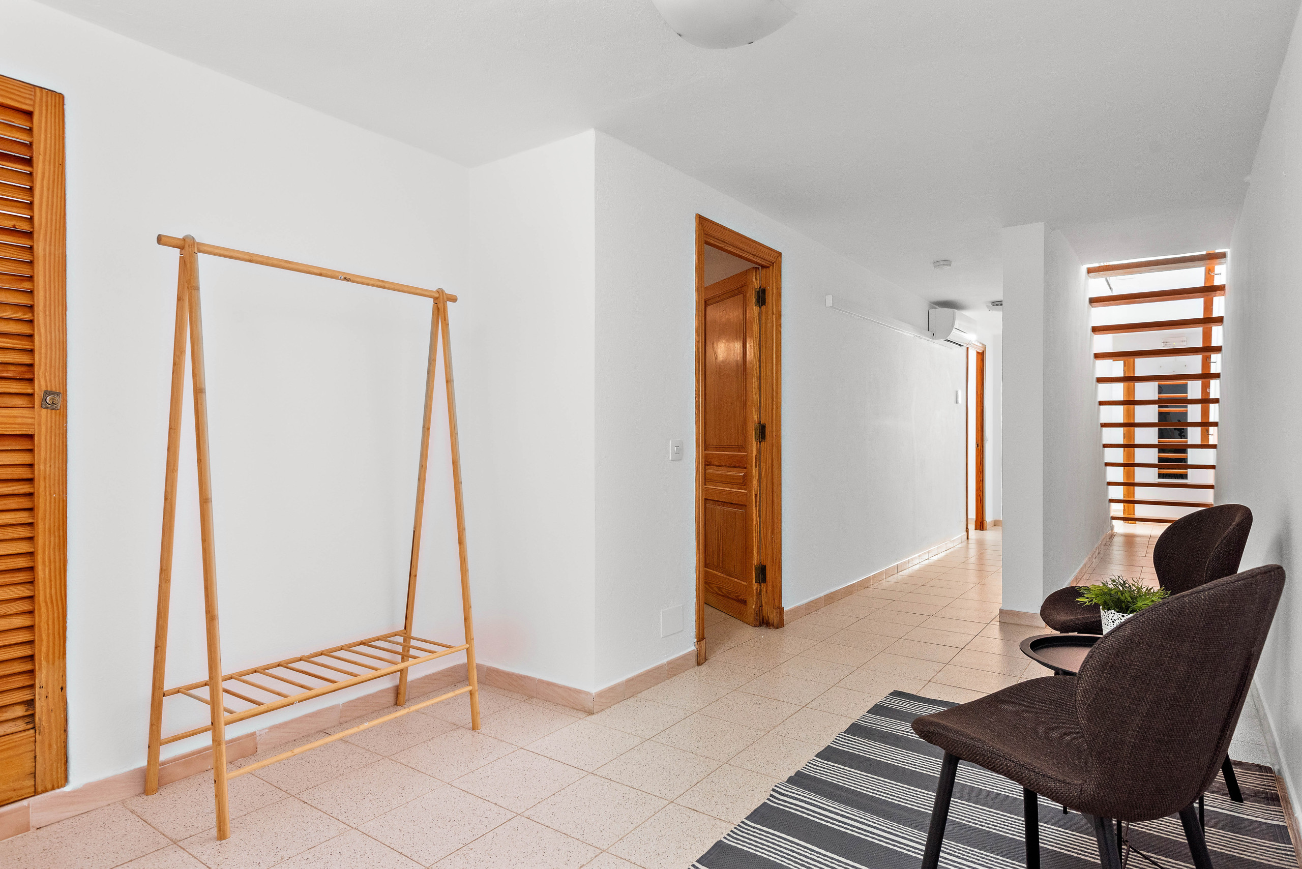 En la planta inferior están ubicados dos dormitorios dobles, un baño común y una habitación de matrimonio con baño privado con bañera. Dispone de aire acondicionado en las zonas comunes de las dos plantas. La zona de la piscina y su terraza ofrecen la posibilidad de disfrutar al máximo de los exteriores de la casa. Todos los dormitorios disponen de ventiladores de techo.