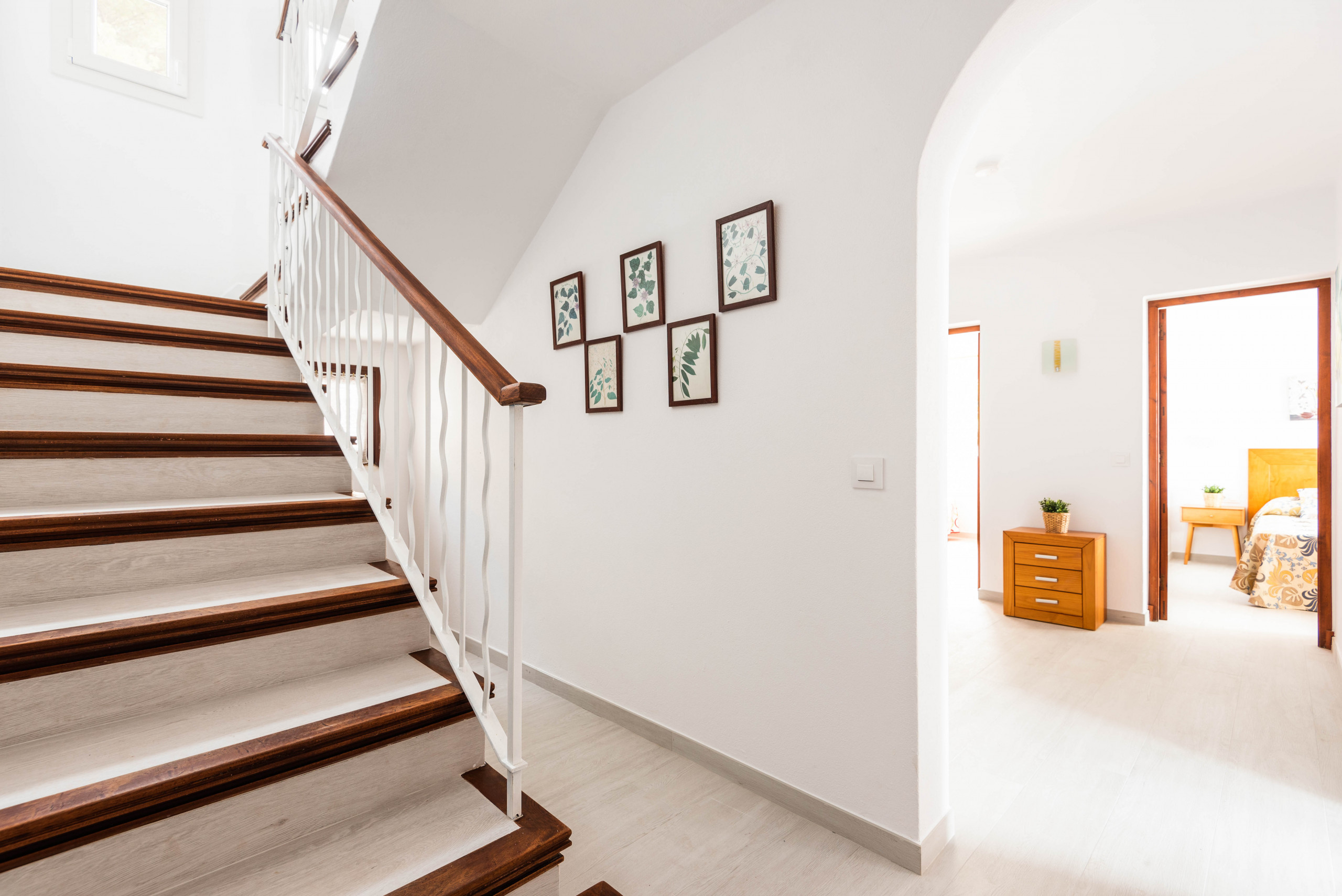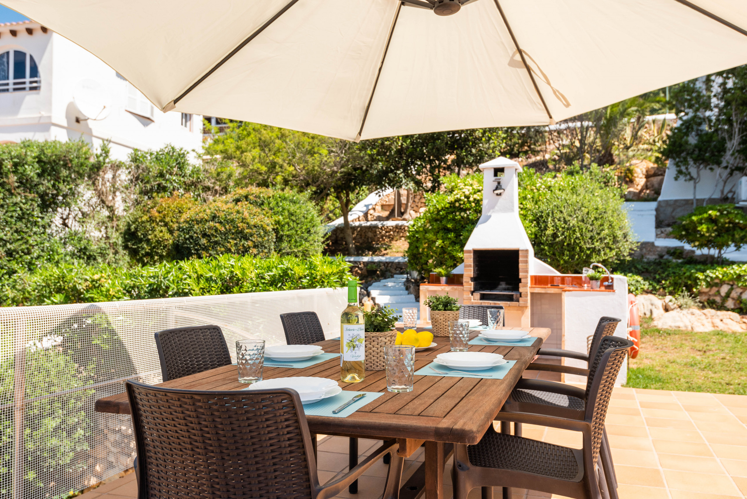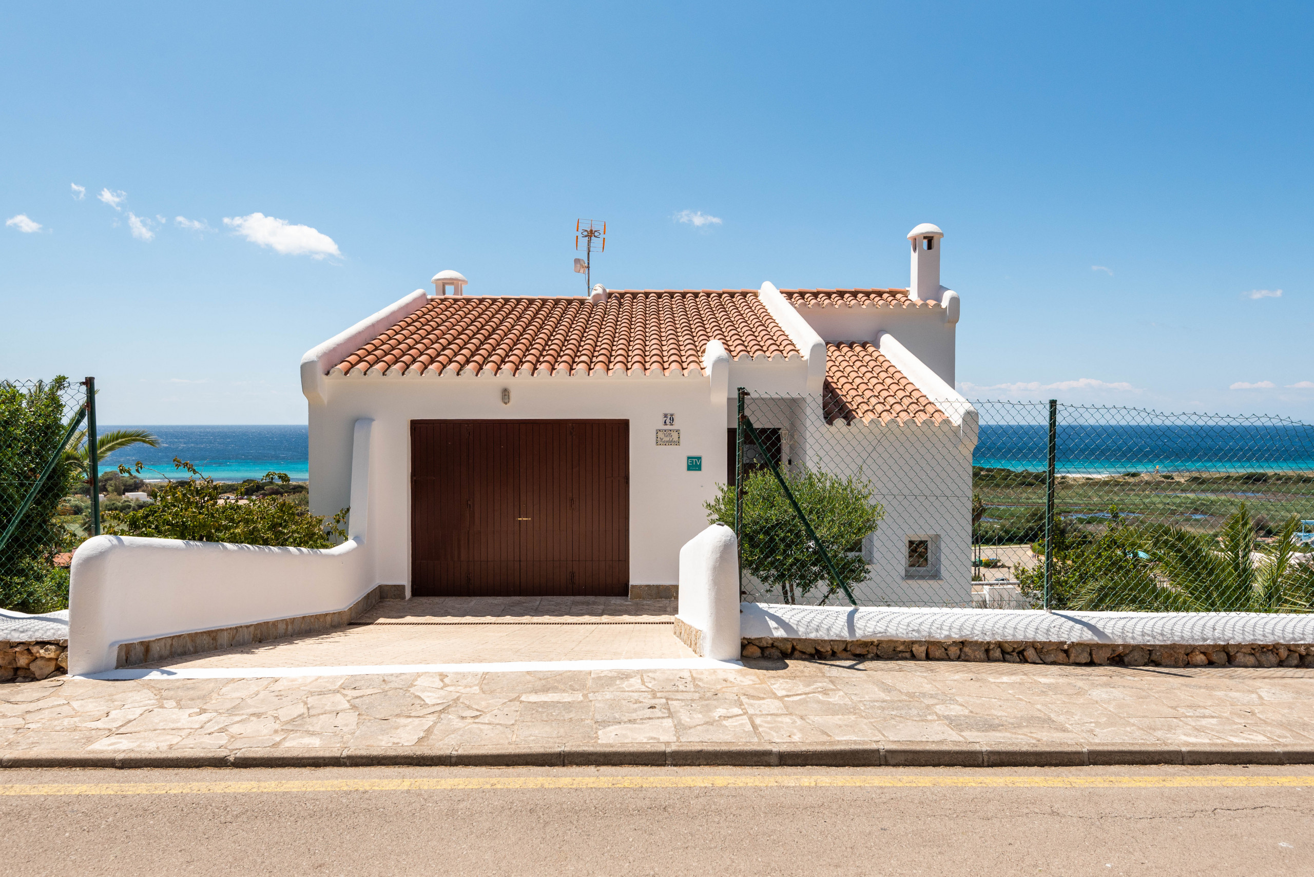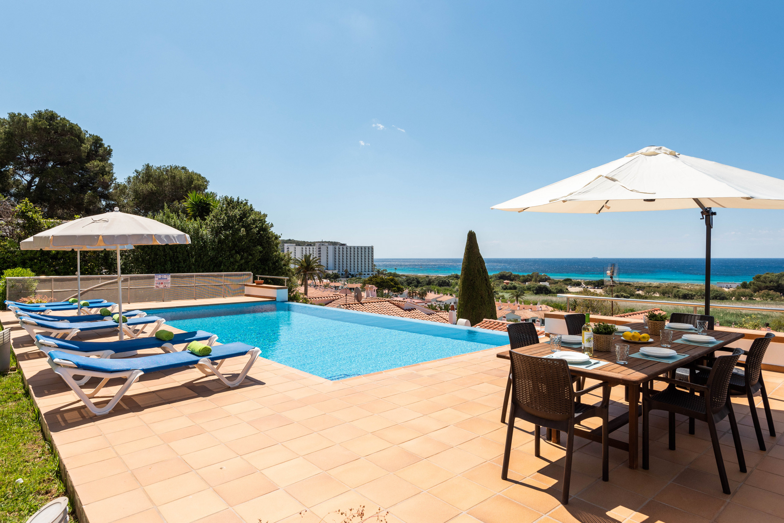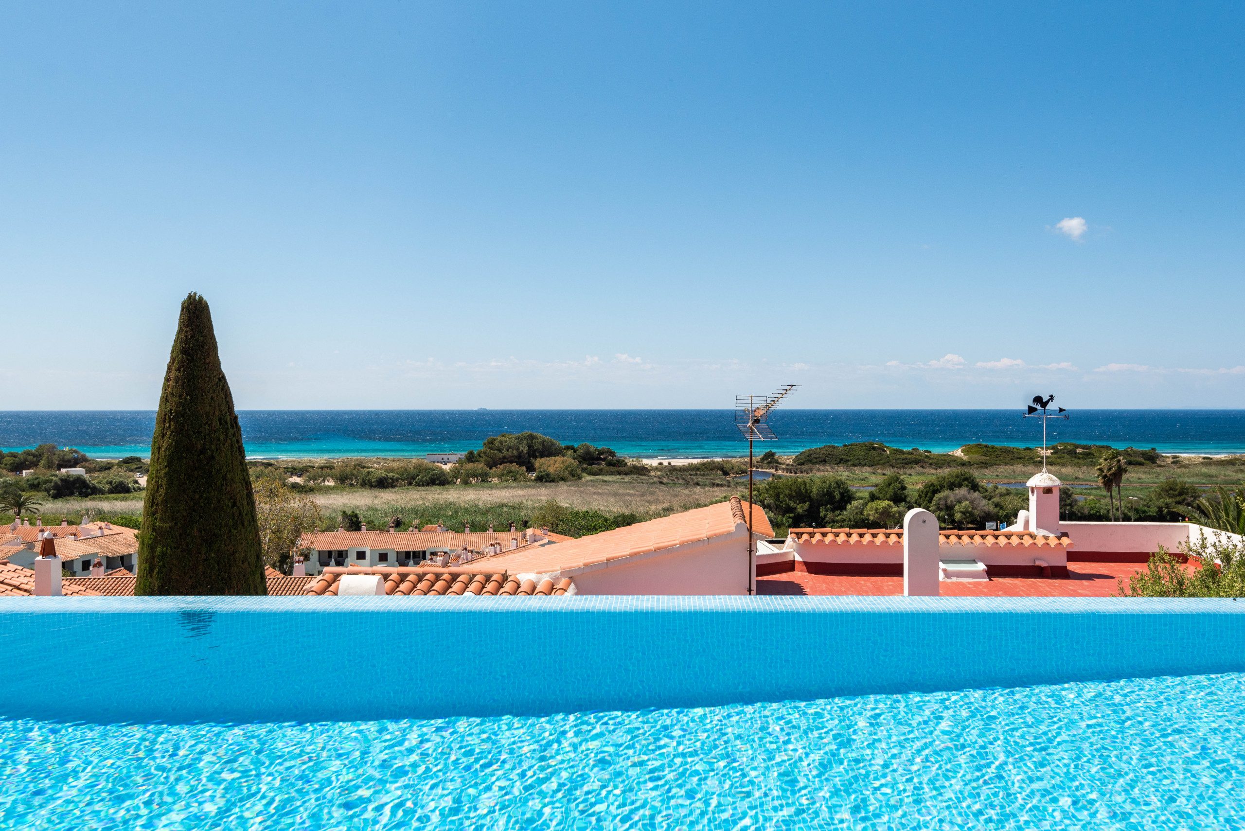 La terraza ofrece unas maravillosas vistas de la playa de Son Bou. Bajando las escaleras, se accede a la planta inferior, donde se encuentran los 3 dormitorios dobles, uno de ellos con cama de matrimonio. Dos de las habitaciones tienen acceso a la terraza y a la zona de la piscina, que cuenta también con una zona de barbacoa y gran solárium con tumbonas para tomar el sol. Toda la parcela está rodeada de una zona ajardinada.