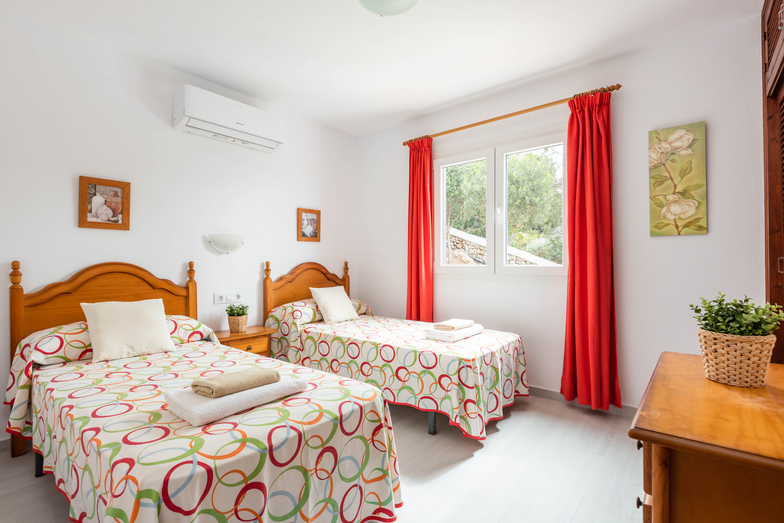 La villa consta de tres dormitorios, uno de ellos con cama de matrimonio, aire acondicionado y con acceso a la terraza con vistas y las otras dos habitaciones con camas individuales y ventiladores de techo. 2 Baños compartidos uno con bañera y el otro con ducha. Amplia terraza cubierta con mobiliario exterior para disfrutar las puestas de sol. Gran piscina y una cómoda área para disfrutar de una barbacoa.