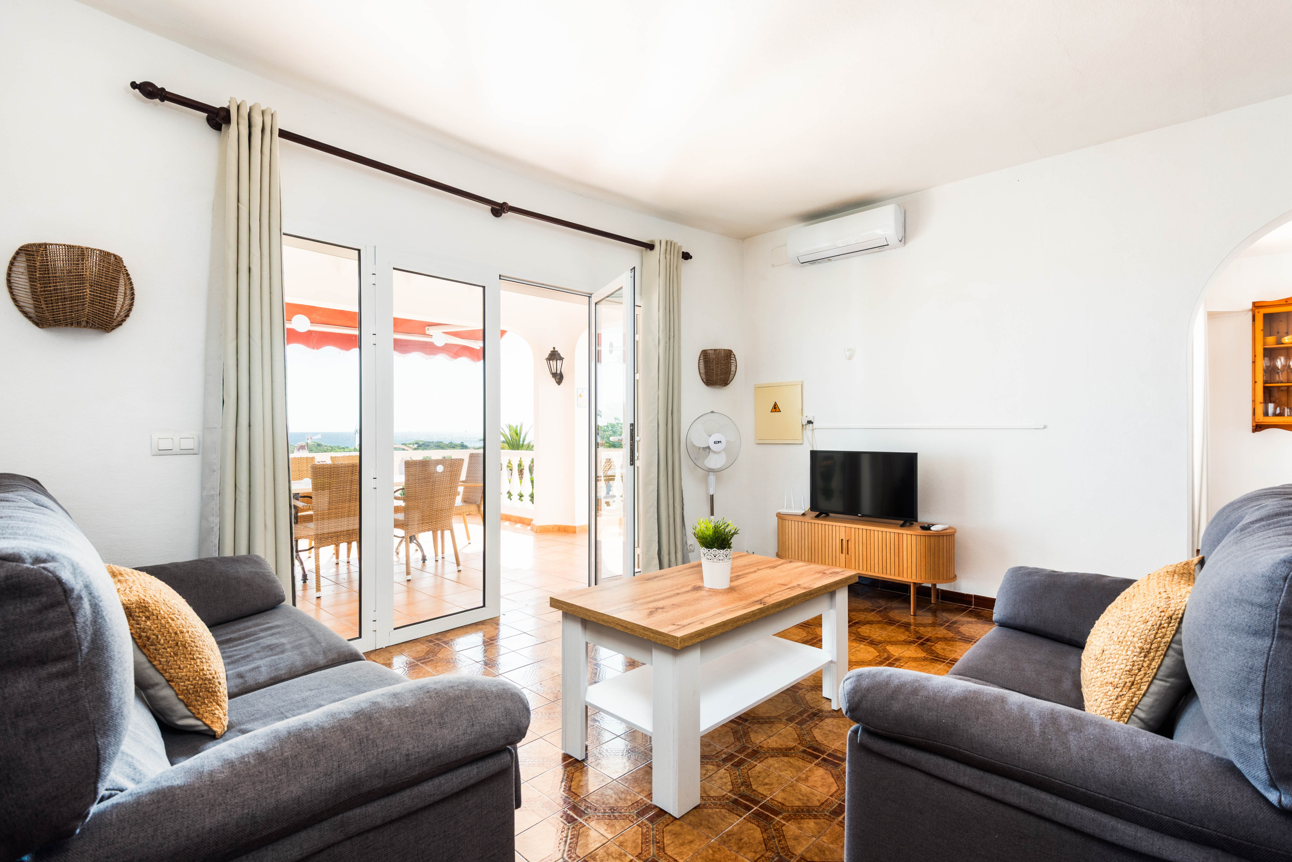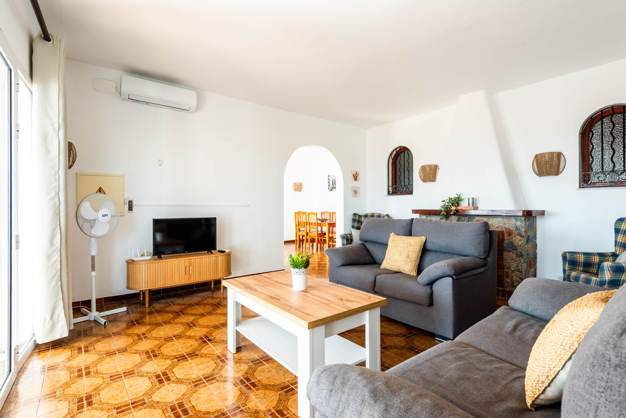 Desde la calle usted sube las escaleras hasta el nivel de la terraza con piscina, separada con 9 peldaños de la terraza con porche y acceso a la villa. Estupendo salón comedor estar con TV, aire acondicionado y abierto por un arco se encuentra la cocina totalmente equipada.
