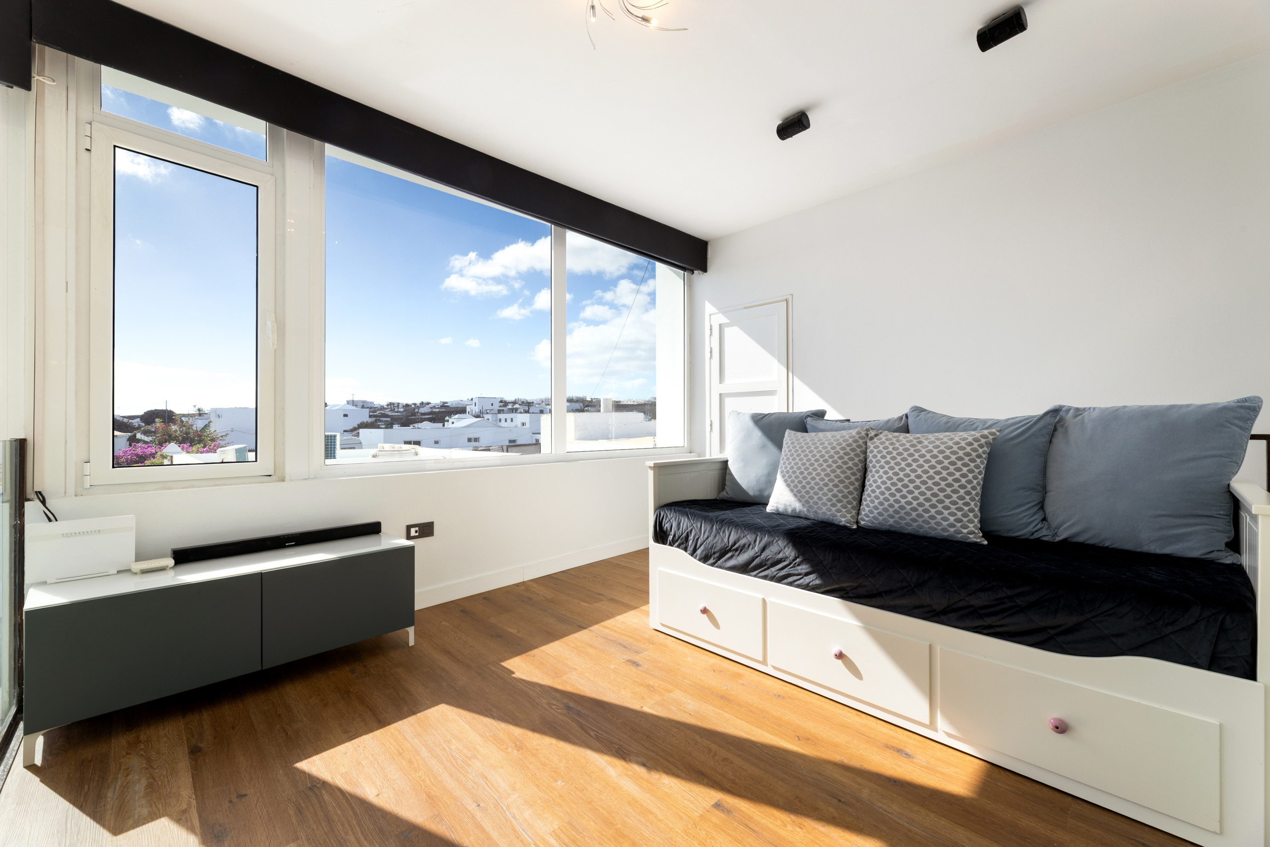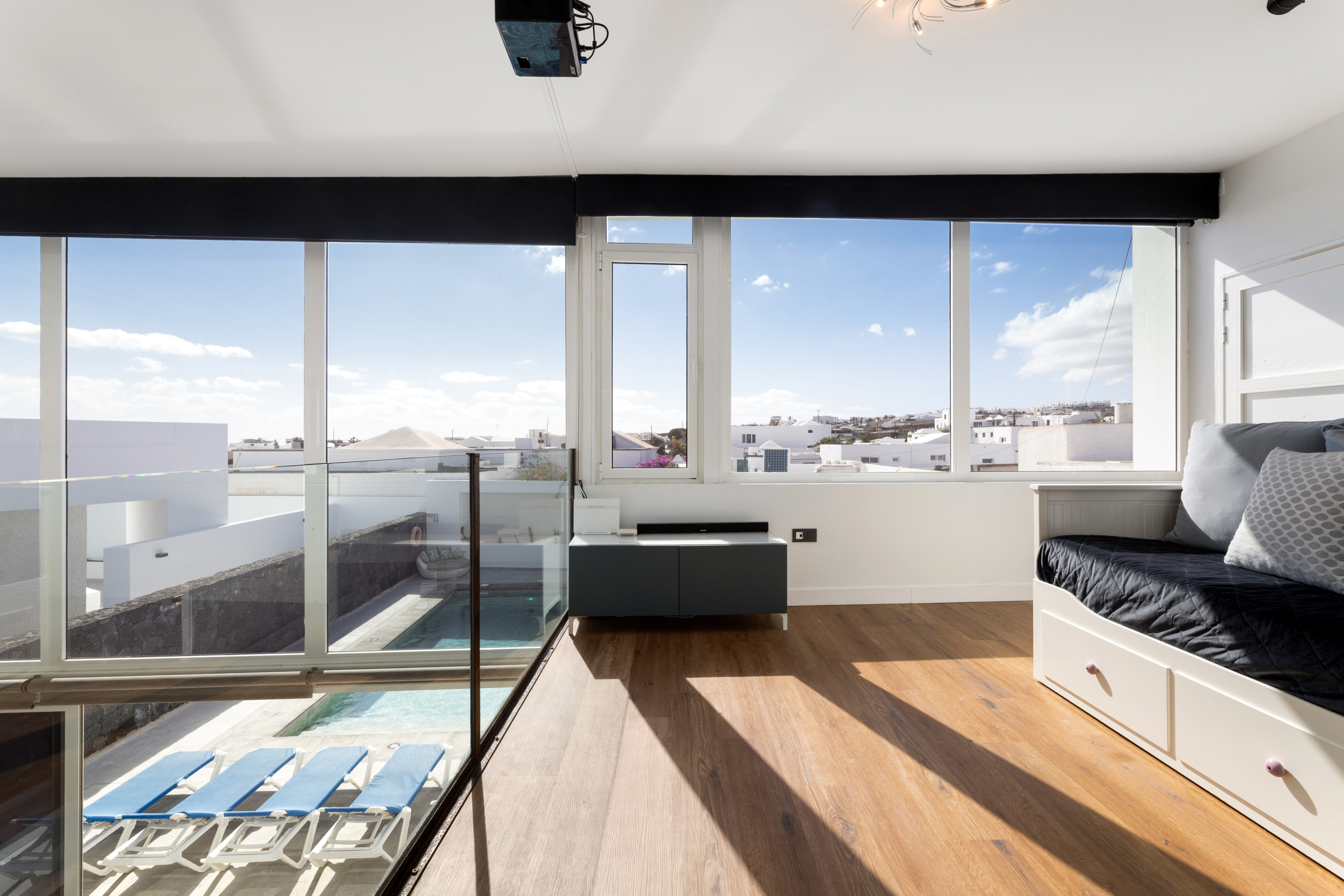 encuentra un pequeño recibidor, desde el que proyectar series, películas, etc. Dormitorio