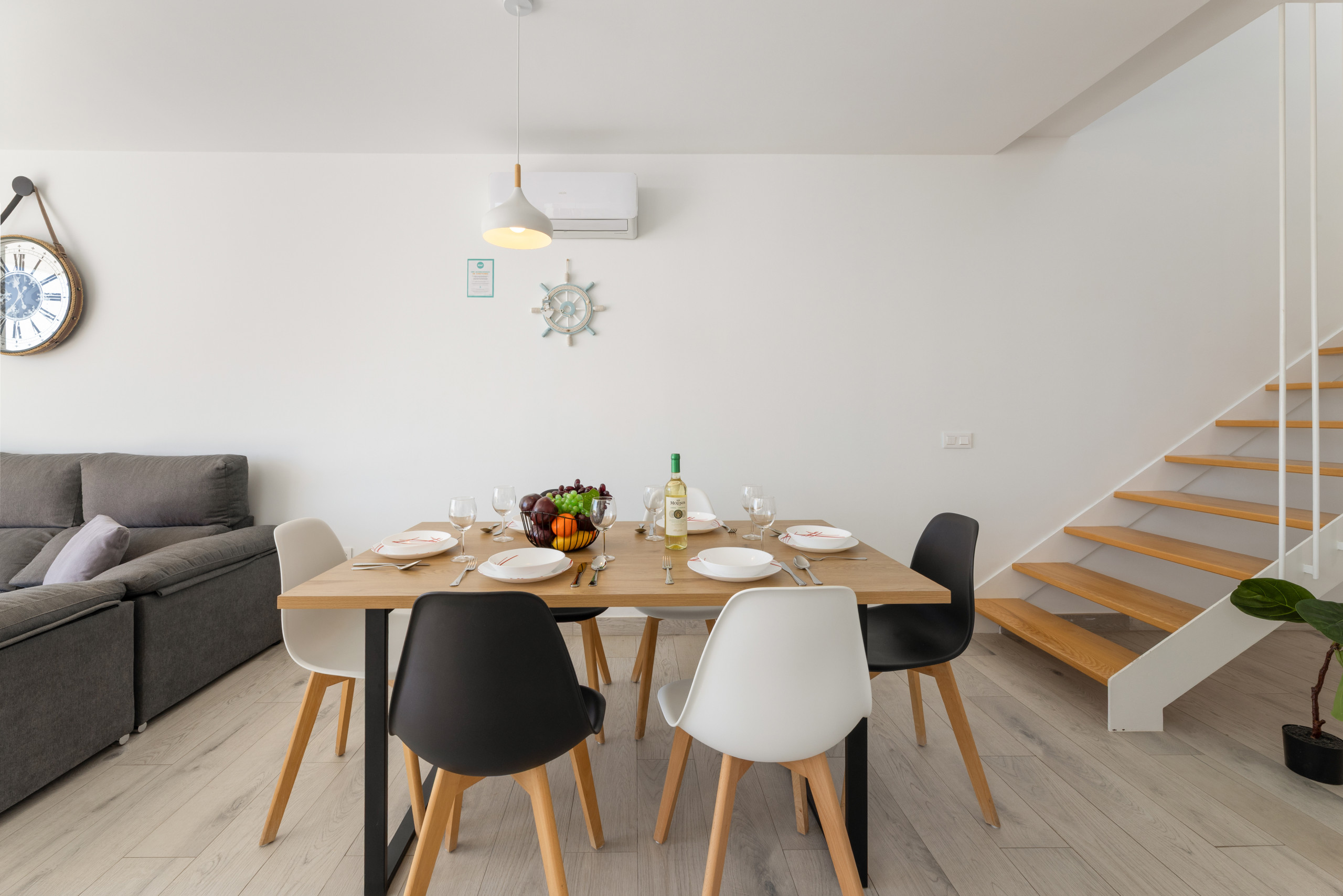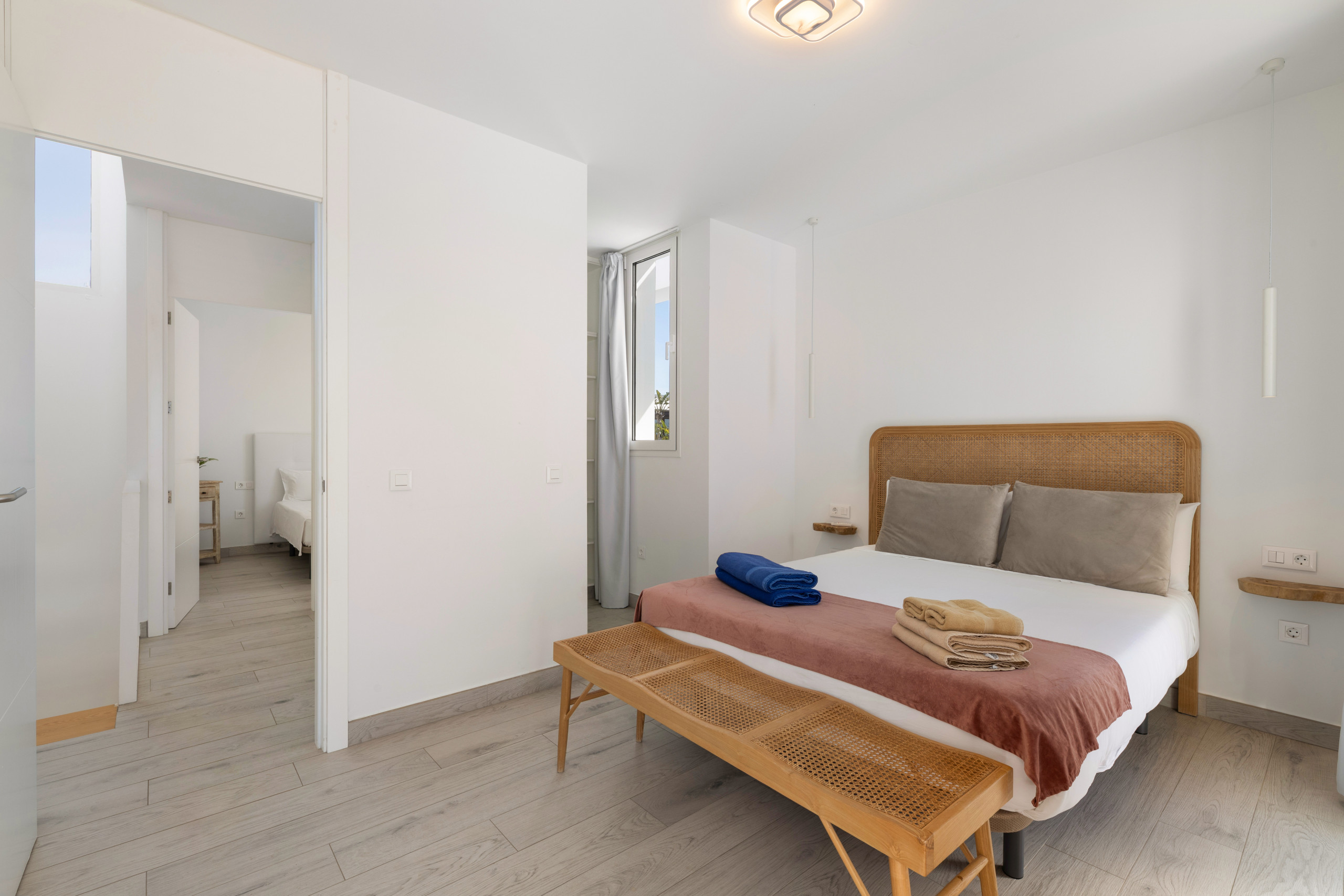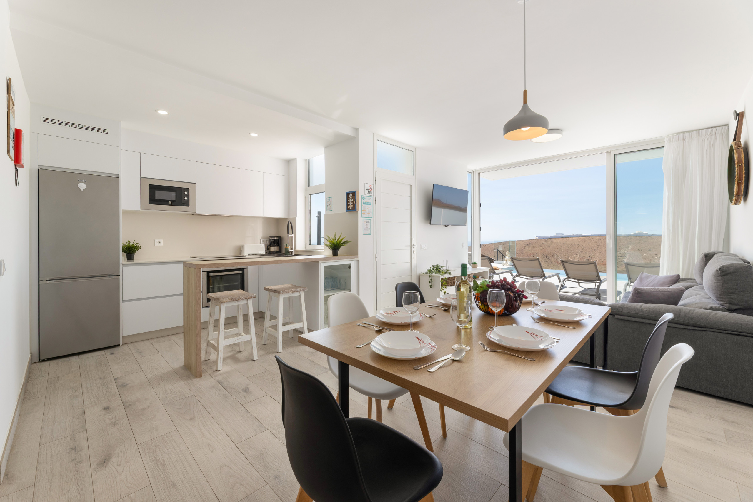 La propiedad dispone de tres amplios dormitorios y dos baños de estilo contemporáneo, ofreciendo un espacio cómodo y versátil para familias, grupos de amigos y trabajadores en remoto que buscan un ambiente inspirador y tranquilo. Su cocina totalmente equipada, elegante y funcional, permite disfrutar de momentos culinarios con todas las comodidades.