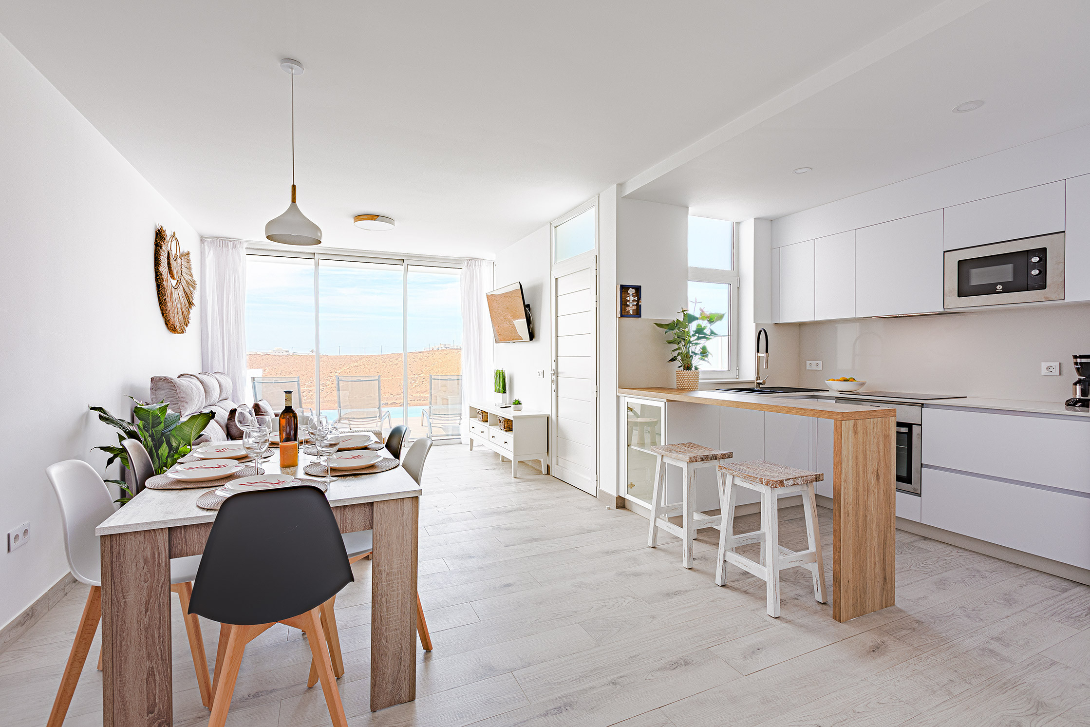La propiedad dispone de tres amplios dormitorios y dos baños de estilo contemporáneo, ofreciendo un espacio cómodo y versátil para familias, grupos de amigos y trabajadores en remoto que buscan un ambiente inspirador y tranquilo. Su cocina totalmente equipada, elegante y funcional, permite disfrutar de momentos culinarios con todas las comodidades.