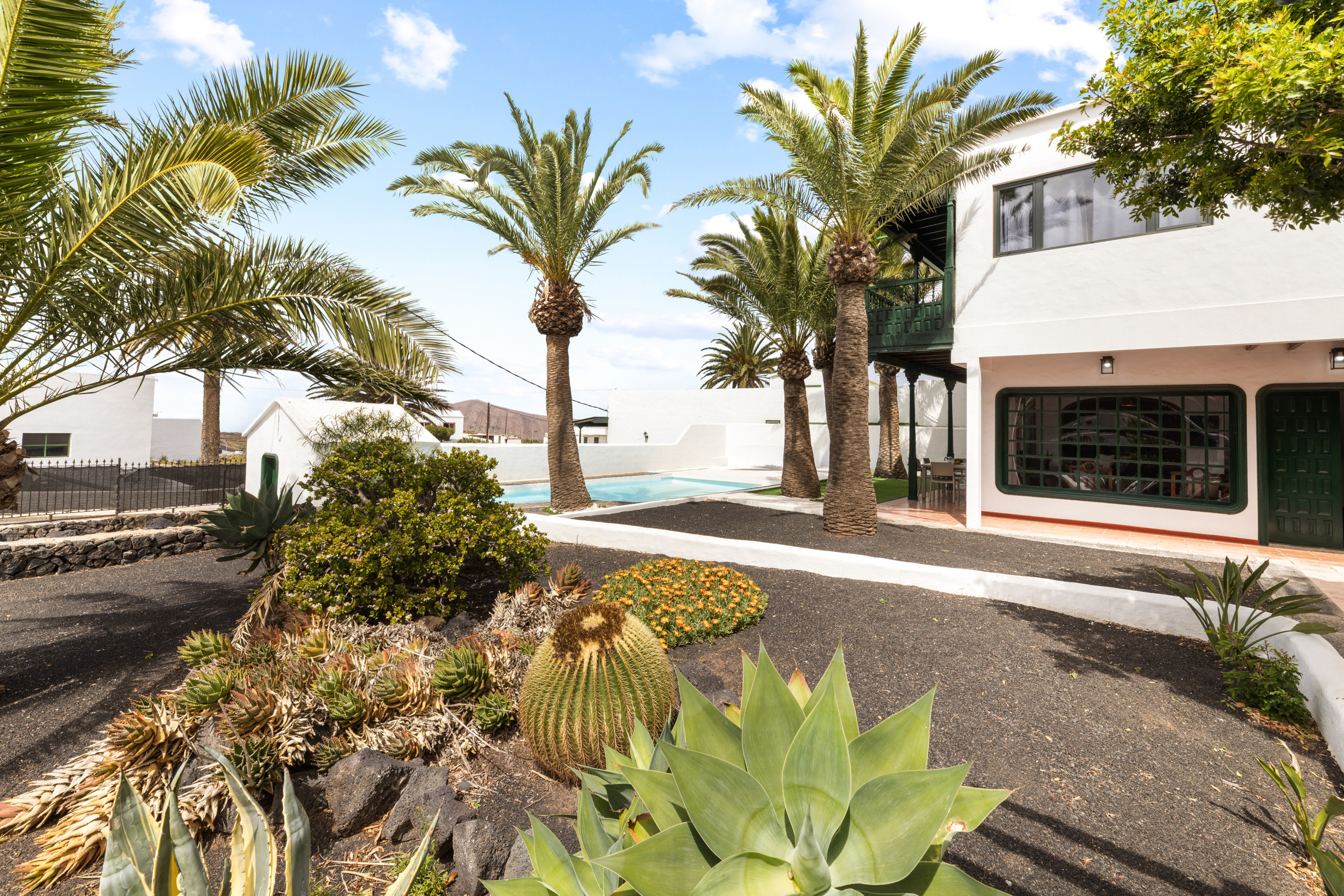 La zona exterior es un auténtico oasis, con una piscina climatizada según temporada y mobiliario de jardín que invita al relax, la lectura o simplemente a disfrutar del clima suave de Lanzarote.