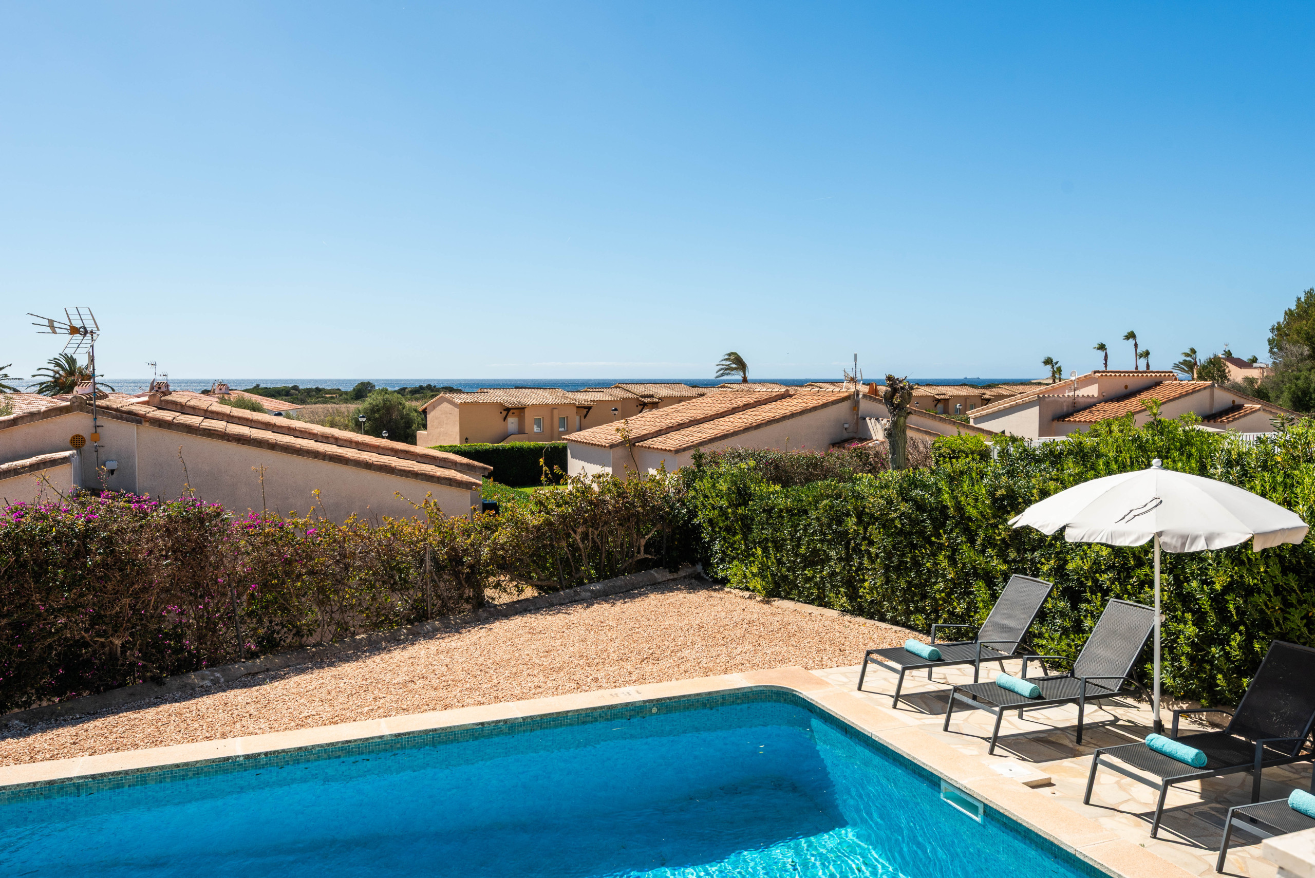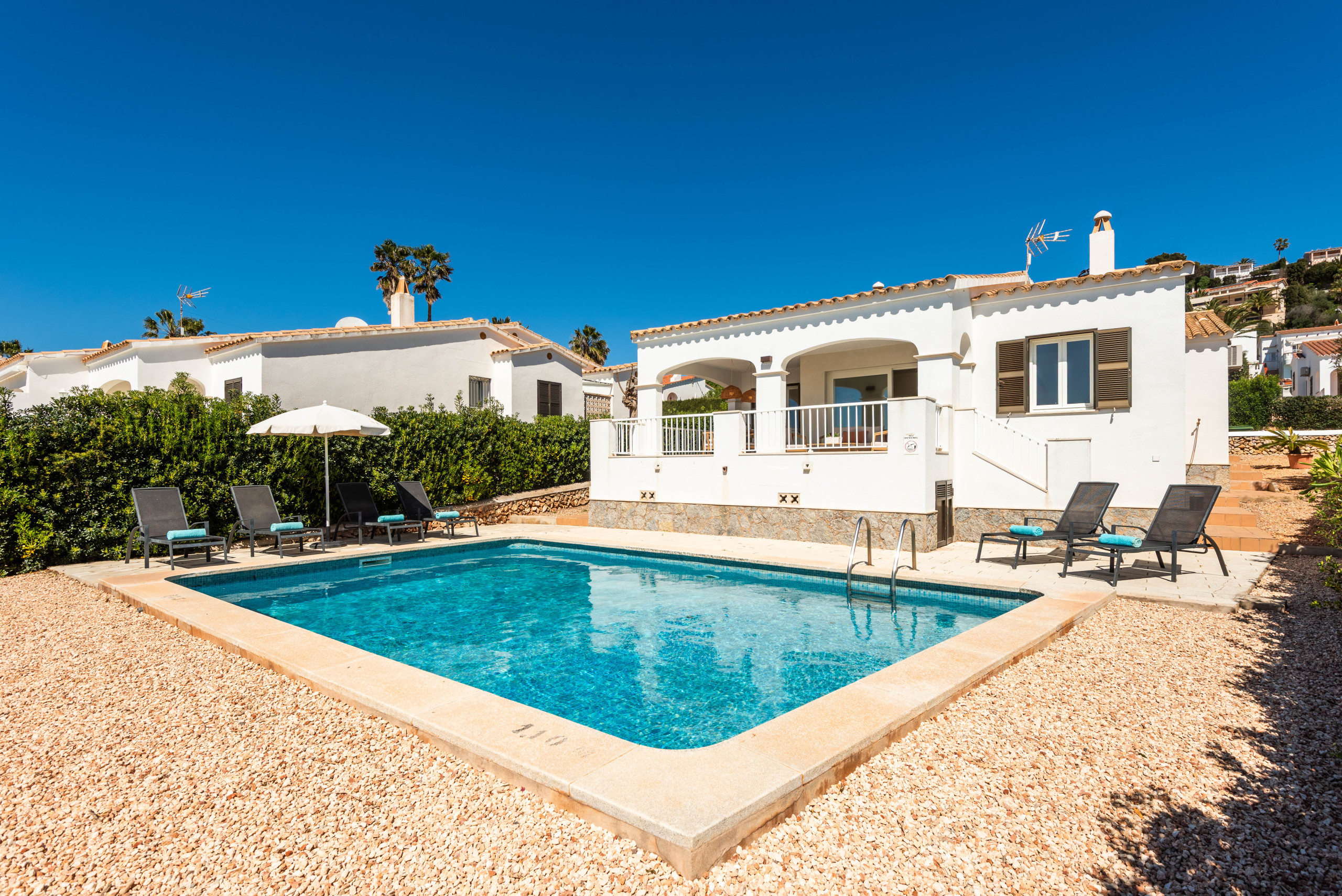 Piscina privada con solárium con hamacas y sombrilla.