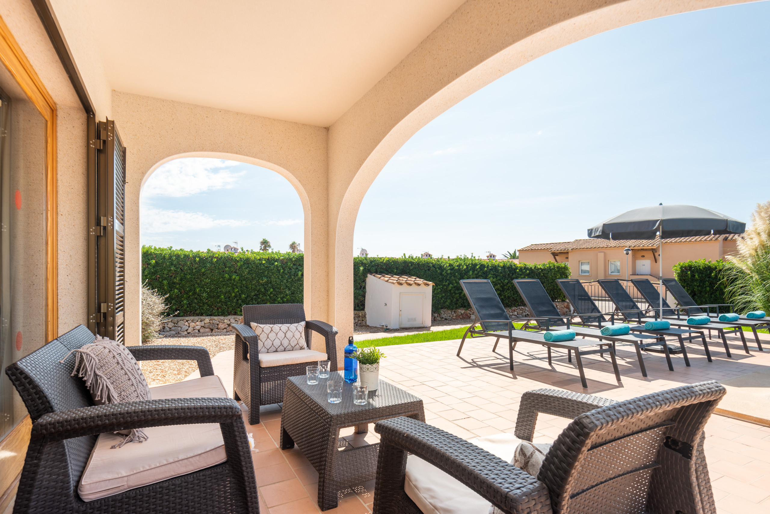. Jardín privado y piscina privada con ducha exterior con 6 hamacas y barbacoa de obra.