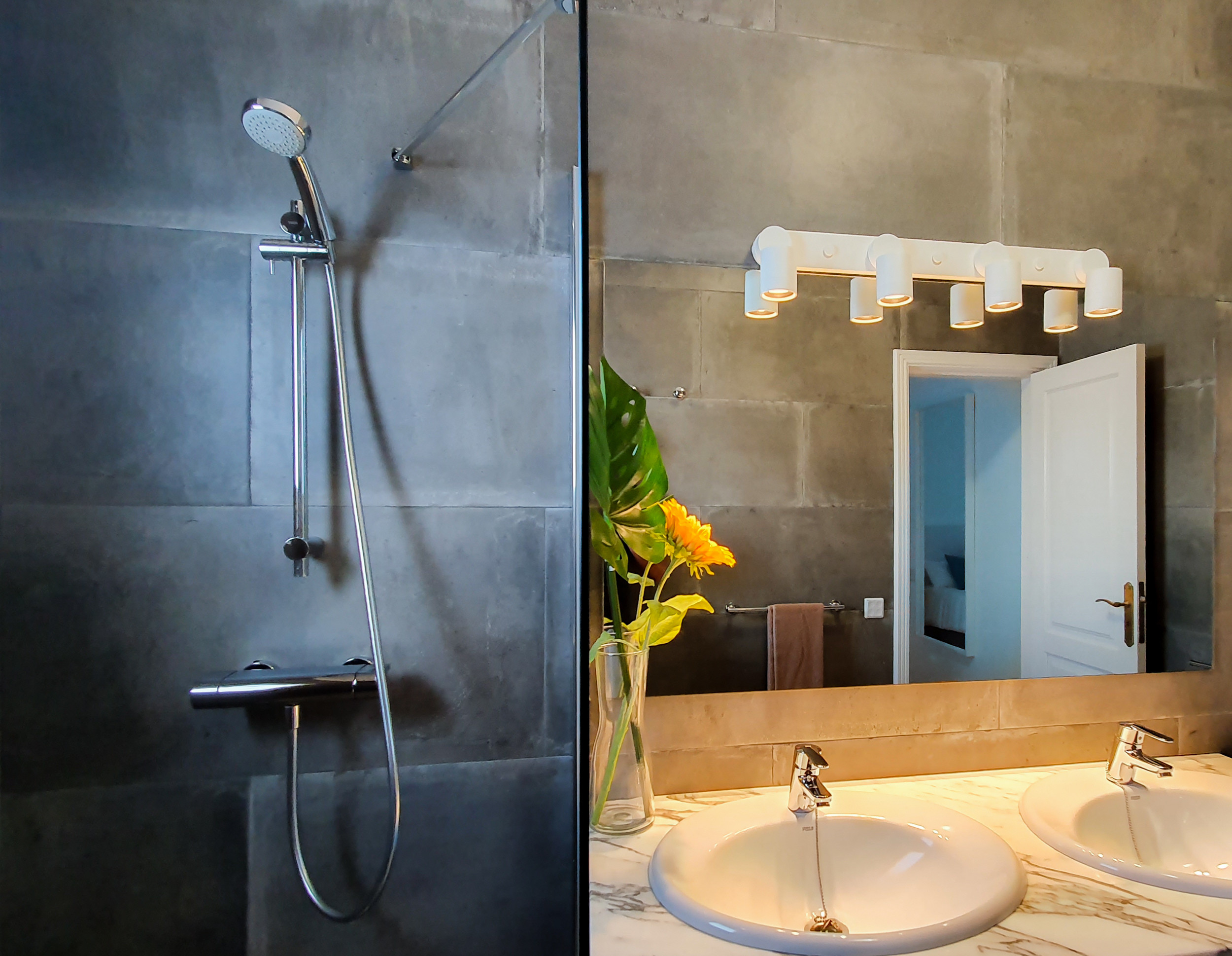 two bedrooms and a bathroom with a double sink and shower. Bright living room with air conditioning and kitchen equipped with an American bar. Fenced outdoor dining area.