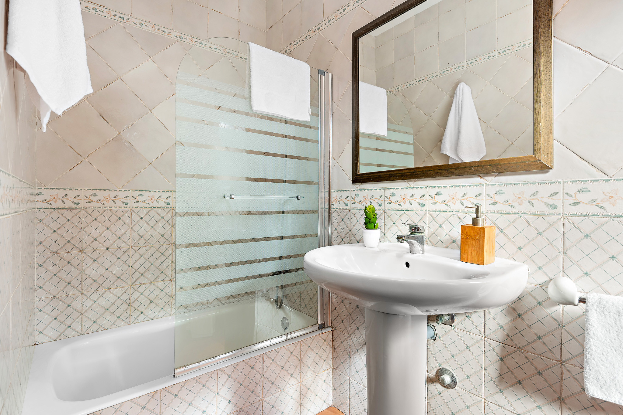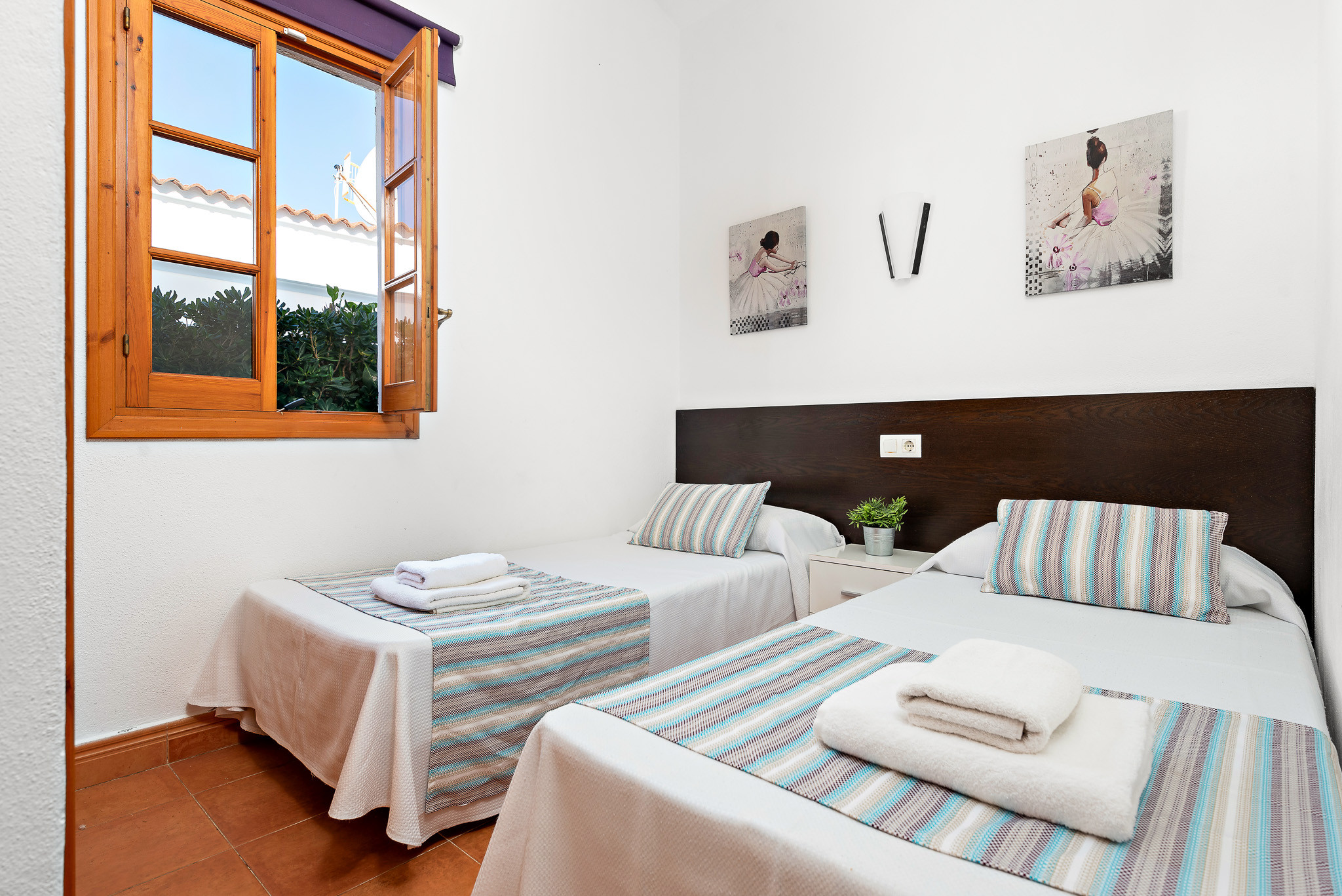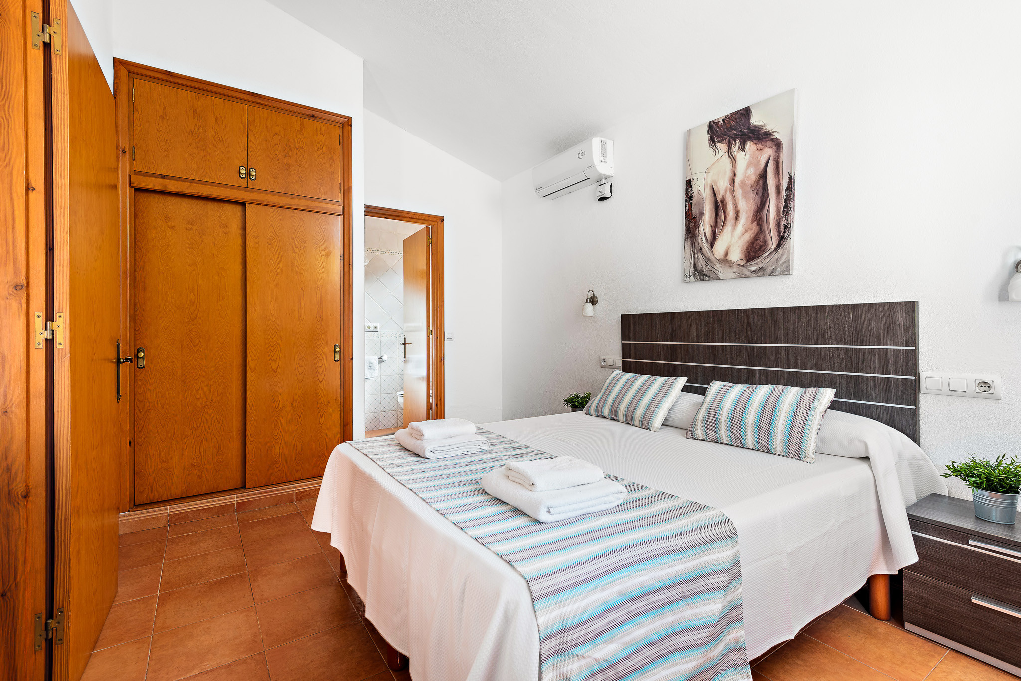 It consists of three air-conditioned bedrooms, one of them with a double bed and an en-suite bathroom with a bathtub, and two other double bedrooms with two beds each, and they share a bathroom with a bathtub.