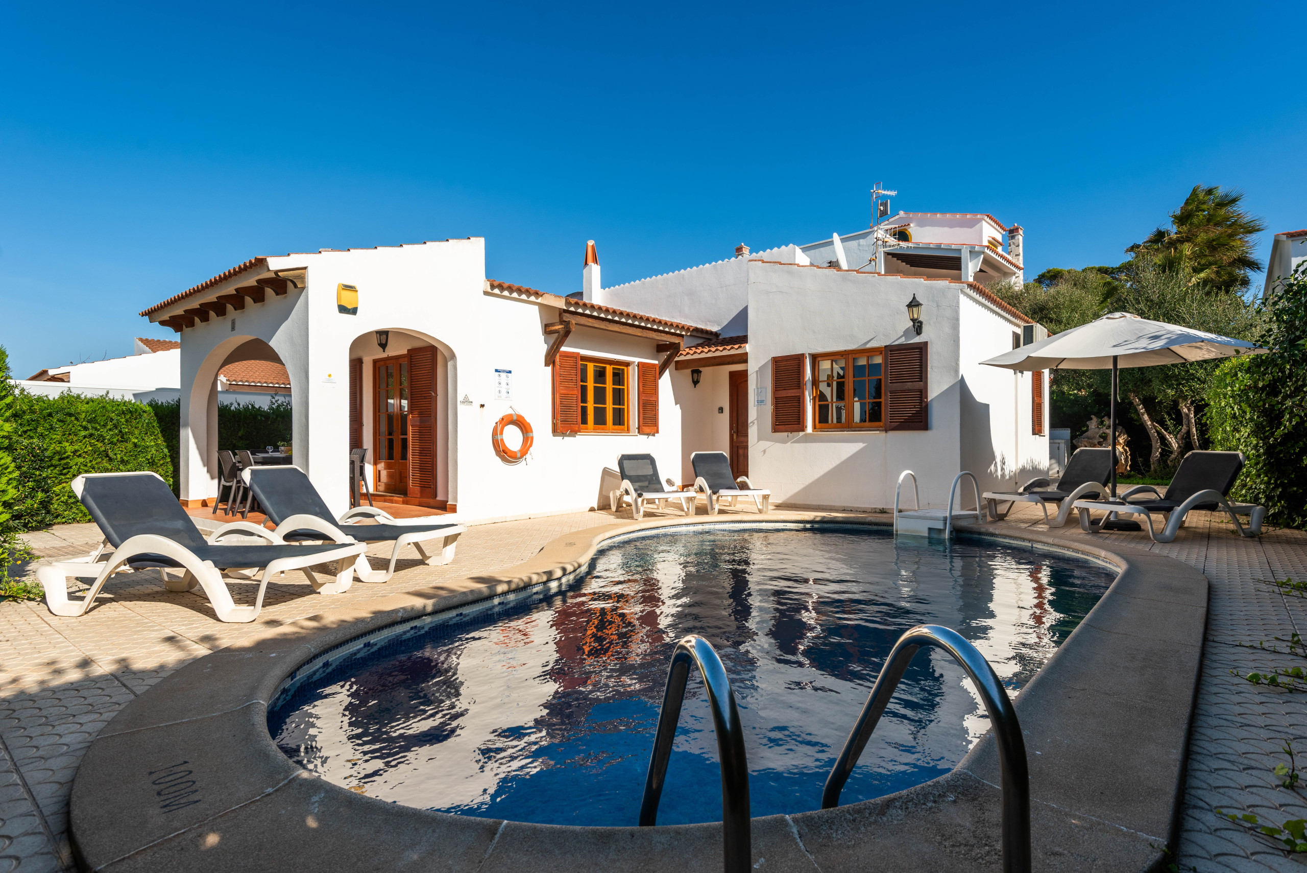 The villa consists of a living room with a TV with digital channels, a dining room with a kitchen with breakfast bar. The kitchen with refrigerator, electric oven, microwave, toaster, kettle and the kitchen utensils. Outside we find a private pool with covered terrace with table and chairs. Built-in barbecue and solarium with sunbeds.
