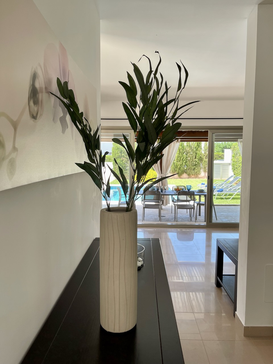 In the outdoor area of the property, we have a beautiful garden surrounding the house. On one side of the house, we find the built-in BBQ. And next to the outdoor terrace is the swimming pool with 8 sun loungers and a table and chair set.
