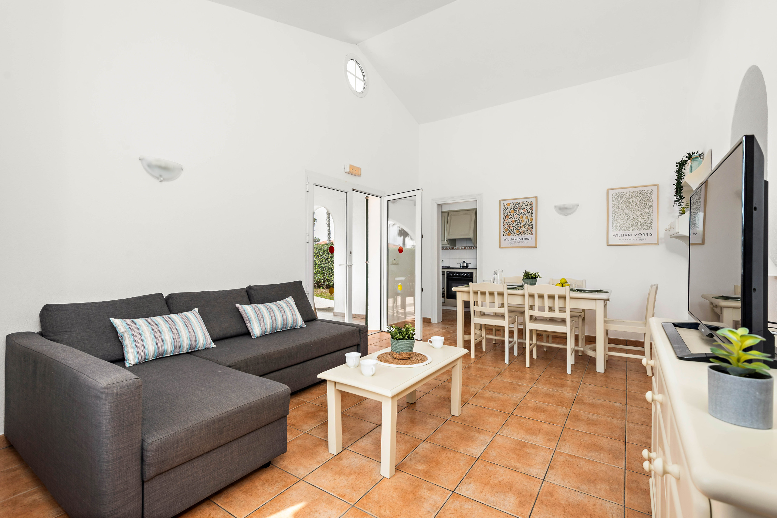 Villa on the ground floor in which we find the following rooms: Living room with direct access to the outdoor terrace and at the same time with access to the kitchen. It has a comfortable sofa, TV with foreign channels, free Wi-Fi for customers.