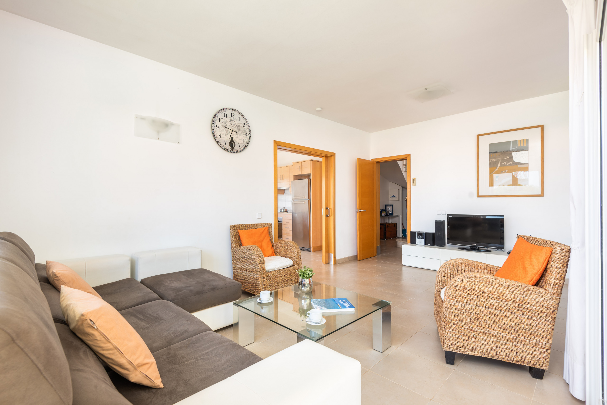 The living room is spacious and bright, furnished with a sofa and armchairs, satellite TV, and free Wi-Fi. It also offers direct access to the outdoor area, creating the perfect setting for relaxing or socialising.